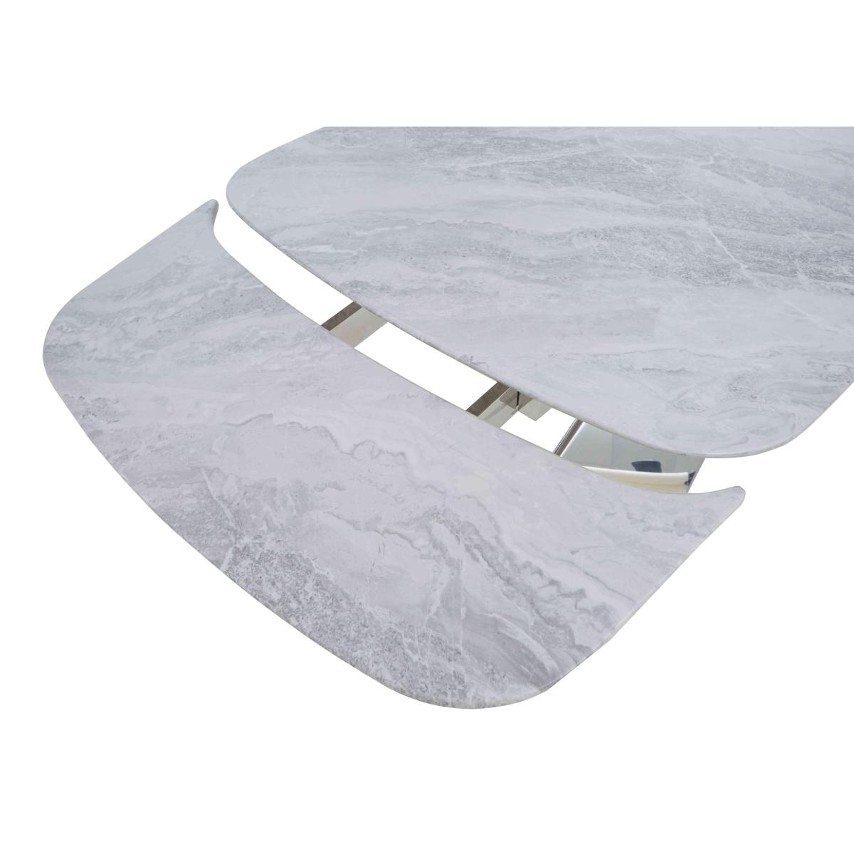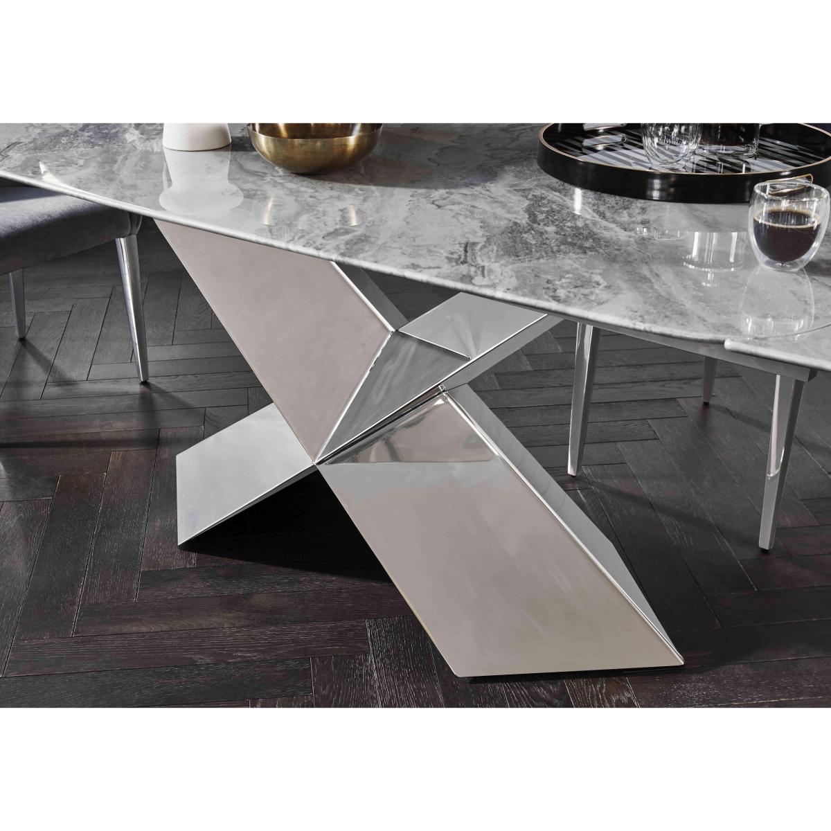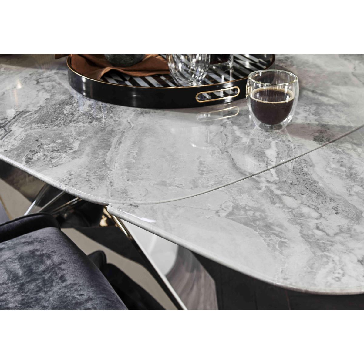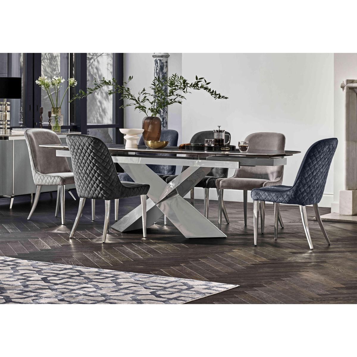 Showstopping dining room style has a new name – Gabana. Combining real marble with a high-gloss veneer finish and polished stainless steel, the collection’s aesthetic is both elegant and striking. And the details are equally impressive. The dining table’s extension leaves will always seamlessly match the marble patterning of the table top. The dining chairs are upholstered in the softest of velvets. And the tables’ X-shaped stainless steel bases are like nothing you've seen before. As well as two sizes of extending dining table, the Gabana range includes dining chairs, occasional tables, a sideboard and a wide choice of dining sets. Gabana is exclusively available at Furniture Village. If you’re looking for an extending dining table that really brings the wow factor, our Gabana table is it. From its real marble and high-gloss veneer top to its polished stainless steel base, nothing comes close. In two sizes. Why you'll love it This gorgeous extending dining table is simply stunning. The last word in showstopping style. Space-saving extending dining table. Beautiful real marble top with a high-gloss veneer finish. A special process ensures that the surface is perfectly patterned. Extension leaves perfectly match the table top for a flawless finish. Polished stainless steel frame and X-shaped base is so striking. In 2 sizes. A Furniture Village exclusive. This extending dining table is part of the Gabana range. What you need to know Small dining table seats 6, and 8 when extended. Large dining table seats 8, and 10 when extended. As a soft stone, marble can be susceptible to chips, stains, cracks, scratches and discolouration, so it’s important to care for it properly. Spillages need to be removed immediately. To clean, wipe gently with a damp cloth using warm water, then buff dry. We recommend that you use coasters and placemats to protect against heat and moisture. Do not use knives to cut food on a marble table top, use as a work top, place heavy weights on the table or use acidic or abrasive cleaners. You should never sit or stand on a marble surface. For more advice on caring for your marble furniture, see our Dining care guide. Browse the Gabana range for dining sets, chairs, living room tables and a sideboard.