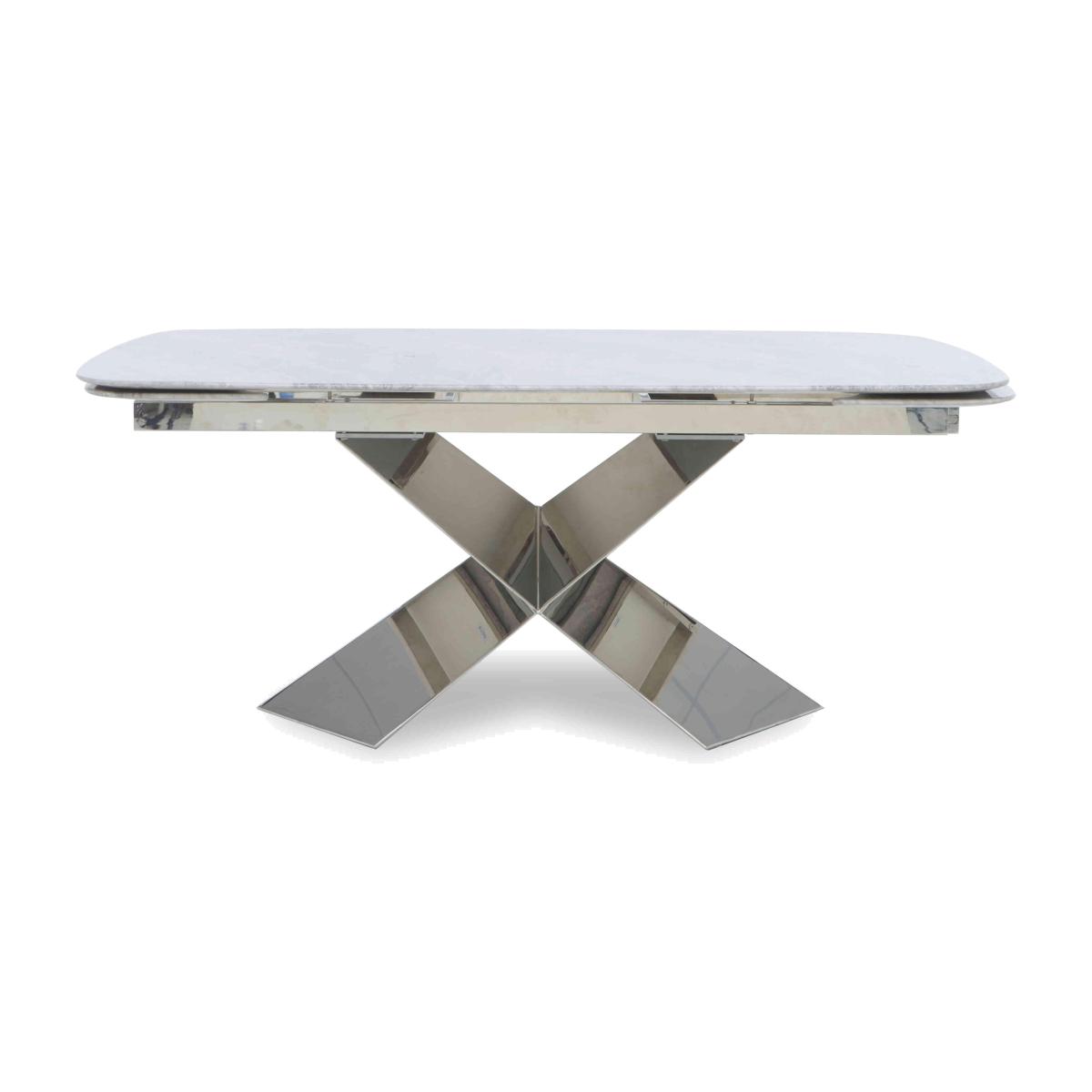 Showstopping dining room style has a new name – Gabana. Combining real marble with a high-gloss veneer finish and polished stainless steel, the collection’s aesthetic is both elegant and striking. And the details are equally impressive. The dining table’s extension leaves will always seamlessly match the marble patterning of the table top. The dining chairs are upholstered in the softest of velvets. And the tables’ X-shaped stainless steel bases are like nothing you've seen before. As well as two sizes of extending dining table, the Gabana range includes dining chairs, occasional tables, a sideboard and a wide choice of dining sets. Gabana is exclusively available at Furniture Village. If you’re looking for an extending dining table that really brings the wow factor, our Gabana table is it. From its real marble and high-gloss veneer top to its polished stainless steel base, nothing comes close. In two sizes. Why you'll love it This gorgeous extending dining table is simply stunning. The last word in showstopping style. Space-saving extending dining table. Beautiful real marble top with a high-gloss veneer finish. A special process ensures that the surface is perfectly patterned. Extension leaves perfectly match the table top for a flawless finish. Polished stainless steel frame and X-shaped base is so striking. In 2 sizes. A Furniture Village exclusive. This extending dining table is part of the Gabana range. What you need to know Small dining table seats 6, and 8 when extended. Large dining table seats 8, and 10 when extended. As a soft stone, marble can be susceptible to chips, stains, cracks, scratches and discolouration, so it’s important to care for it properly. Spillages need to be removed immediately. To clean, wipe gently with a damp cloth using warm water, then buff dry. We recommend that you use coasters and placemats to protect against heat and moisture. Do not use knives to cut food on a marble table top, use as a work top, place heavy weights on the table or use acidic or abrasive cleaners. You should never sit or stand on a marble surface. For more advice on caring for your marble furniture, see our Dining care guide. Browse the Gabana range for dining sets, chairs, living room tables and a sideboard.