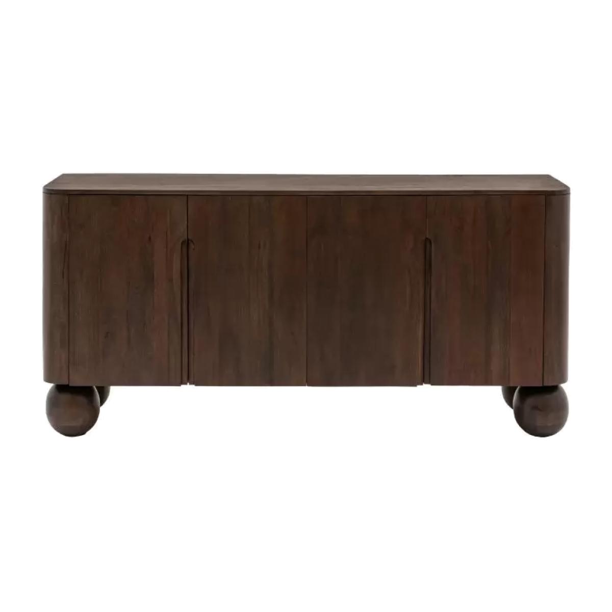 This eye-catching sideboard is crafted using mango wood solids with a rich deep finish. The front corners of the sideboard are gently curved with the elegant slim cut-out handles on the doors curving at the top to echo this. Turned ball feet complete the look to create this dramatic retro piece. Coordinating items are available. Material:Mango Wood 100%. Colour/Finish: Dark Wood.