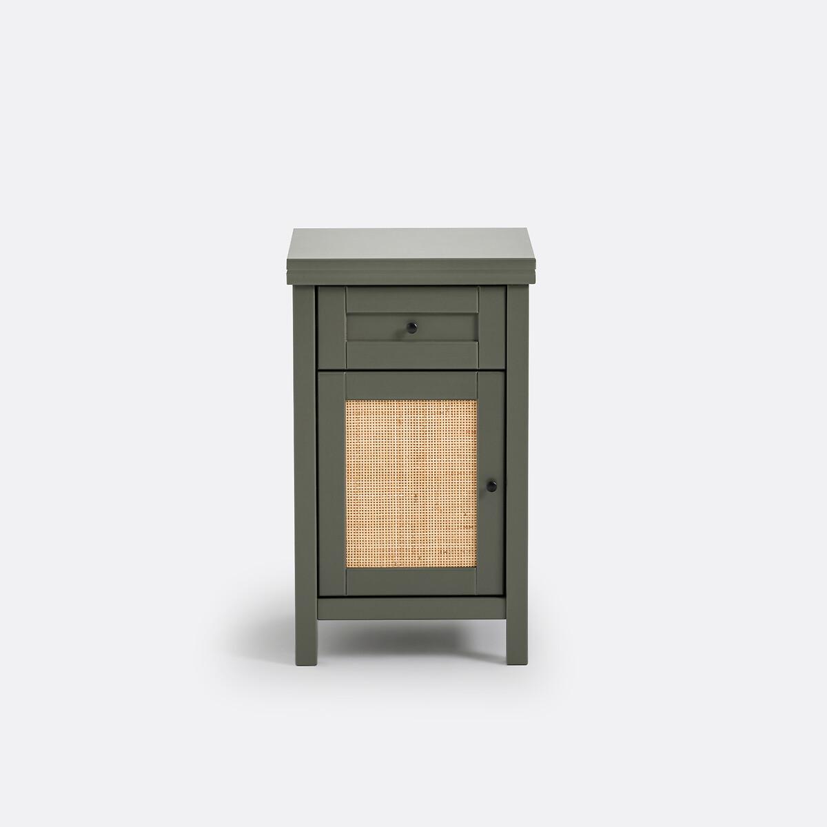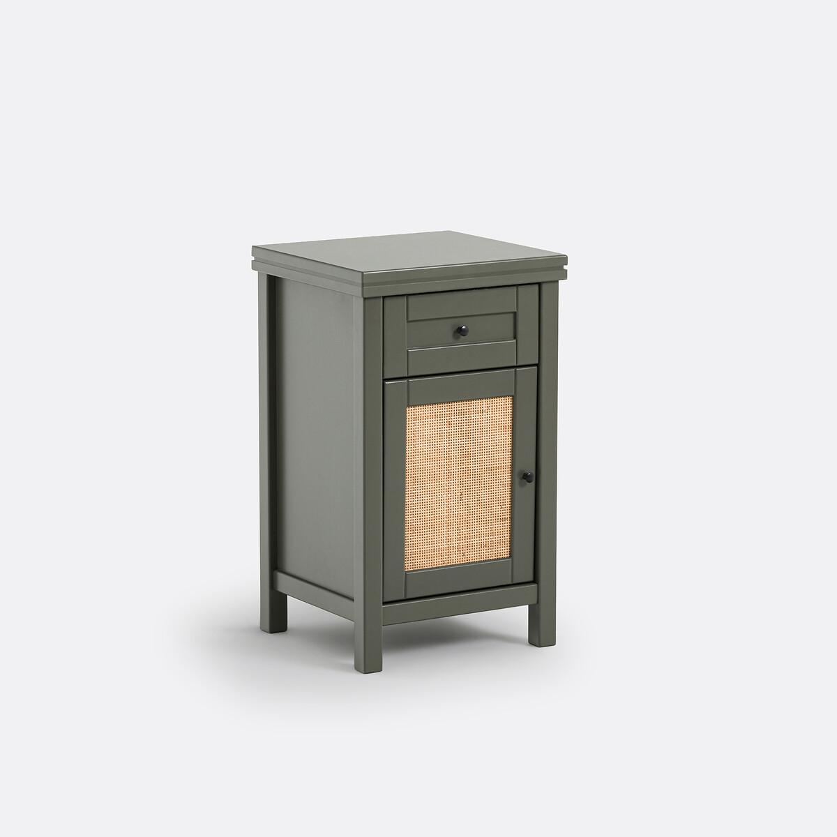 The Gaban 1 drawer, 1 cupboard bedside table. This bedside table has a classic, rustic look with its wood and rattan cane frontage, and has plenty of storage space thanks to its drawer and cupboard. Product Details • 1 drawer + 1 reversible door with removable shelf inside (3 positions) • Solid oak, stained with slightly brushed finish, NC varnish finish • Rattan cane door • Metal button handlesDimensions. Total: • Width: 38cm • Height: 64cm • Depth: 35.5cm. Usable dimensions: • Drawer:L23.6 x H7.5 x D28.8 cm • Compartment:L29 x H34.9 x D32.1 cmDelivery:. Assembly required. Available for home delivery. Note! Please check that all access points are large enough to accommodate your delivery (doors, stairs, lifts). • WOOD FROM SUSTAINABLY MANAGED FORESTS. FSC® certified wood comes from forests that are environmentally, socially and economically well managed. Dimensions and weight of package:1 parcel • L70.8 x H45.4 x D22.5 cm. 16.4kg