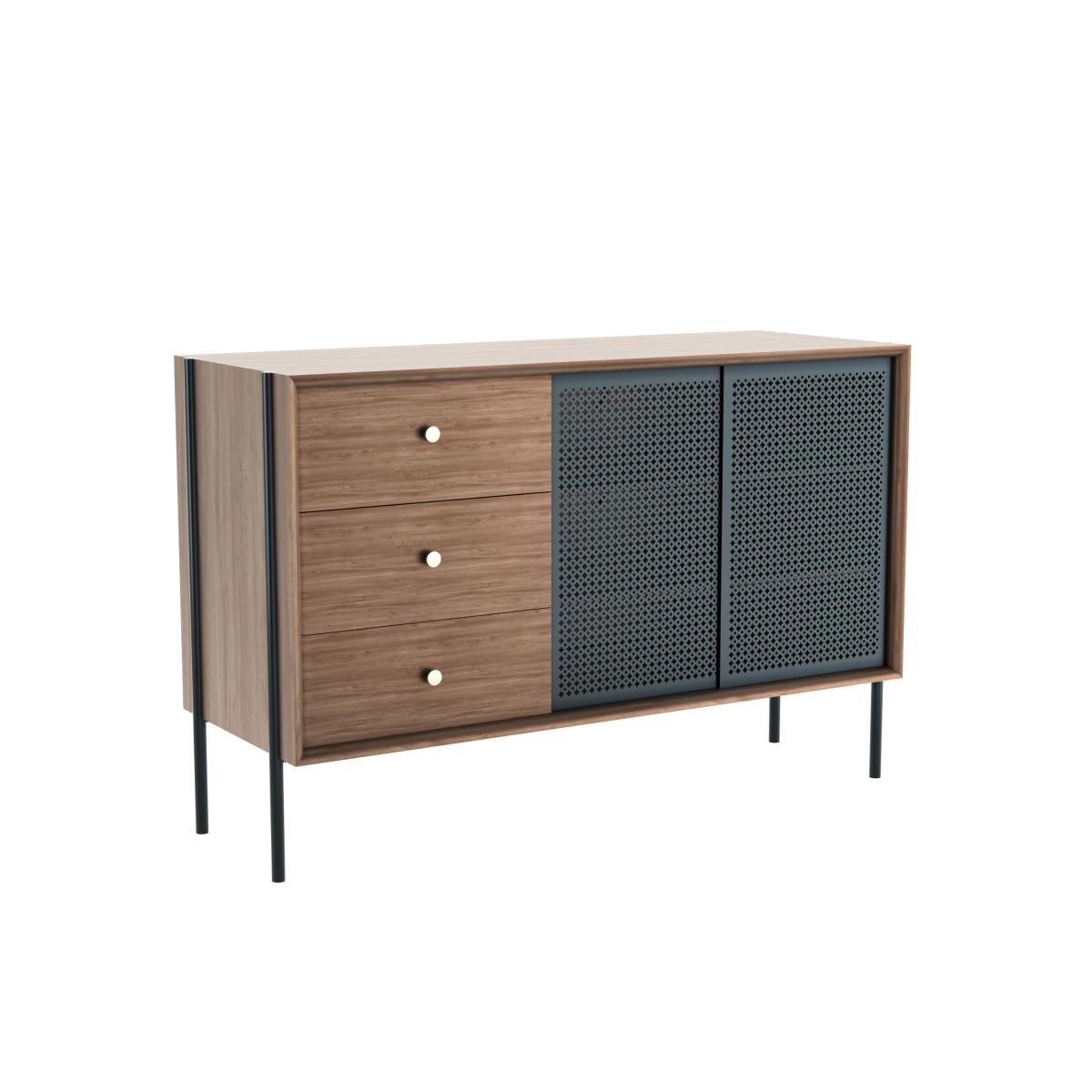 An inspired mix, between retro spirit and modern style for this superb buffet that combines wood and coloured metal. The walnut block includes 2 perforated metal sliding doors with a pattern inspired by cane-work. Close up, the micro-perforations create a graphic, delicate, aerial effect. From afar, it creates a surprising optical effect, ethereal and vibrating! This dresser also includes 3 walnut drawers embellished with pretty round golden brass handles. The drawer unit is removable: it can be placed on the left or right (it is fitted on the left for delivery). The stylish detail: the painted wooden legs rise up to the two side walls, creating charcoal grey stripes which enclose the walnut panels. Inside the dresser are two compartments with two shelves in each.