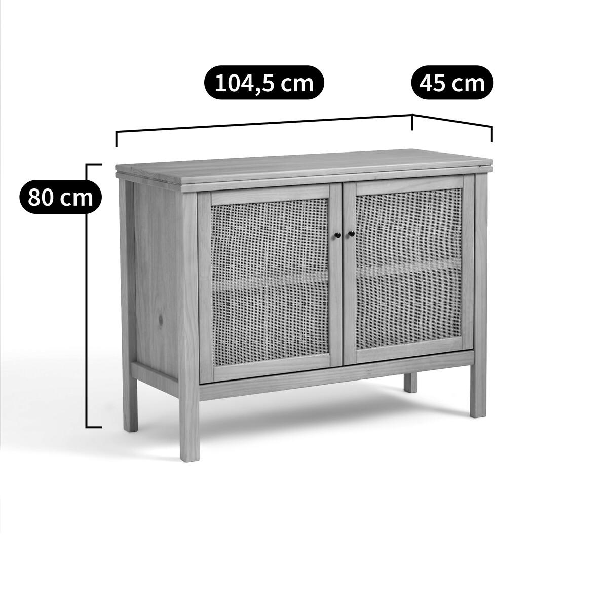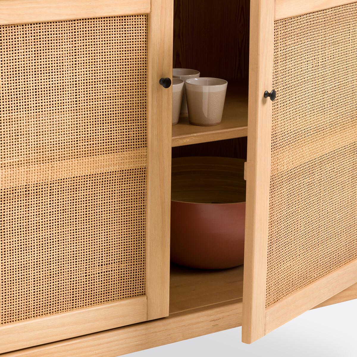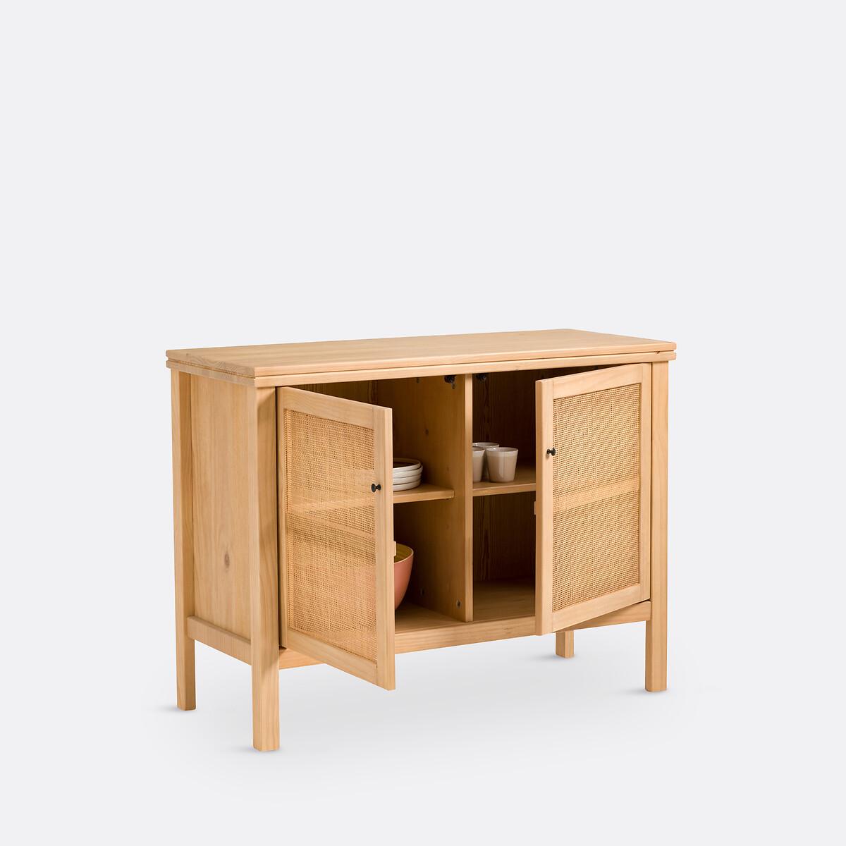 . Lightly brushed solid pine + caning = successful take on a 2-door sideboard; a piece of furniture with character! Dishes, papers, linens? Designed by La Redoute Interiors. Product Details • In lightly brushed solid pine, oak stained finish, nitrocellulose varnish • 2 rattan doors • 1 vertical divider • 2 removable and adjustable shelves in 3 positions • 4 compartments • Aged metal handles • Furniture base in MDF with wood decorDimensions. Overall • Width: 104.5cm • Height: 80cm • Depth: 45cm. Usable space • Compartments (useful size, excluding shelf): L45 x H54 x D39.4cm • Feet height, 17cmDelivery:. Assembly required. Available for home delivery. Note! Please check that all access points are large enough to accommodate your delivery (doors, stairs, lifts). • WOOD FROM SUSTAINABLY MANAGED FORESTS. FSC® certified wood comes from forests that are environmentally, socially and economically well managed. Dimensions and weight of parcel1 parcel • L55.5 x H116 x D25.8cm. 28kg