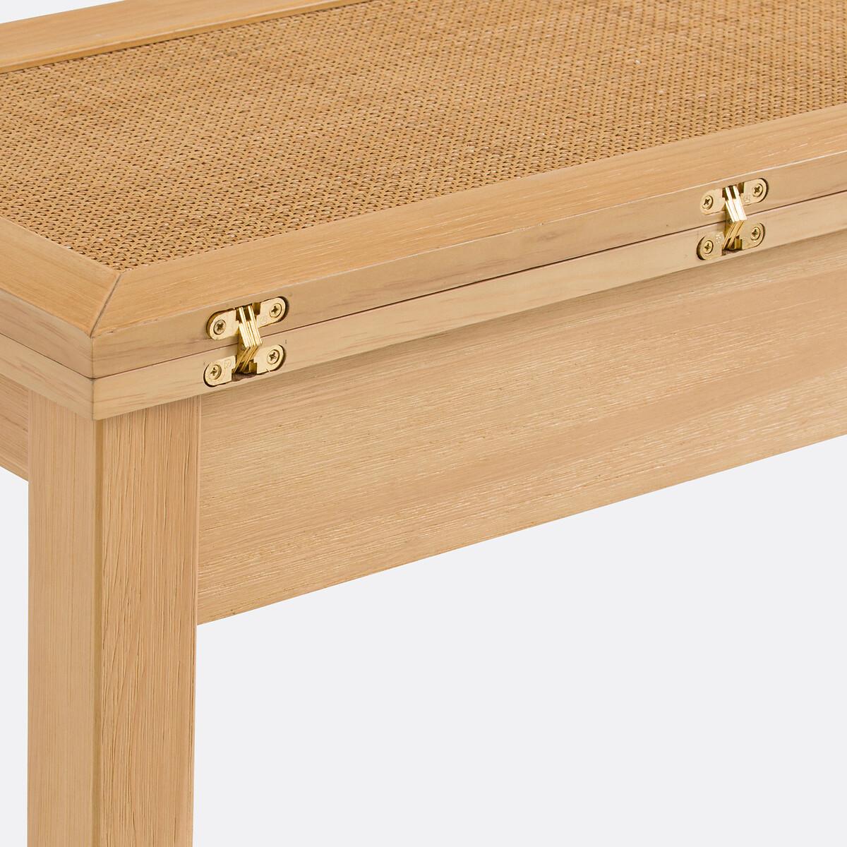 The helpful Gabin console is part of our Les Ingénieux collection. Creations full of ideas to make life simpler and everyday life more beautiful, imagined by our designers in France.. Combining lightly brushed pine and canework, the Gabin console displays a simple design mixed with a neo-rustic style. Clever, it unfolds to become a table. To be able to sit down without being cluttered. Why you'll love it. Dinner for 2, 3 or 4: the top unfolds to transform the console into a table in the snap of a finger. Ideal for any home. Product Details • Console converts into a table for 2 to 4 people • Lightly brushed solid FSC® pine legs • Top in oak-stained pine veneered MDF • Braided canework on the top, visible in console versionDimensions. Console shape • Width: 130cm • Height: 77cm • Depth: 40cm. Table shape • Width: 130cm • Height: 77cm • Depth: 80cmDelivery:. This product is sold ready to assemble. Note! Please check that all access points are large enough to accommodate your delivery (doors, stairs, lifts). • WOOD FROM SUSTAINABLY MANAGED FORESTS. FSC® certified wood comes from forests that are environmentally, socially and economically well managed. Dimensions and weight of parcel1 parcel • L142 x H21.5 x D50cm. 23.6kg