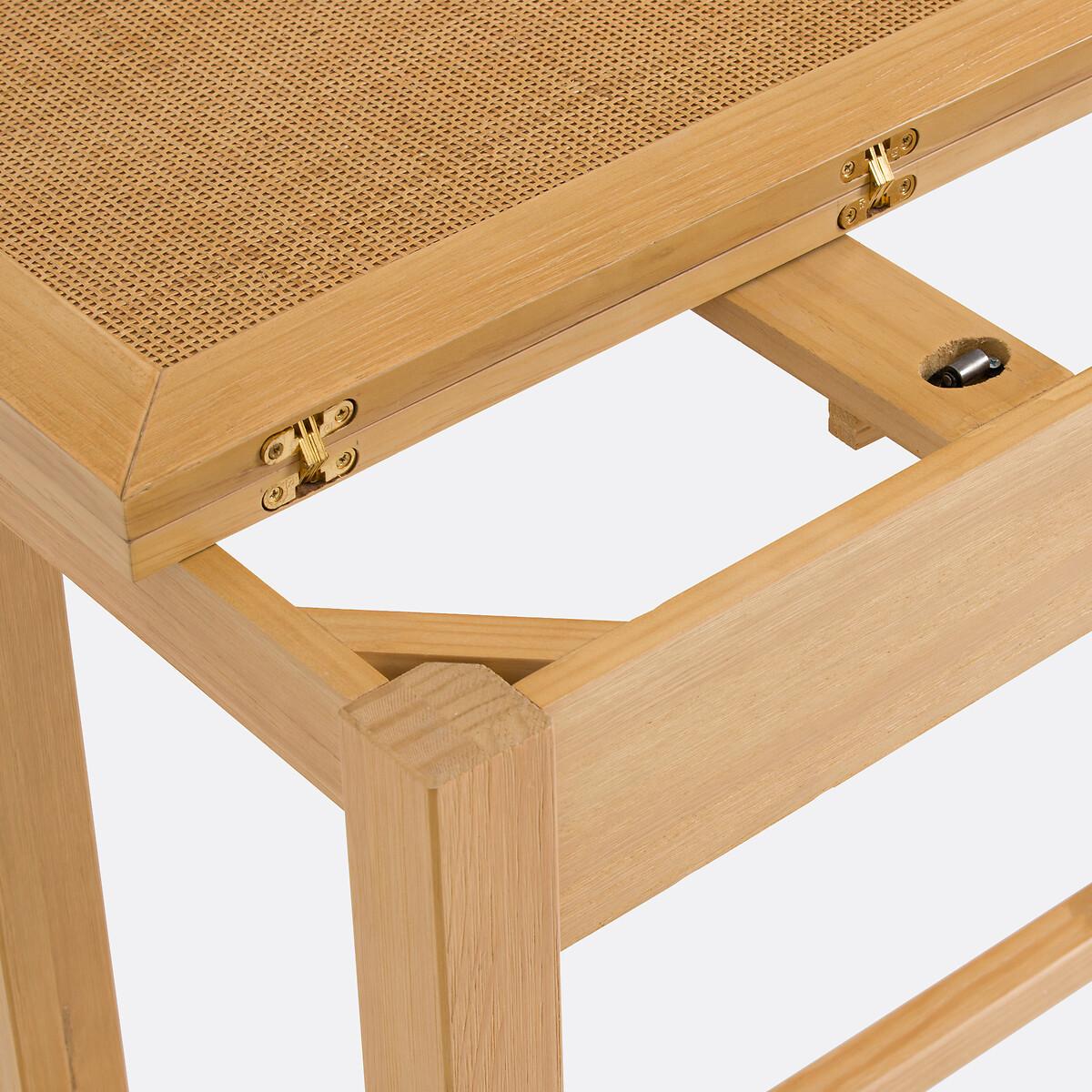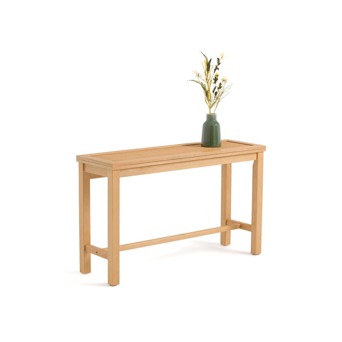 The helpful Gabin console is part of our Les Ingénieux collection. Creations full of ideas to make life simpler and everyday life more beautiful, imagined by our designers in France.. Combining lightly brushed pine and canework, the Gabin console displays a simple design mixed with a neo-rustic style. Clever, it unfolds to become a table. To be able to sit down without being cluttered. Why you'll love it. Dinner for 2, 3 or 4: the top unfolds to transform the console into a table in the snap of a finger Ideal for any home:Product Details • Console converts into a table for 2 to 4 people • Lightly brushed solid pine legs. • Top in oak-stained pine veneered MDF • FSC® Mixed certified wood • Braided canework on the top, visible in console versionDimensions. Console shape • Width: 130cm • Height: 77cm • Depth: 40cm. Table shape • Width: 130cm • Height: 77cm • Depth: 80cmDelivery:. Assembly required. Available for home delivery. • WOOD FROM MORE SUSTAINABLY MANAGED FORESTS AND CONTROLLED SOURCES. FSC® Mix wood contains at least 70% FSC® certified and/or recycled wood, the remainder being FSC® controlled wood. Dimensions and weight of parcel1 parcel • L142 x H21.5 x D50cm. 23.6kg