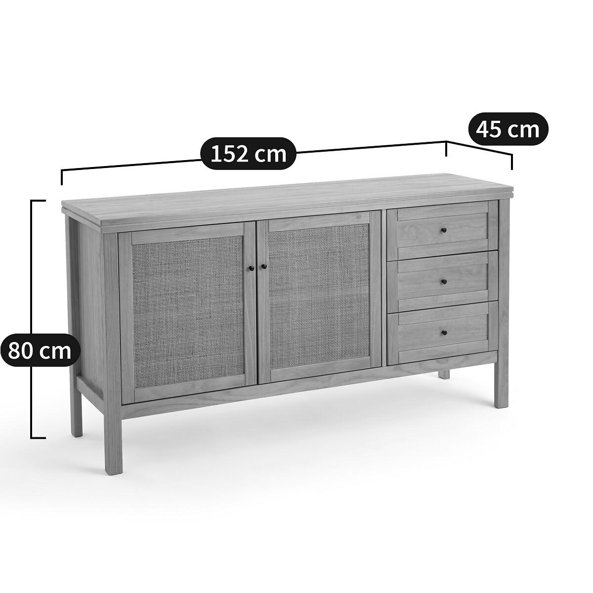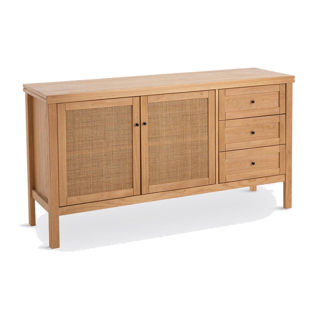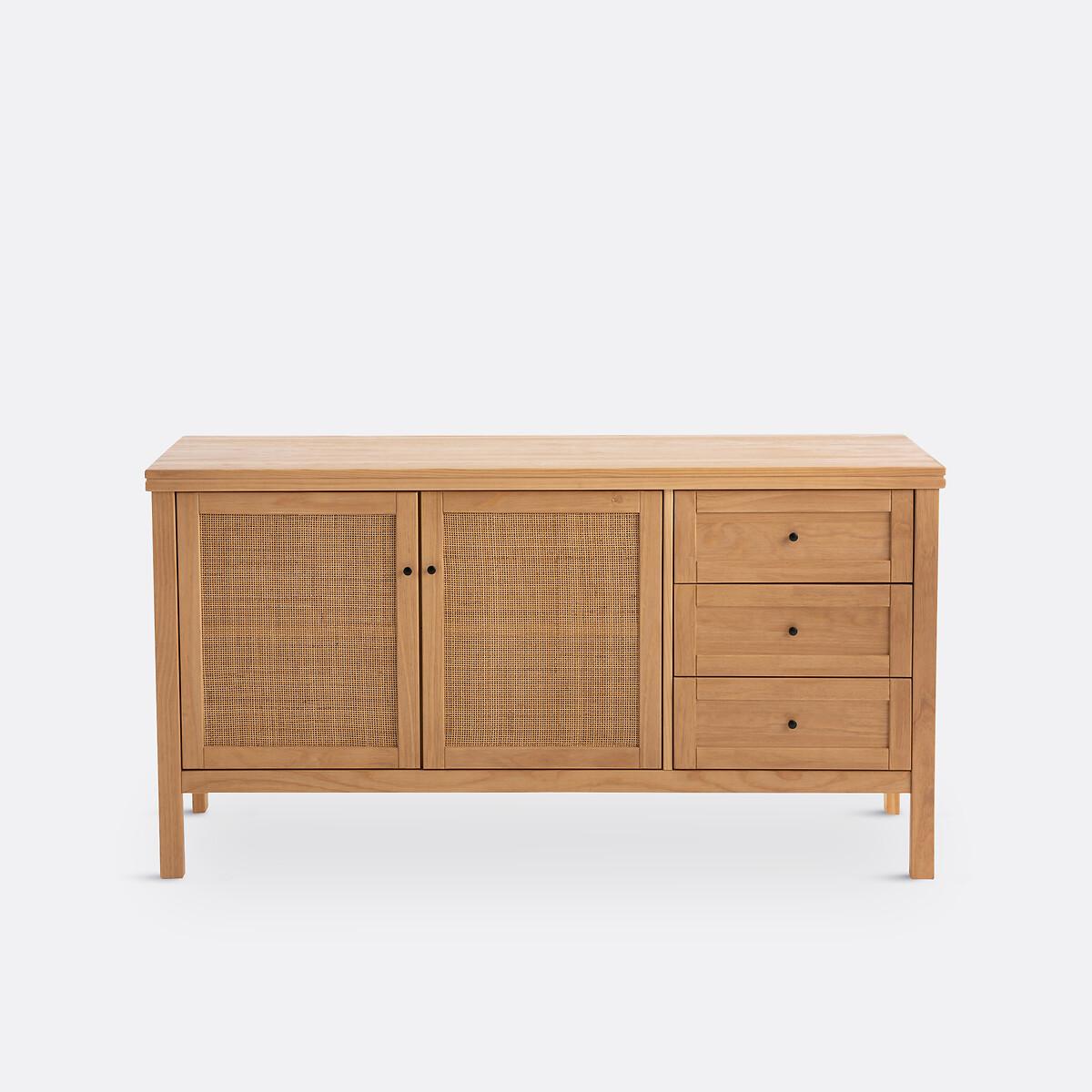 The Gabin pine and rattan sideboard. The collection of Gabin furniture is inspired by Scandinavian design's use of pine, combined with the vintage touch of rattan cane for unique pieces. Product Details • In lightly brushed solid pine, stained oak finish, acrylic varnish • 2 rattan doors • 2 removable and adjustable shelves in 3 positions • 4 compartments • 3 drawers • Aged metal handlesDimensions. Overall • Width: 152cm • Height: 80cm • Depth: 45cm. Usable space. Compartments (without shelves): • Length 46 cm • Height 55cm • Depth 35cm. Drawers : • Length 40cm • Height 10cm • Depth 34cmDelivery:. This product is sold for self-assembly. Note! Please check that all access points are large enough to accommodate your delivery (doors, stairs, lifts). • WOOD FROM MORE SUSTAINABLY MANAGED FORESTS AND CONTROLLED SOURCES. FSC® Mix wood contains at least 70% FSC® certified and/or recycled wood, the remainder being FSC® controlled wood. Dimensions and weight of parcels2 parcels • L68 x H24 x D56cm. 17kg. • L162 x H19 x D53cm. 30kg.