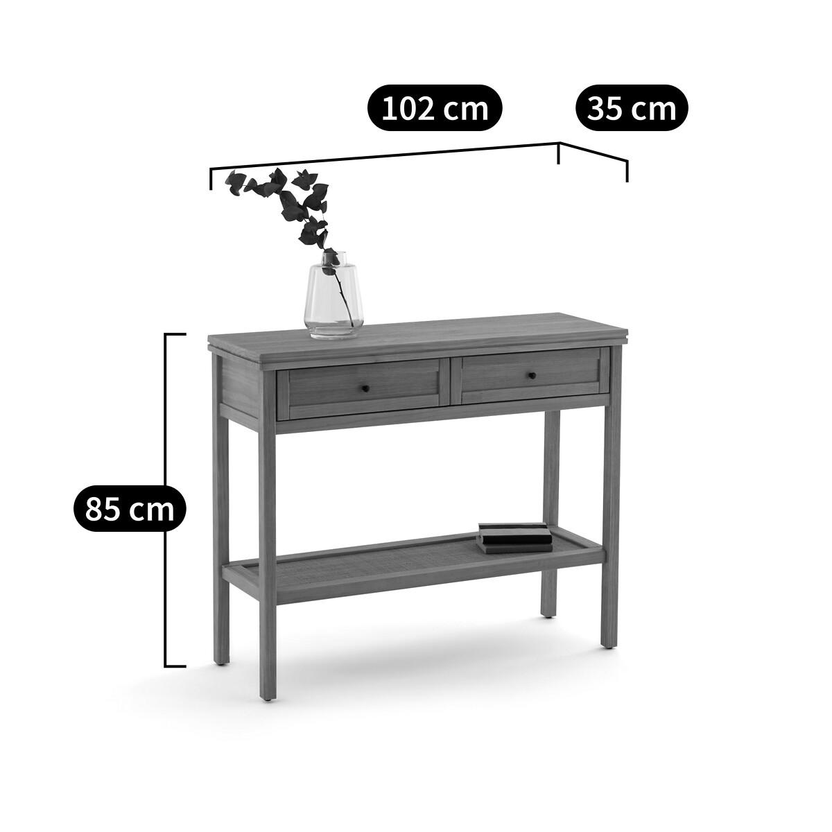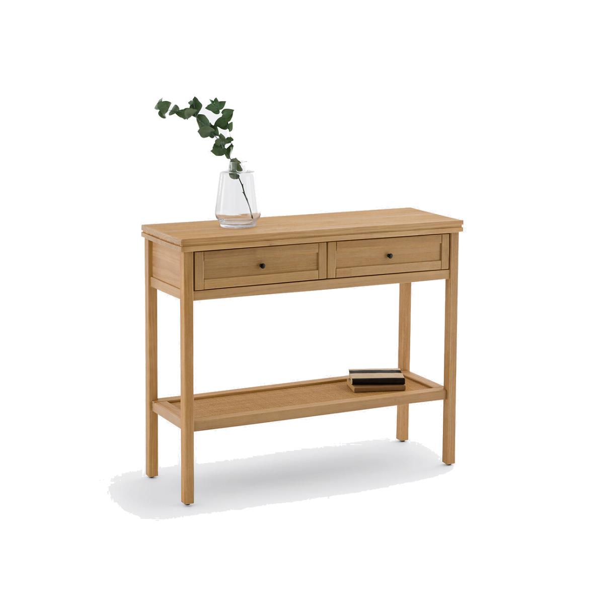 . The Gabin range combines lightly brushed FSC® Mixed solid pine with chic and on-trend canework.. Designed by La Redoute Interiors. Product Details • In solid pine, lightly brushed, oak stained finish, nitrocellulose varnish • 2 tiers: solid upper level, lower level veneered with canework • 2 pine sliding drawers • FSC® Mixed certified wood • Polypropylene glides. Dimensions • Width: 102cm • Height: 85cm • Depth: 35cm. Usable dimensions: • Bottom tier:L88.5 x 22cm • Drawers : L39 x H8 x D23.5cm • Useful height between lower shelf and drawers: 38cm • Height of legs : 22.5cmDelivery:. This product is sold ready to assemble. • WOOD FROM MORE SUSTAINABLY MANAGED FORESTS AND CONTROLLED SOURCES. FSC® Mix wood contains at least 70% FSC® certified and/or recycled wood, the remainder being FSC® controlled wood. Dimensions and weight of parcel1 parcel • L116 x H20.4 x D47cm. 21.4kg.