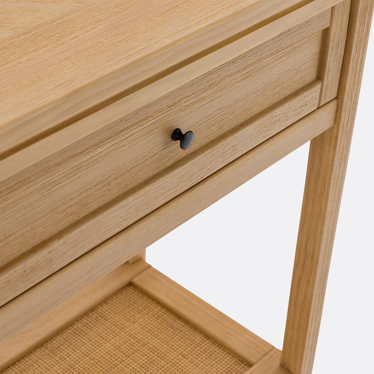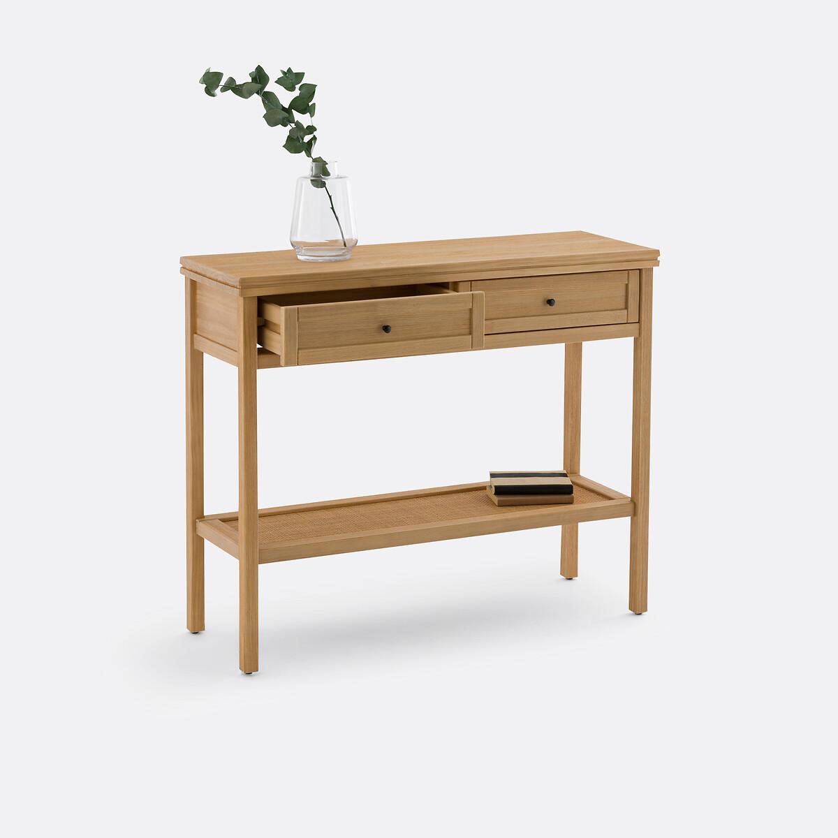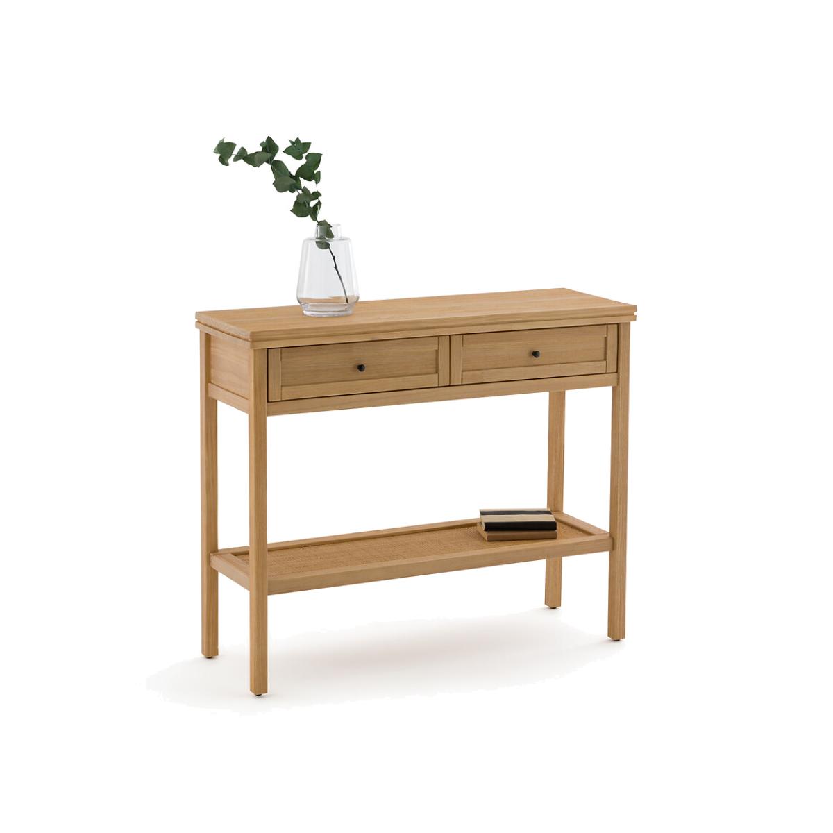 . The Gabin range combines lightly brushed FSC® Mixed solid pine with chic and on-trend canework.. Designed by La Redoute Interiors. Product Details • In solid pine, lightly brushed, oak stained finish, nitrocellulose varnish • 2 tiers: solid upper level, lower level veneered with canework • 2 pine sliding drawers • FSC® Mixed certified wood • Polypropylene glides. Dimensions • Width: 102cm • Height: 85cm • Depth: 35cm. Usable dimensions: • Bottom tier:L88.5 x 22cm • Drawers : L39 x H8 x D23.5cm • Useful height between lower shelf and drawers: 38cm • Height of legs : 22.5cmDelivery:. This product is sold ready to assemble. • WOOD FROM MORE SUSTAINABLY MANAGED FORESTS AND CONTROLLED SOURCES. FSC® Mix wood contains at least 70% FSC® certified and/or recycled wood, the remainder being FSC® controlled wood. Dimensions and weight of parcel1 parcel • L116 x H20.4 x D47cm. 21.4kg.