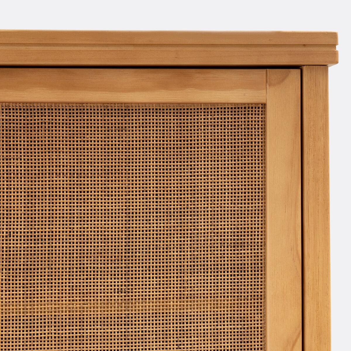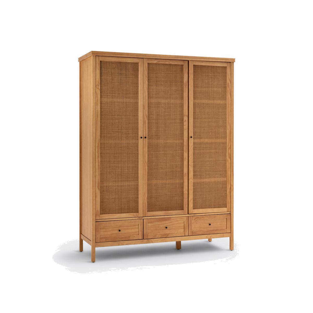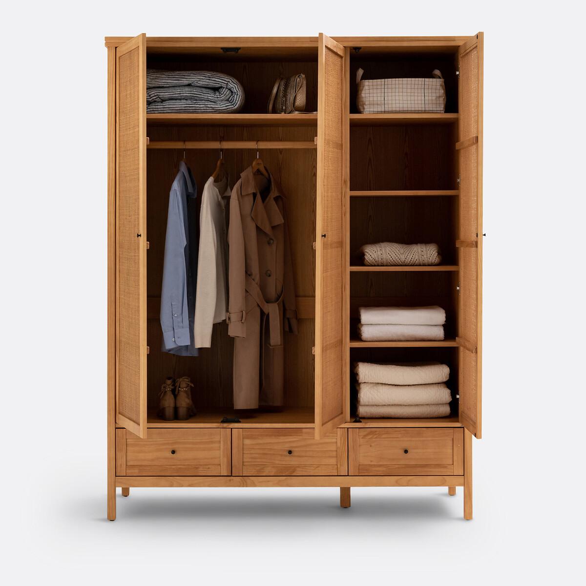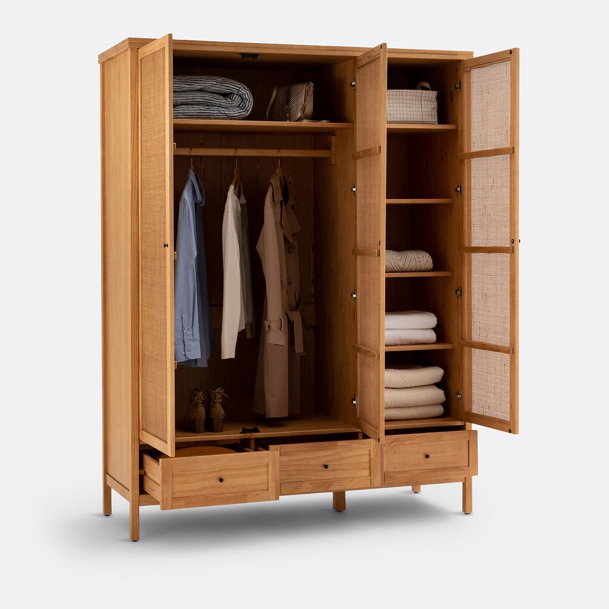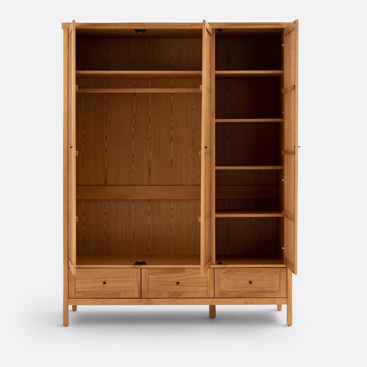 This range of solid pine and rattan furniture offers plenty of storage space with a charming, family feel. Designed by La Redoute Interiors. Product Details • Structure and drawers in lightly brushed, oak-stained solid pine, nitrocellulose varnish finish • Front of the doors in openwork cane with a natural finish • Aged-effect black metal handles • 3 doors and 3 drawers • On the left: 2 doors with 1 transverse shelf at the top + 1 hanging rail • On the right: 1 door, 4 shelvesDimensions. Overall • Length: 153.4 cm • Height: 200.5cm • Depth: 57cm. Usable space • Drawers :L40.8 x H11.7 x D43.8cm • Transverse shelf: L96.4 x H27.5 x D50 cm • 4 Shelves on the Right:L47.8 x H27.5 x D50 cm. Delivery: • Assembly required. Available for home delivery. Note! Please check that all access points are large enough to accommodate your delivery (doors, stairs, lifts).Dimensions and weight of parcel3 parcels • L223.1 x H13 x D64.5 cm. 37.7kg. • L165.1 x H17 x D66 cm. 40.5kg. • L167.5 x H55.5 x D13.7 cm. 17.32 kg.