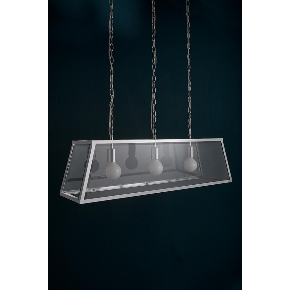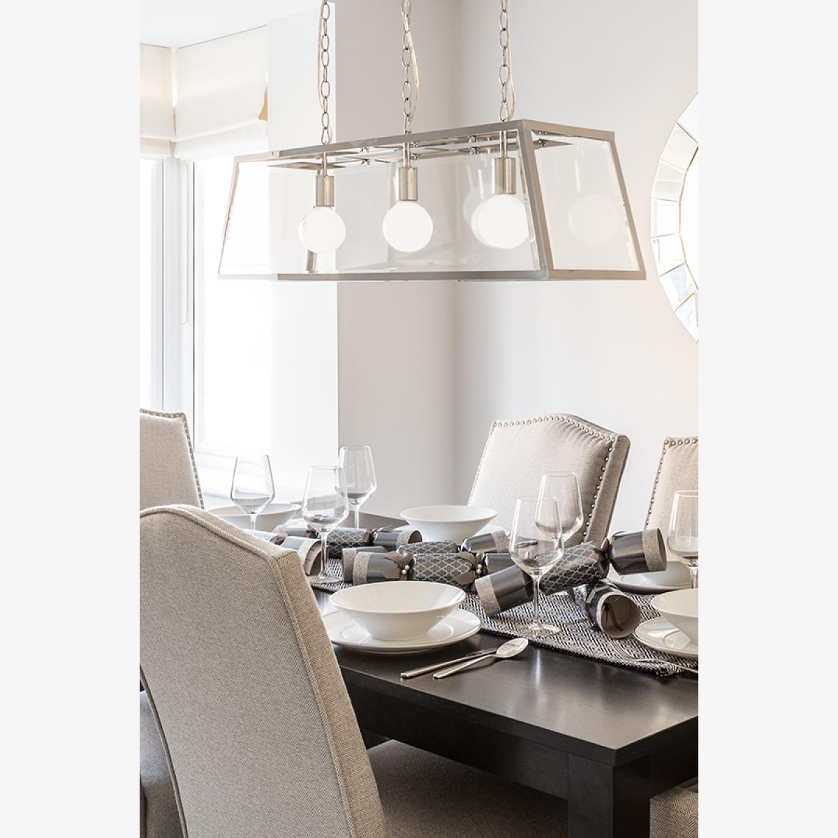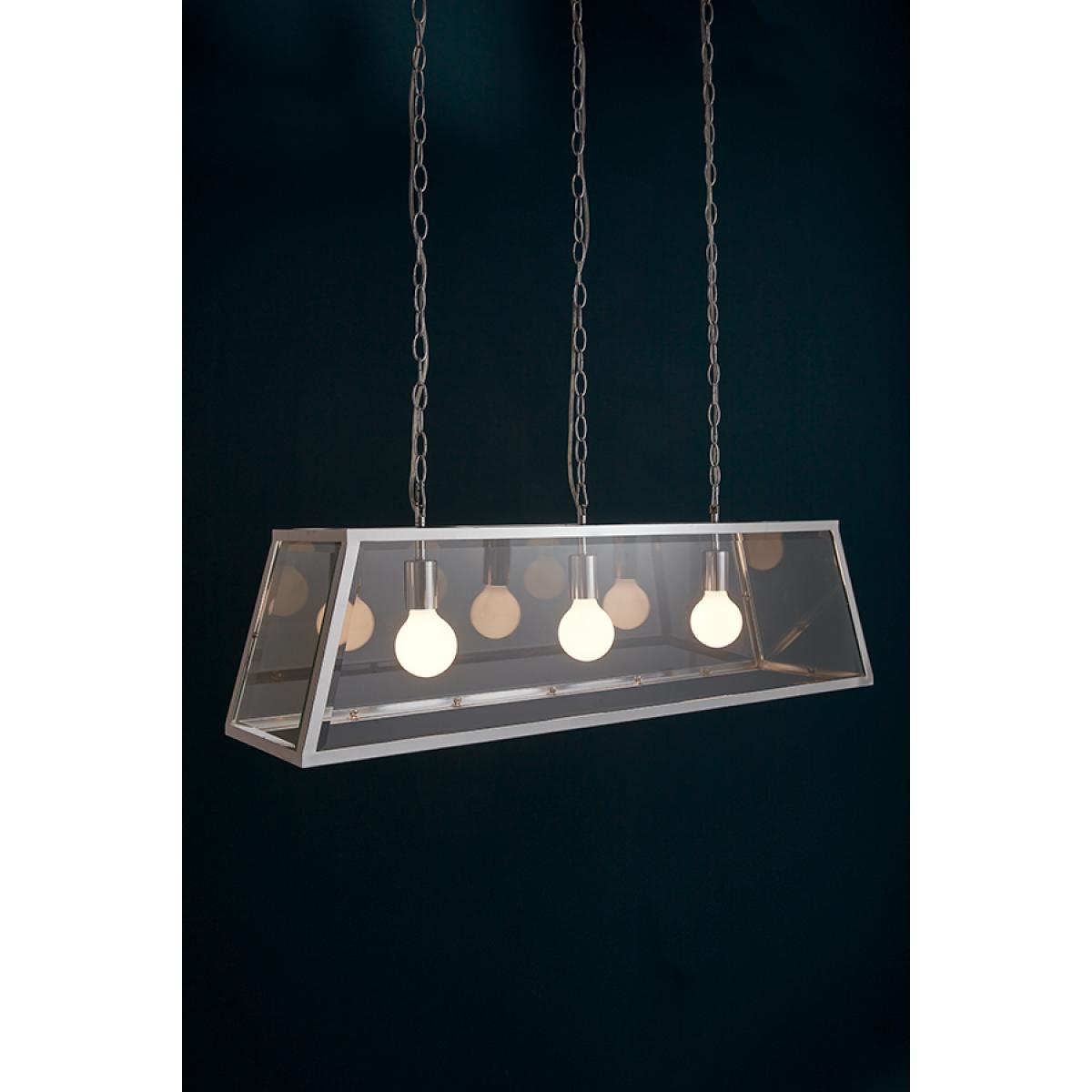 A distinctive and elegant pendant featuring fine,chrome finished metalwork. Ideal for creating a sophisticated, upmarket industrial look. Clear acrylic sheet. Perfect for use over rectangular dining tables in either contract or domestic situations. Complete with vintage style, exposed filament bulbs. Wattage: 60 W. Weight: 5 kg. Bulb type: E26/E27. Light Bulbs Included.