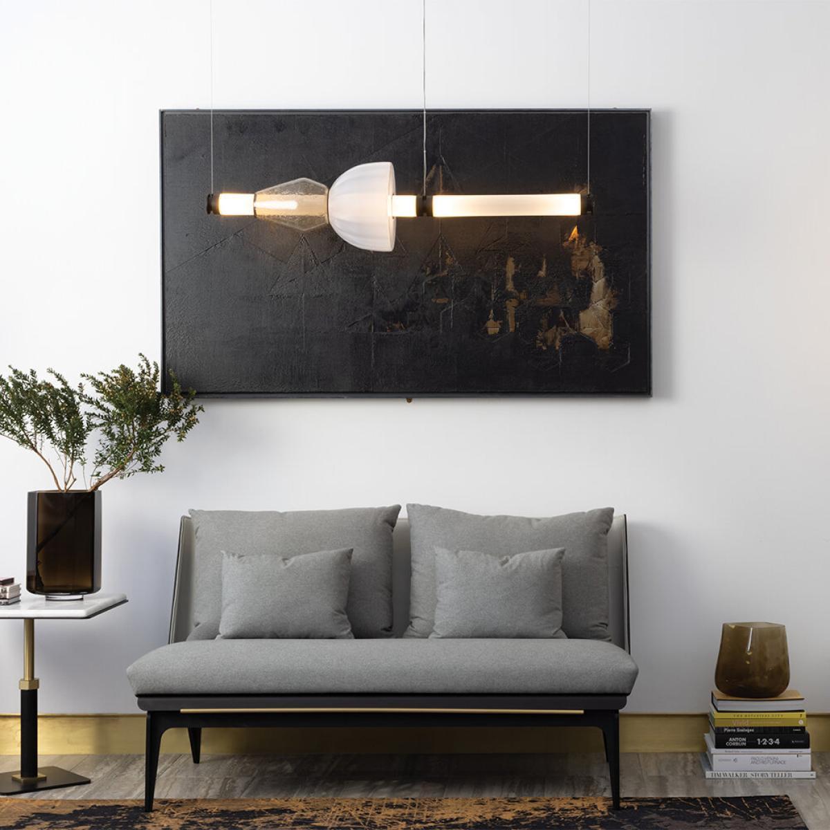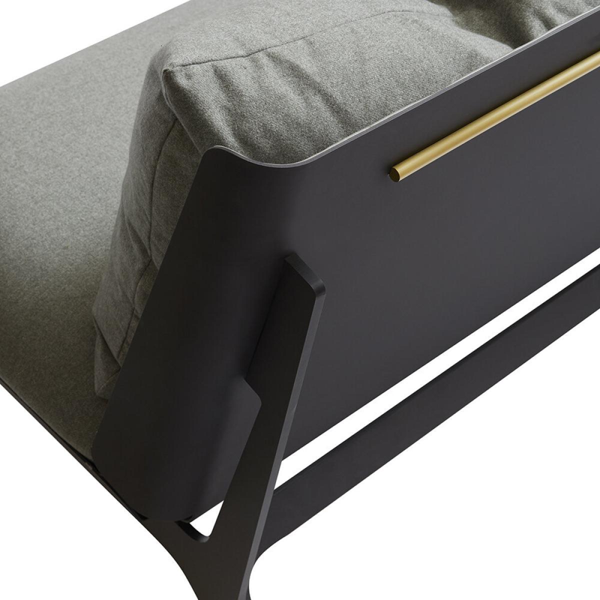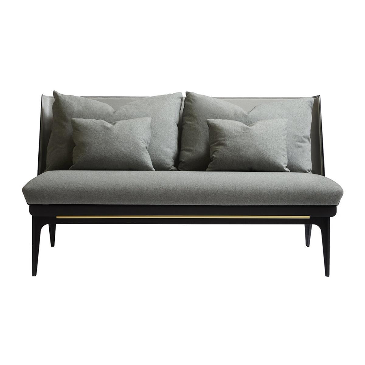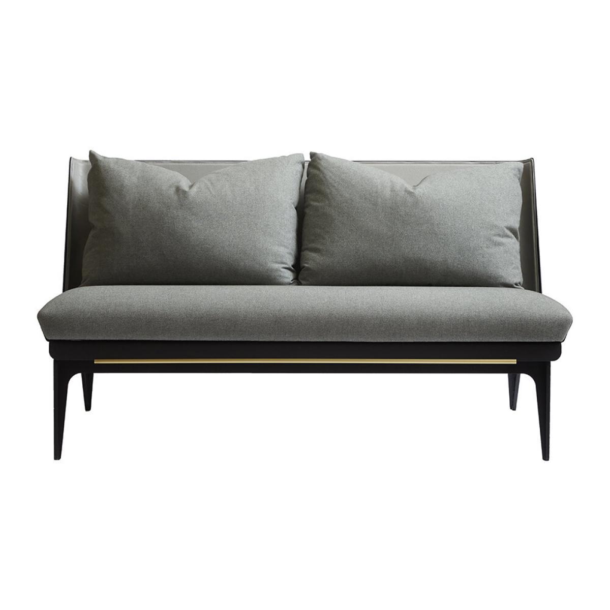Bring sleek style home with this Boudoir loveseat from Gabriel Scott. A classic silhouette reinterpreted; it features a black curved metal shell with brass hardware embellishments. With French pebbled leather lining, it's finished with plush tone-on-tone fabric cushions for a classic look that will fit seamlessly into your modern home. Pair with more furniture from Gabriel Scott to complete the look. Key features: * Material: steel, brass, vegan leather, fabric * Dimensions: H81xW148.6xD83cm * Seat height: 47cm * Sleek silhouette in black * French pebbled leather lining * With plush tone-on-tone fabric cushions * Brass hardware embellishments * More furniture available from Gabriel Scott