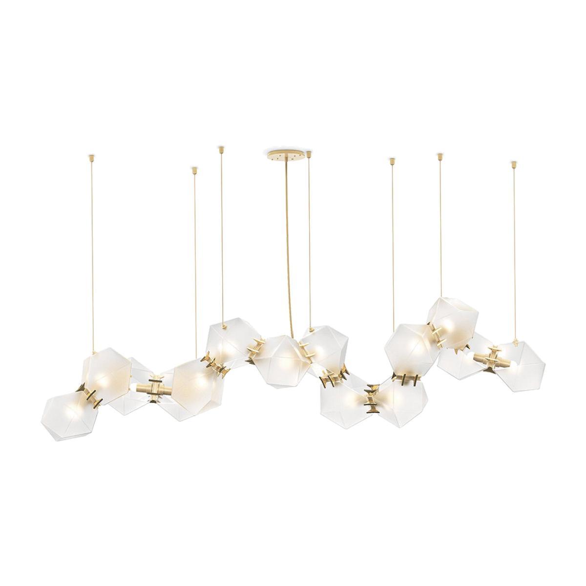 Inspired by the beauty of jewellery, the Welles Glass Chandelier is Gabriel Scott’s signature piece reinvented. Featuring a geometric and multifaceted shape, this striking light is made from frosted glass encased in satin metallic prongs. Sculpturally innovative, the Welles chandelier floats in the air emitting a cloud of soft light through its multifaceted silhouette.