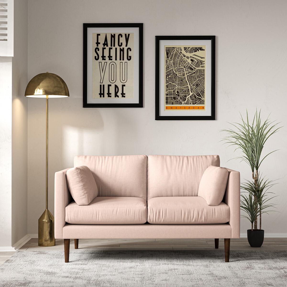 Minimalist design meets maximum comfort in the Gabriela. Beautiful in its simplicity, clean lines create a stylish square silhouette. Super-slim arms maximise seat space, supported by high sleek tapered legs. Relax amongst luxurious feather wrapped cushions knowing you've got Mid-century style sorted. Choose from our soft brushed fabric for ultimate cosiness or velvet for luxe living. Gabriela is also available as a 3 seater sofa, or why not try the matching armchair or snuggle chair? Product details• Soft Brushed - A cosy and practical flat woven fabric featuring a subtle brushed handle for a superbly snuggly seat. Check it's right for you - order a FREE swatch above.• Created with medium density foam fillings for a sofa with a level of comfort suitable for most. • Luxury seating cushions made from a blend of foam, feather and fibres offer the best of both words. A foam core with a feather wrap gives the cushion increased resilience and support without compromising on comfort, whilst fibre fillings add softness and body. Feather fillings allow air to circulate better, whilst being great at retaining heat in colder months. • Fibre backs provide extra softness and give you that "sink in" feeling.• Just flip to freshen up - the back cushions are fully finished both sides and reversible so it's easy to keep your sofa looking its best. Seat cushions are not reversible but are removable. • Both seat and back covers are removable (zip fastening)• FSC® solid beech hardwood frame - made of wood from responsibly managed forests that provide environmental, social and economic benefits.• Tapered feet crafted entirely from solid wood ensure durability and stability.• Removable feet.• Lovingly handmade in the UK.All our made to order sofas are carefully manufactured in the UK.Each hardwood frame is dowelled, glued, and screwed before being paired with the finest fabrics and fillings. And it doesn't stop there - for customer peace of mind and safety, all frames and fabrics are rigorously examined, inspected, and tested to the highest standards. All filling material(s) and covering fabric(s) meet the requirements for resistance to cigarette and match ignition in the 1988 safety regulations. This sofa comes with a 3 year manufacturer warranty from date of delivery (subject to terms and conditions)Product composition• Fabric - Soft Brushed (100% polyester)• Seat fillings - foam/fibre/feather• Back Fillings - Fibre• Frame - Beech Hardwood (FSC), OSB (UK origin, FSC)• Feet - Solid Wood. Product Dimensions Overall width: 133 cm. Overall depth: 93 cm. Overall height: 82 cm. Seat depth: 60 cm. Seat width between the arms: 120 cm. Back height (from base): 62 cm. Back height (from seat): 42 cm Clearance to floor (leg height): 20 cm. Please remember to measure your available space before ordering to be sure your sofa will fit. Don't forget to measure accessways and corners, and consider any obstacles. Package DimensionsL13. 4 cm x W94 cm x H91 cm, Weight 49 kg. This product will be dispatched by one of our trusted suppliers. You’ll be contacted by their selected courier about your delivery. Your product will be delivered to your room of choice. Feet may be assembled on arrival. BELFI01