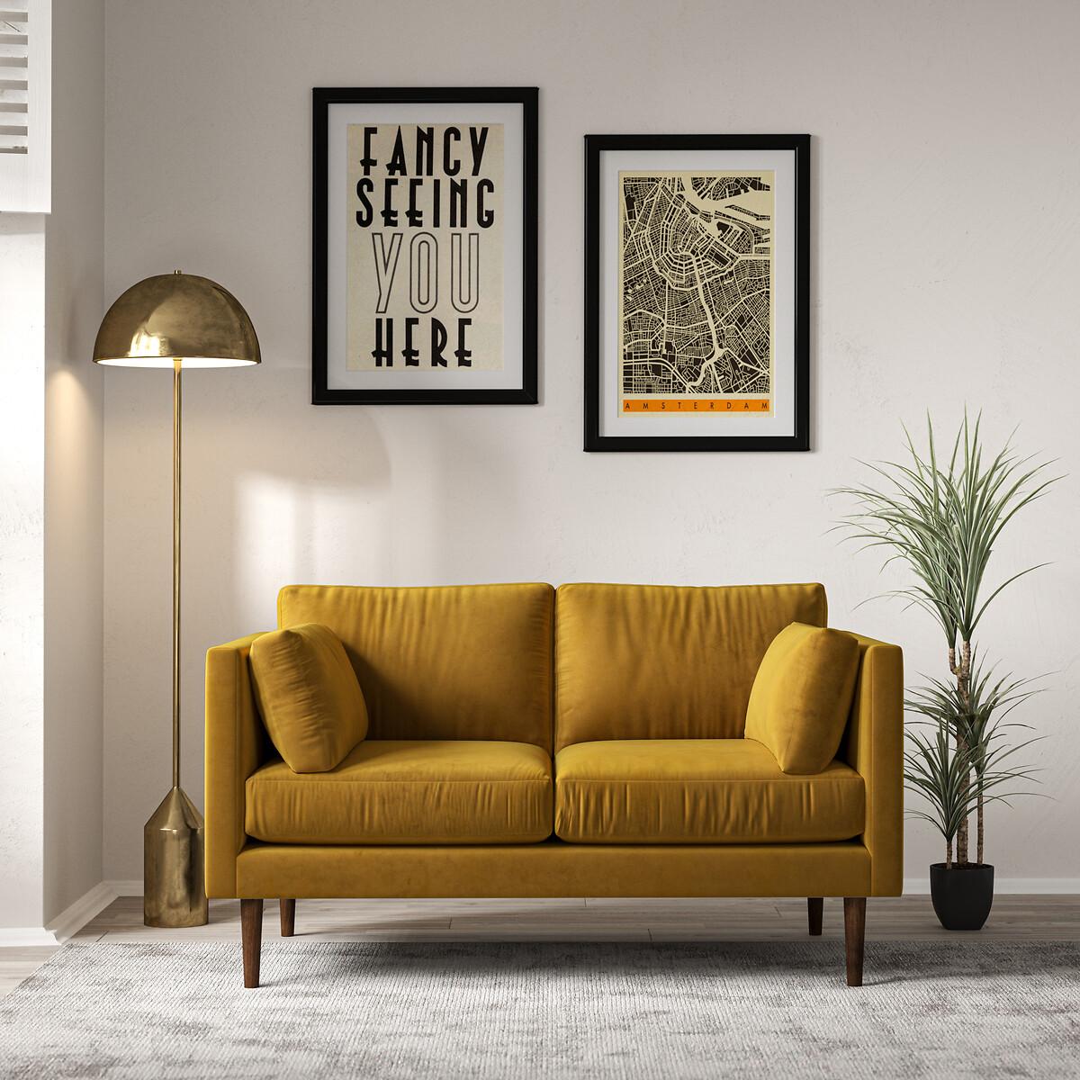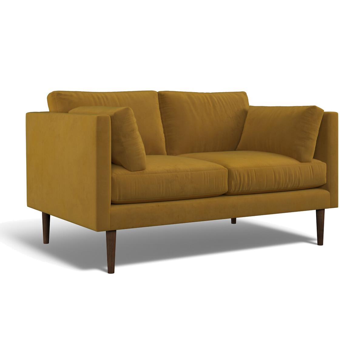 Minimalist design meets maximum comfort in the Gabriela. Beautiful in its simplicity, clean lines create a stylish square silhouette. Super-slim arms maximise seat space, supported by high sleek tapered legs. Relax amongst luxurious feather wrapped cushions knowing you've got Mid-century style sorted. Choose from our soft brushed fabric for ultimate cosiness or velvet for luxe living. Gabriela is also available as a 3 seater sofa, or why not try the matching armchair or snuggle chair? Product details• Velvet - An elegant velvet with a dense and matte finish, perfect for those wanting a rich and luxurious look. A flat finish pile makes it difficult for the material to snag – ideal if you live with pets and sure to prove durable for years to come. Check it's right for you - order a FREE swatch above.• Created with medium density foam fillings for a sofa with a level of comfort suitable for most. • Luxury seating cushions made from a blend of foam, feather and fibres offer the best of both words. A foam core with a feather wrap gives the cushion increased resilience and support without compromising on comfort, whilst fibre fillings add softness and body. Feather fillings allow air to circulate better, whilst being great at retaining heat in colder months. • Fibre backs provide extra softness and give you that "sink in" feeling.• Just flip to freshen up - the back cushions are fully finished both sides and reversible so it's easy to keep your sofa looking its best. Seat cushions are not reversible but are removable. • Both seat and back covers are removable (zip fastening)• FSC® solid beech hardwood frame - made of wood from responsibly managed forests that provide environmental, social and economic benefits.• Tapered feet crafted entirely from solid wood ensure durability and stability.• Removable feet.• Lovingly handmade in the UK.All our made to order sofas are carefully manufactured in the UK.Each hardwood frame is dowelled, glued, and screwed before being paired with the finest fabrics and fillings. And it doesn't stop there - for customer peace of mind and safety, all frames and fabrics are rigorously examined, inspected, and tested to the highest standards. All filling material(s) and covering fabric(s) meet the requirements for resistance to cigarette and match ignition in the 1988 safety regulations. This sofa comes with a 3 year manufacturer warranty from date of delivery (subject to terms and conditions)Product composition• Fabric - Velvet (100% polyester)• Seat fillings - foam/fibre/feather• Back Fillings - Fibre• Frame - Beech Hardwood (FSC), OSB (UK origin, FSC)• Feet - Solid Wood. Product Dimensions Overall width: 133 cm. Overall depth: 93 cm. Overall height: 82 cm. Seat depth: 60 cm. Seat width between the arms: 120 cm. Back height (from base): 62 cm. Back height (from seat): 42 cm Clearance to floor (leg height): 20 cm. Please remember to measure your available space before ordering to be sure your sofa will fit. Don't forget to measure accessways and corners, and consider any obstacles. Package DimensionsL13. 4 cm x W94 cm x H91 cm, Weight 49 kg. This product will be dispatched by one of our trusted suppliers. You’ll be contacted by their selected courier about your delivery. Your product will be delivered to your room of choice. Feet may be assembled on arrival. BELFI01