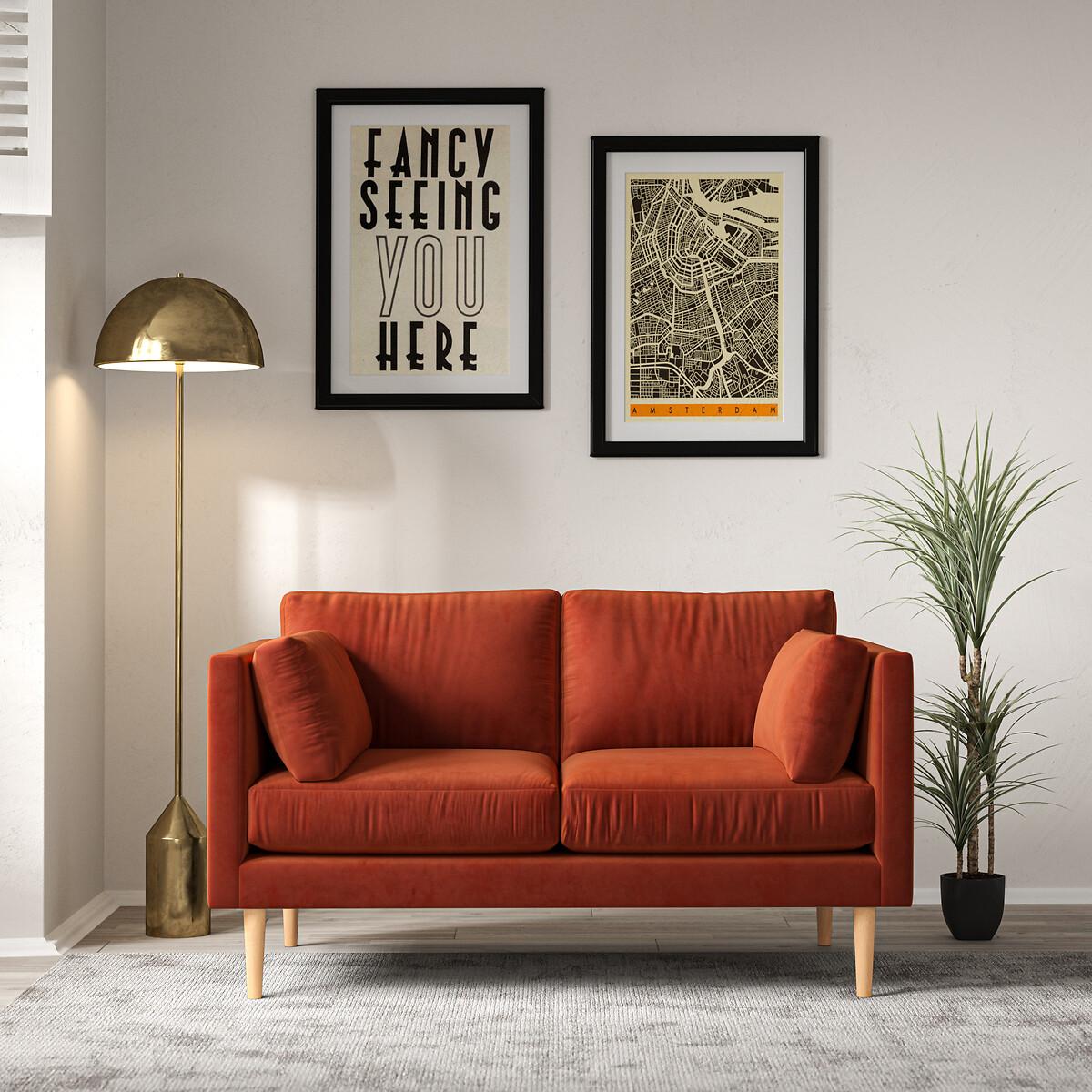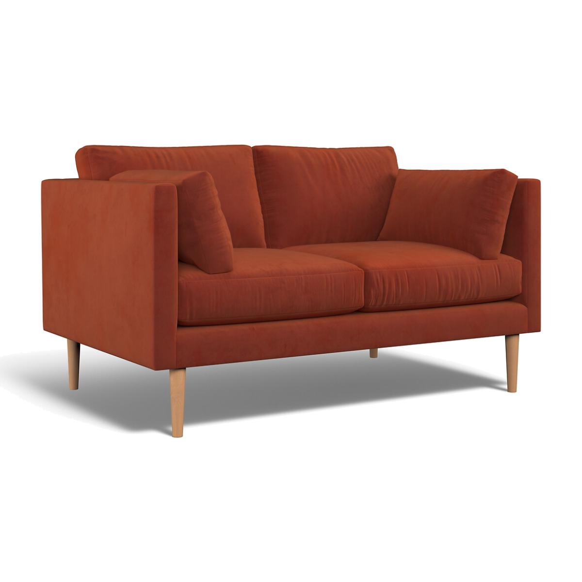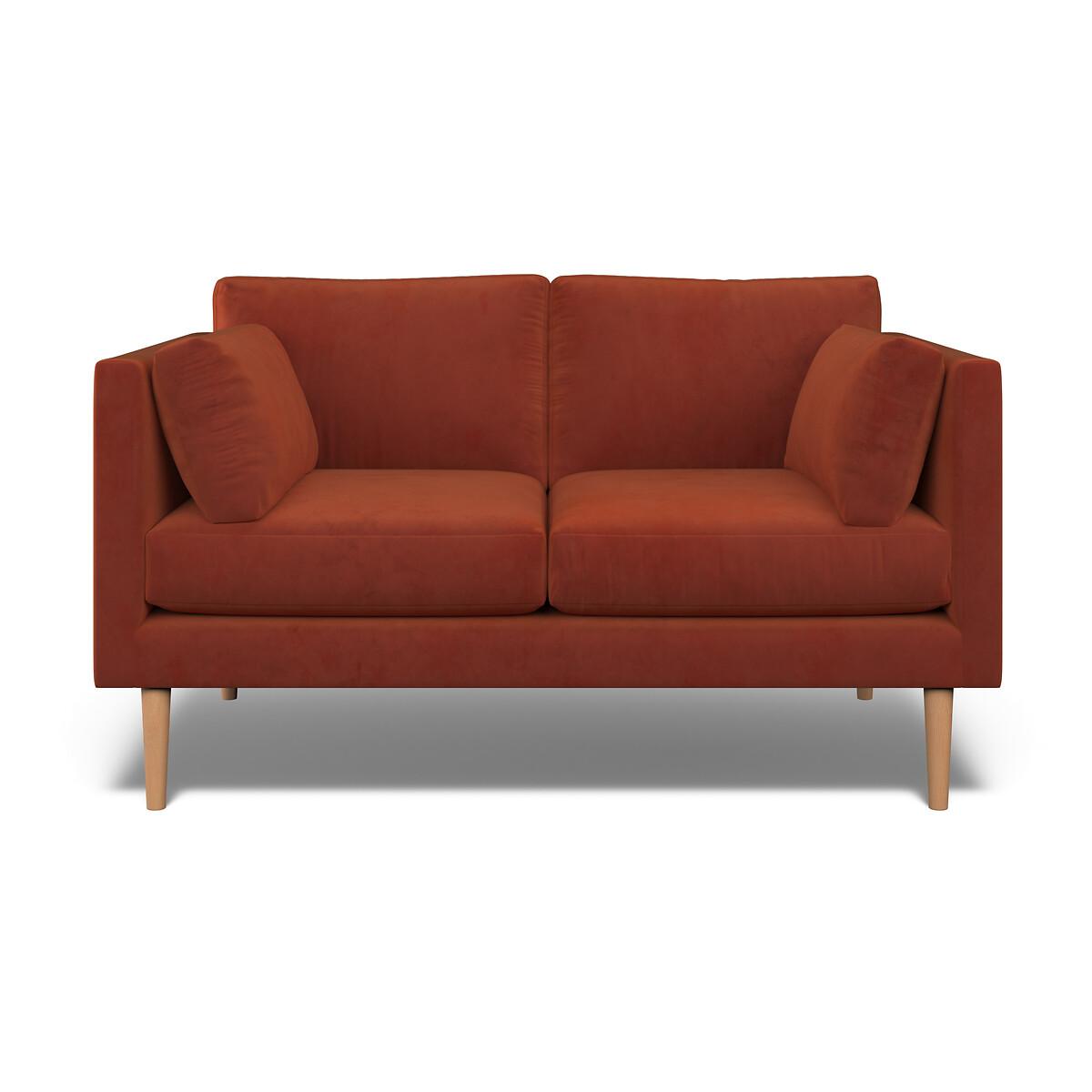 Minimalist design meets maximum comfort in the Gabriela. Beautiful in its simplicity, clean lines create a stylish square silhouette. Super-slim arms maximise seat space, supported by high sleek tapered legs. Relax amongst luxurious feather wrapped cushions knowing you've got Mid-century style sorted. Choose from our soft brushed fabric for ultimate cosiness or velvet for luxe living. Gabriela is also available as a 3 seater sofa, or why not try the matching armchair or snuggle chair? Product details• Velvet - An elegant velvet with a dense and matte finish, perfect for those wanting a rich and luxurious look. A flat finish pile makes it difficult for the material to snag – ideal if you live with pets and sure to prove durable for years to come. Check it's right for you - order a FREE swatch above.• Created with medium density foam fillings for a sofa with a level of comfort suitable for most. • Luxury seating cushions made from a blend of foam, feather and fibres offer the best of both words. A foam core with a feather wrap gives the cushion increased resilience and support without compromising on comfort, whilst fibre fillings add softness and body. Feather fillings allow air to circulate better, whilst being great at retaining heat in colder months. • Fibre backs provide extra softness and give you that "sink in" feeling.• Just flip to freshen up - the back cushions are fully finished both sides and reversible so it's easy to keep your sofa looking its best. Seat cushions are not reversible but are removable. • Both seat and back covers are removable (zip fastening)• FSC® solid beech hardwood frame - made of wood from responsibly managed forests that provide environmental, social and economic benefits.• Tapered feet crafted entirely from solid wood ensure durability and stability.• Removable feet.• Lovingly handmade in the UK.All our made to order sofas are carefully manufactured in the UK.Each hardwood frame is dowelled, glued, and screwed before being paired with the finest fabrics and fillings. And it doesn't stop there - for customer peace of mind and safety, all frames and fabrics are rigorously examined, inspected, and tested to the highest standards. All filling material(s) and covering fabric(s) meet the requirements for resistance to cigarette and match ignition in the 1988 safety regulations. This sofa comes with a 3 year manufacturer warranty from date of delivery (subject to terms and conditions)Product composition• Fabric - Velvet (100% polyester)• Seat fillings - foam/fibre/feather• Back Fillings - Fibre• Frame - Beech Hardwood (FSC), OSB (UK origin, FSC)• Feet - Solid Wood. Product Dimensions Overall width: 146 cm. Overall depth: 93 cm. Overall height: 82 cm. Seat depth: 60 cm. Seat width between the arms: 133 cm. Back height (from base): 62 cm. Back height (from seat): 42 cm Clearance to floor (leg height): 20 cm. Please remember to measure your available space before ordering to be sure your sofa will fit. Don't forget to measure accessways and corners, and consider any obstacles. Package DimensionsL13. 4 cm x W94 cm x H91 cm, Weight 49 kg. This product will be dispatched by one of our trusted suppliers. You’ll be contacted by their selected courier about your delivery. Your product will be delivered to your room of choice. Feet may be assembled on arrival. BELFI01