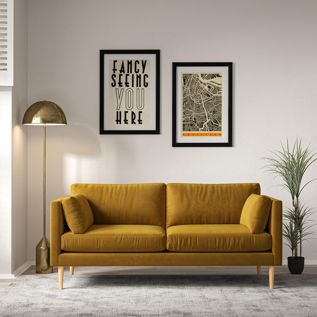 Minimalist design meets maximum comfort in the Gabriela. Beautiful in its simplicity, clean lines create a stylish square silhouette. Super-slim arms maximise seat space, supported by high sleek tapered legs. Relax amongst luxurious feather wrapped cushions knowing you've got Mid-century style sorted. Choose from our soft brushed fabric for ultimate cosiness or velvet for luxe living. Gabriela is also available as a 2 seater sofa, or why not try the matching armchair or snuggle chair? Product details• Velvet - An elegant velvet with a dense and matte finish, perfect for those wanting a rich and luxurious look. A flat finish pile makes it difficult for the material to snag – ideal if you live with pets and sure to prove durable for years to come. Check it's right for you - order a FREE swatch above.• Created with medium density foam fillings for a sofa with a level of comfort suitable for most. • Luxury seating cushions made from a blend of foam, feather and fibres offer the best of both words. A foam core with a feather wrap gives the cushion increased resilience and support without compromising on comfort, whilst fibre fillings add softness and body. Feather fillings allow air to circulate better, whilst being great at retaining heat in colder months. • Fibre backs provide extra softness and give you that "sink in" feeling.• Just flip to freshen up - the back cushions are fully finished both sides and reversible so it's easy to keep your sofa looking its best. Seat cushions are not reversible but are removable. • Both seat and back covers are removable (zip fastening)• FSC® solid beech hardwood frame - made of wood from responsibly managed forests that provide environmental, social and economic benefits.• Tapered feet crafted entirely from solid wood ensure durability and stability.• Removable feet.• Lovingly handmade in the UK.All our made to order sofas are carefully manufactured in the UK.Each hardwood frame is dowelled, glued, and screwed before being paired with the finest fabrics and fillings. And it doesn't stop there - for customer peace of mind and safety, all frames and fabrics are rigorously examined, inspected, and tested to the highest standards. All filling material(s) and covering fabric(s) meet the requirements for resistance to cigarette and match ignition in the 1988 safety regulations. This sofa comes with a 3 year manufacturer warranty from date of delivery (subject to terms and conditions)Product composition• Fabric - Velvet (100% polyester)• Seat fillings - foam/fibre/feather• Back Fillings - Fibre• Frame - Beech Hardwood (FSC), OSB (UK origin, FSC)• Feet - Solid Wood. Product Dimensions Overall width: 146 cm. Overall depth: 93 cm. Overall height: 82 cm. Seat depth: 60 cm. Seat width between the arms: 133 cm. Back height (from base): 62 cm. Back height (from seat): 42 cm Clearance to floor (leg height): 20 cm. Please remember to measure your available space before ordering to be sure your sofa will fit. Don't forget to measure accessways and corners, and consider any obstacles. Package DimensionsL18. 5 cm x W94 cm x H91 cm, Weight 55 kg. This product will be dispatched by one of our trusted suppliers. You’ll be contacted by their selected courier about your delivery. Your product will be delivered to your room of choice. Feet may be assembled on arrival. BELFI01