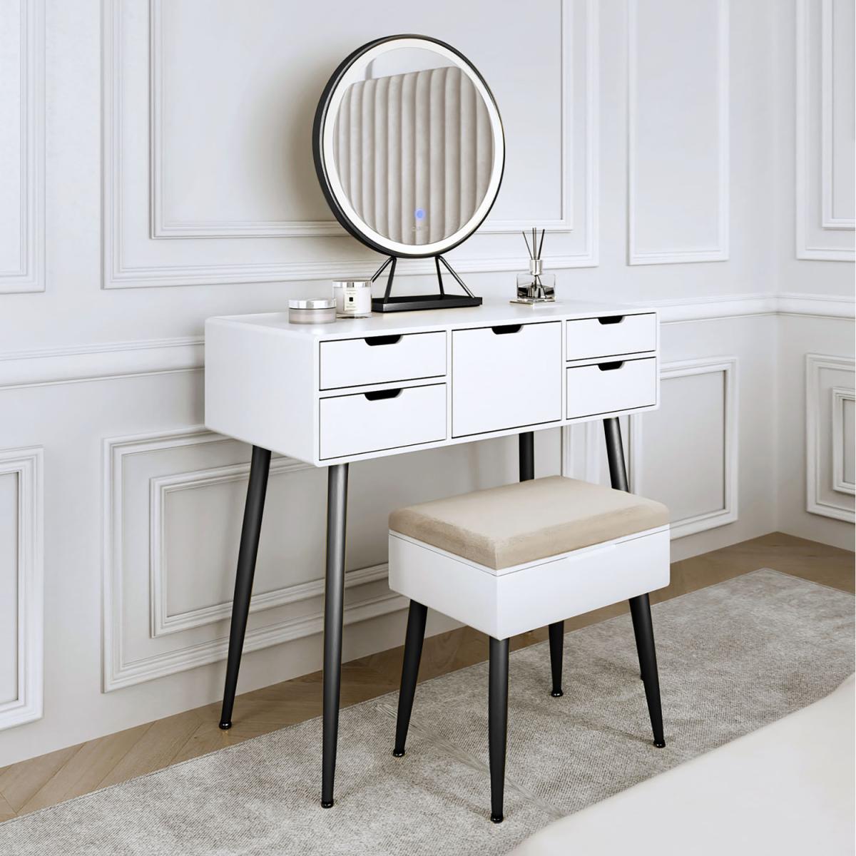 Introducing the Gabriella LED Mirror Dressing Table, a must have piece for any bedroom or dressing room! Create the perfect ambient glow with the touch activated, dimmable LED mirror with lights. Including three different glow settings: cool, warm and day to give you the perfect lighting whilst getting your glam on! The curved edges of the vanity table add a subtle feminine touch and the metal champagne gold legs are super chic. This modern dresser set offers five spacious pull-out storage drawers for all your cosmetics, beauty products and hair accessories. Complete with a matching velvet padded stool and lift-up lid which doubles as a storage compartment, the Gabriella modern makeup table is sure to be a feature in any bedroom and is the essential additional storage for all your beauty bits! Design registration number 6235109 Transform your space with Gabriella, a stunning white dressing table combining style and functionality, with black accents Gabriella is sure to uplift your dressing room or bedroom. The sleek dressing table has a refined look, featuring spacious storage drawers perfect for effortlessly organising your makeup and beauty products. The curved edges of the drawer handles complement the circular table top mirror. Taking pride of place on top of the vanity table the black circular mirror that is illuminated by an LED light. Creating ambience and the perfect glow for getting that flawless look, the LED light is effortlessly controlled by a touch sensor. Simply tap the sensor to turn on and change the colour light setting and press and hold to adjust the brightness. The LED light offers three colour settings, warm, cool and daylight to ensure you have the perfect glow for applying your makeup, beauty prep and taking that perfect selfie! The black tone of the mirror highlights the matching black legs. The matching stool is complete with a velvet padded seat and lift-up lid revealing additional storage. The perfect blend of style and functionality, upgrade your interior style with the Gabriella dressing table.