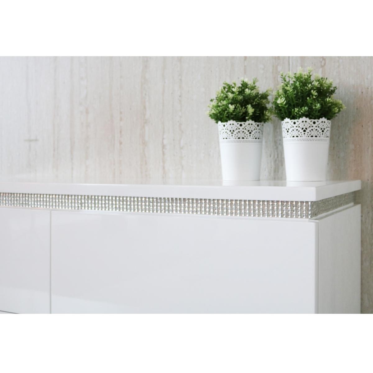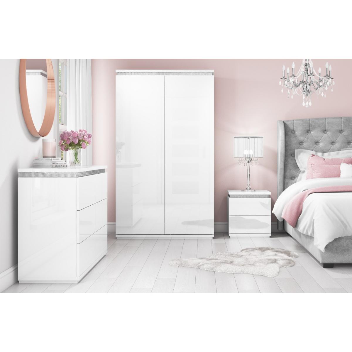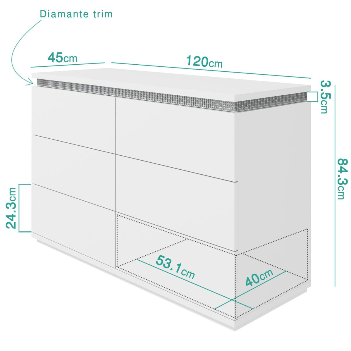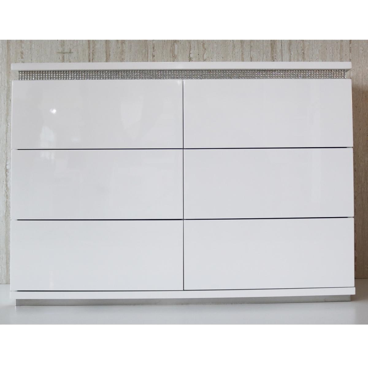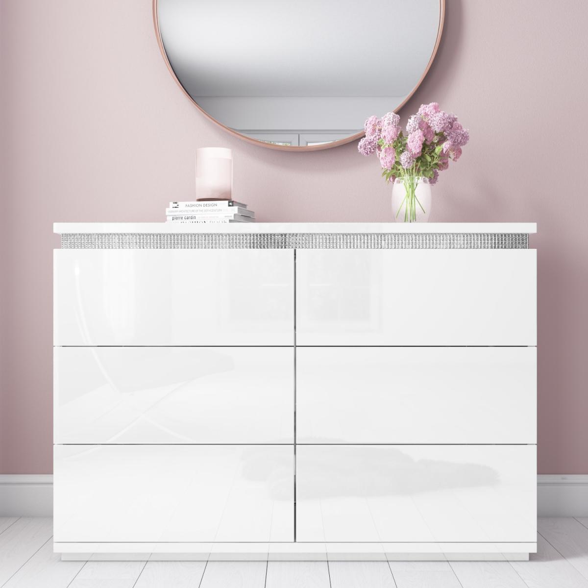 Features we love It's an exclusive design so you won't find it anywhere else!The linear design sitting upon a steel plinth gives a unique and contemporary style. Adds a touch of glamour and sparkle to the bedroom with its diamante trim. The fresh white high gloss finish has a natural shine that will rejuvenate your space. Seamless finish with 6 push to open drawers All about me. If you like a modern look and love a touch of glamour then the Gabriella range is just perfect for you. Sitting upon a stainless steel plinth this Gabriella wide chest of drawers exudes contemporary elegance. The clean linear design is finished superbly with a sleek white high gloss coating giving a natural shine to the piece. The pureness of this chest is sure to rejuvenate your space. Its crowning glory is a unique diamante trim neatly positioned around the table top adding an elegant touch of sparkle to this otherwise clean cut piece of furniture. This trendy chest houses six drawers giving plenty of discreet storage for the bedroom and all your folded items. The drawers maintain the flawless look as they are seamless you simply touch to open them. Made from a combination of materials this unique chest of drawers is highly durable and the smooth nature of the high gloss finish makes it super easy to wipe clean. Need to know. Dimensions. H84 x W120 x D45 cm Material. Wood combination Finish. White high gloss Hardware. Diamante strip and; stainless steel plinth Drawers. 6 Assembly required. Yes.
