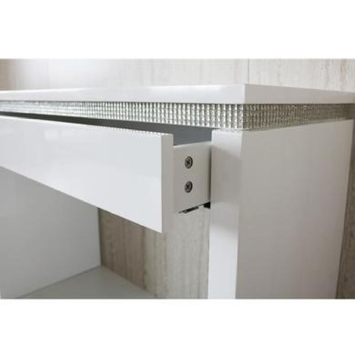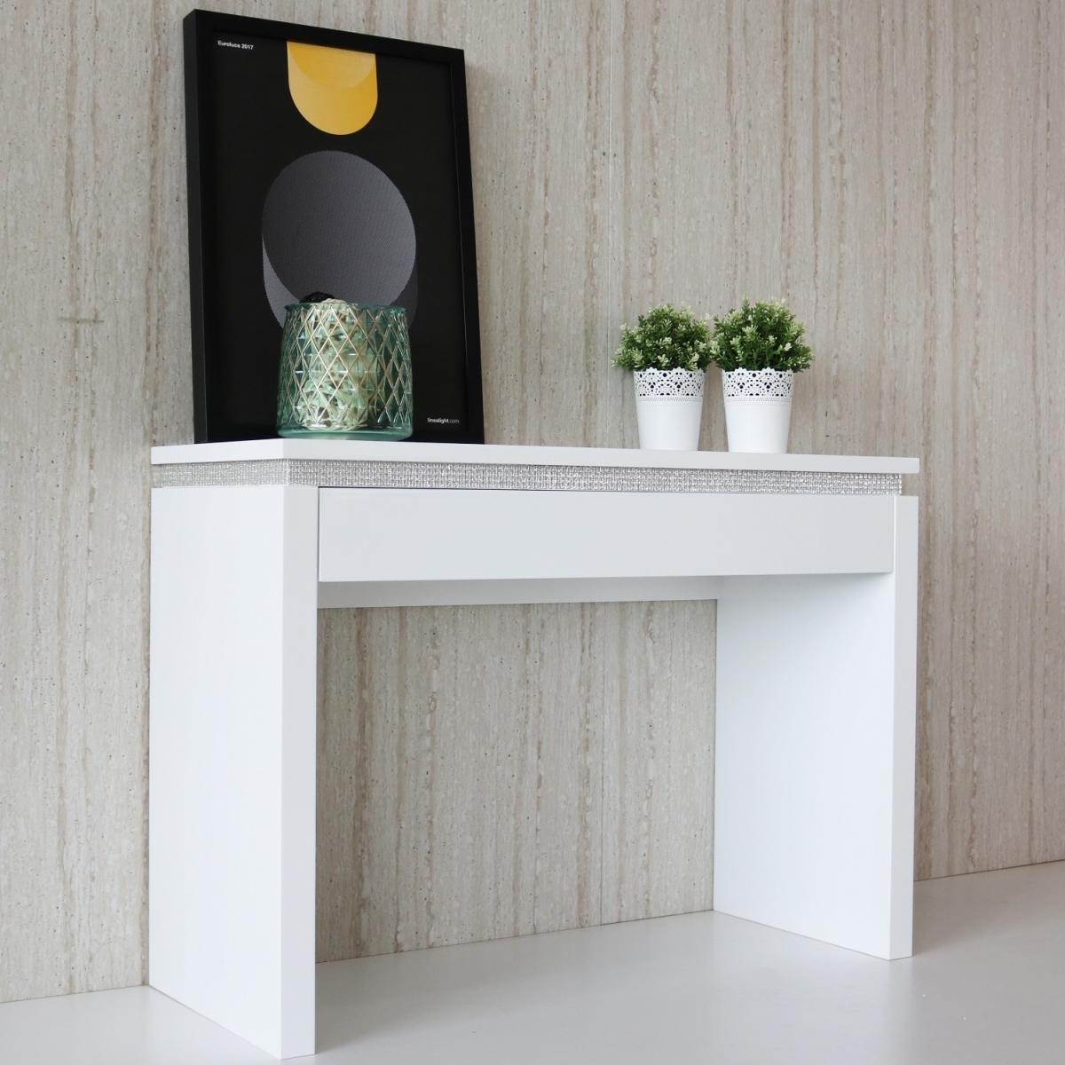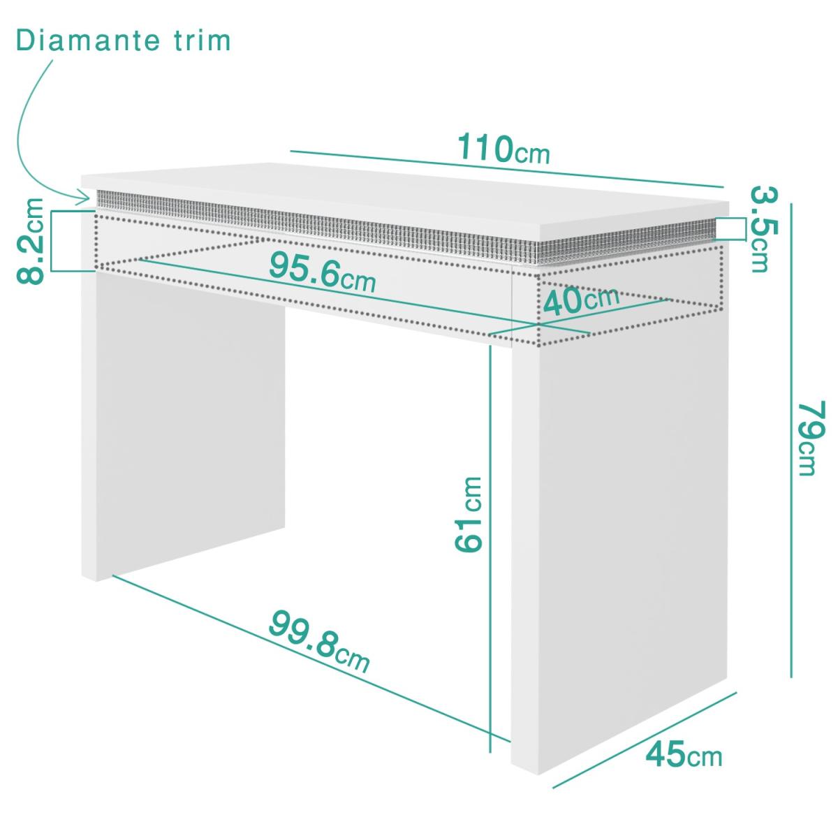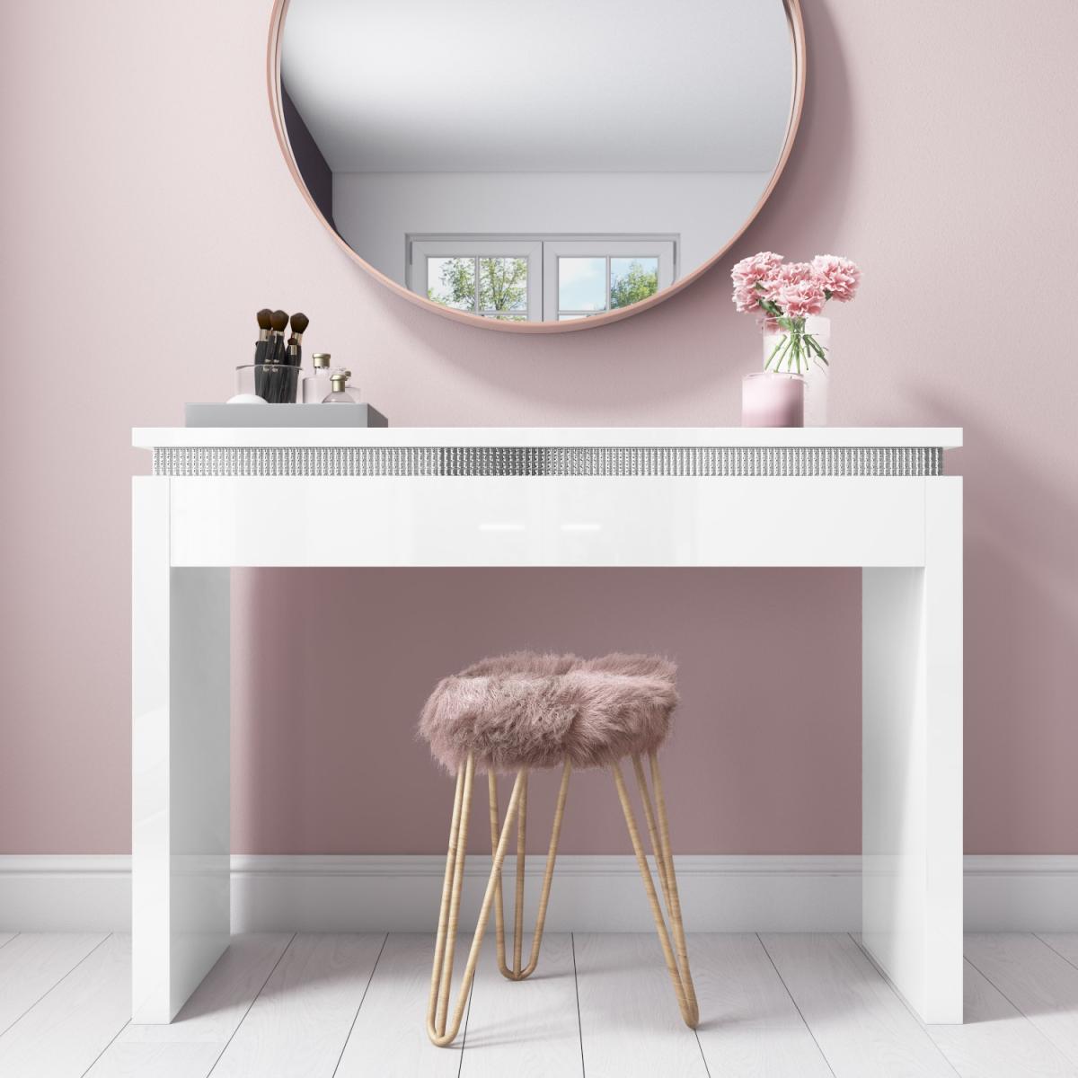 Features we love It's an exclusive design so you won't find it anywhere else!Clean and linear design gives a contemporary look. Adds a touch of glamour and sparkle to the bedroom with its diamante trim. The fresh white high gloss finish has a natural shine that will rejuvenate your space. Seamless finish with a push to open drawer All about me. If you like a modern look and love a touch of glamour then the Gabriella range is just perfect for you. This Gabriella dressing table exudes contemporary elegance. The clean linear design is finished superbly with a sleek white high gloss coating giving a natural shine to the piece. The pureness of this dressing table is sure to rejuvenate your space. Its crowning glory is a unique diamante trim neatly positioned around the table top adding an elegant touch of sparkle to this otherwise clean cut piece of furniture. This trendy dressing table houses a single wide drawer coming in handy for make-up and other essentials. The drawer maintains the flawless look as it's seamless you simply touch to open it. Made from a combination of materials this unique dressing table is highly durable and the smooth nature of the high gloss finish makes it super easy to wipe clean. Need to know. Dimensions. H79 x W110 x D45 cm Material. Wood combination Finish. White high gloss Hardware. Diamante strip Drawers. 1 Assembly required. Yes.