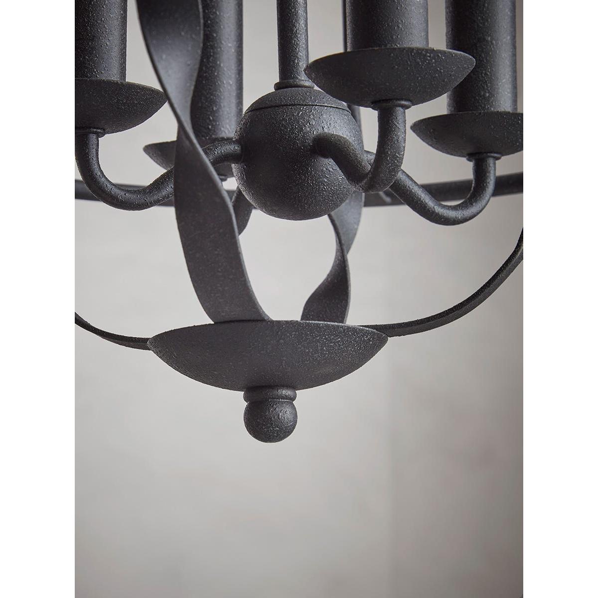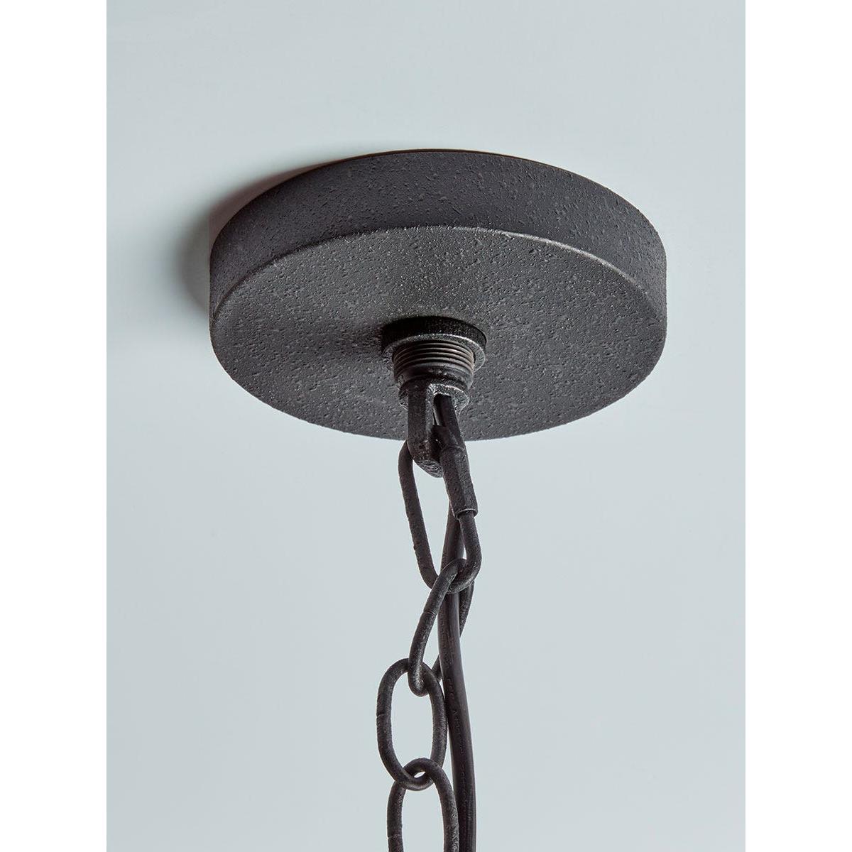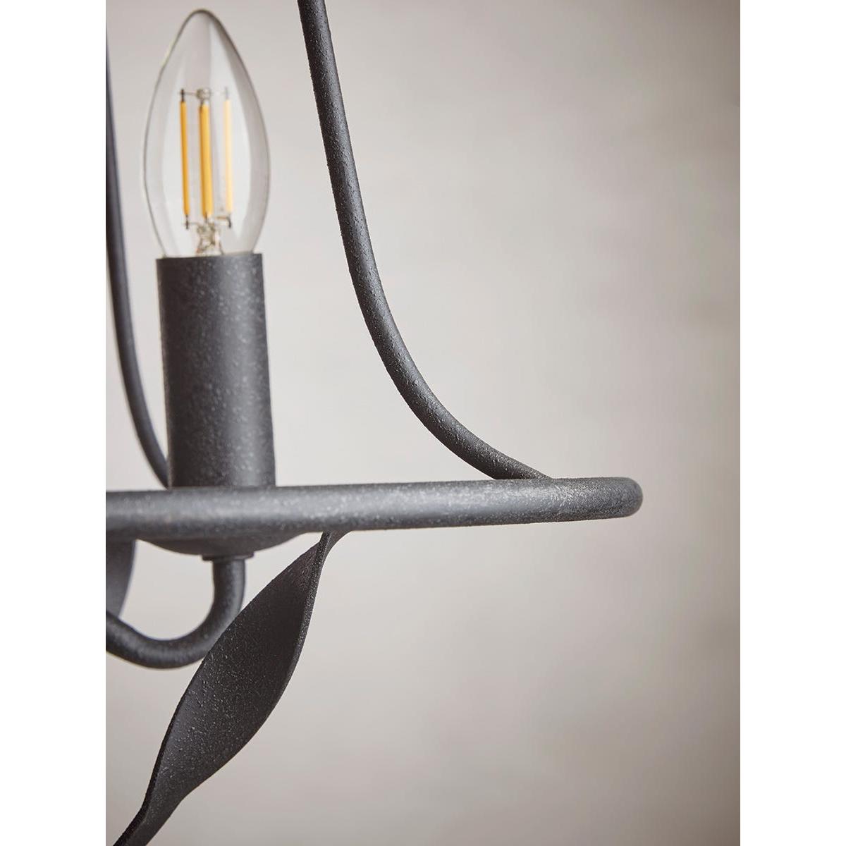 Enhance an industrial themed interior with our dramatic Gaia Chandelier. A bold design of black steel - an oval basket frames four branches of candle bulbs which are linked by broad steel “ribbons”. A ring and chain link the chandelier to the matching ceiling rose. This chandelier offers the perfect contrast to natural elements such as exposed brick, stone and warm time-aged timbers.
