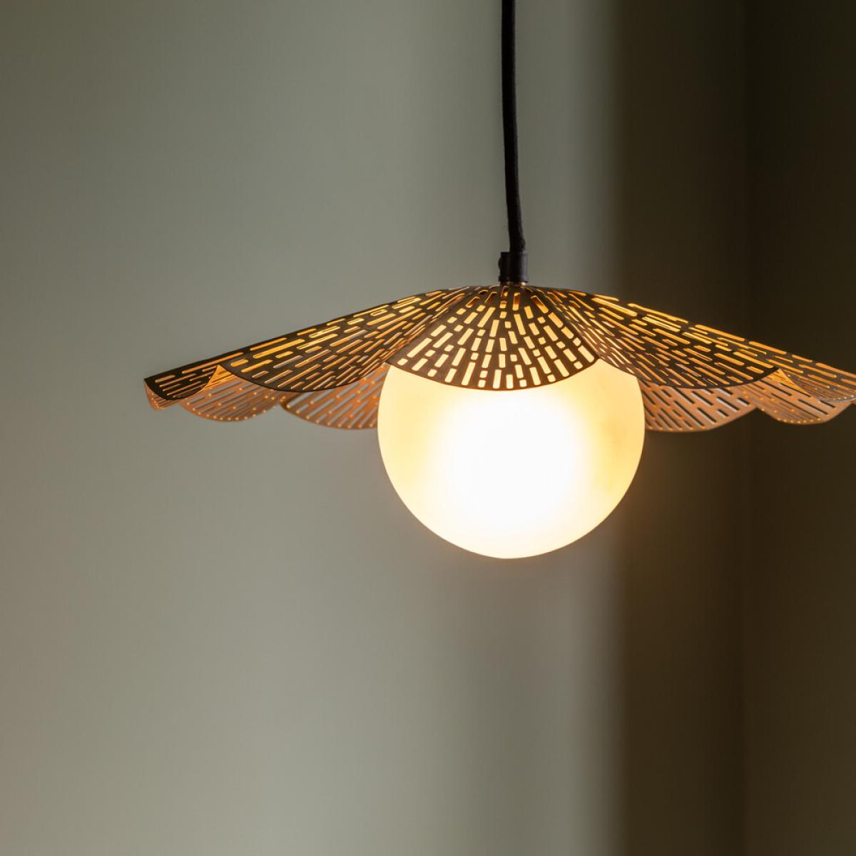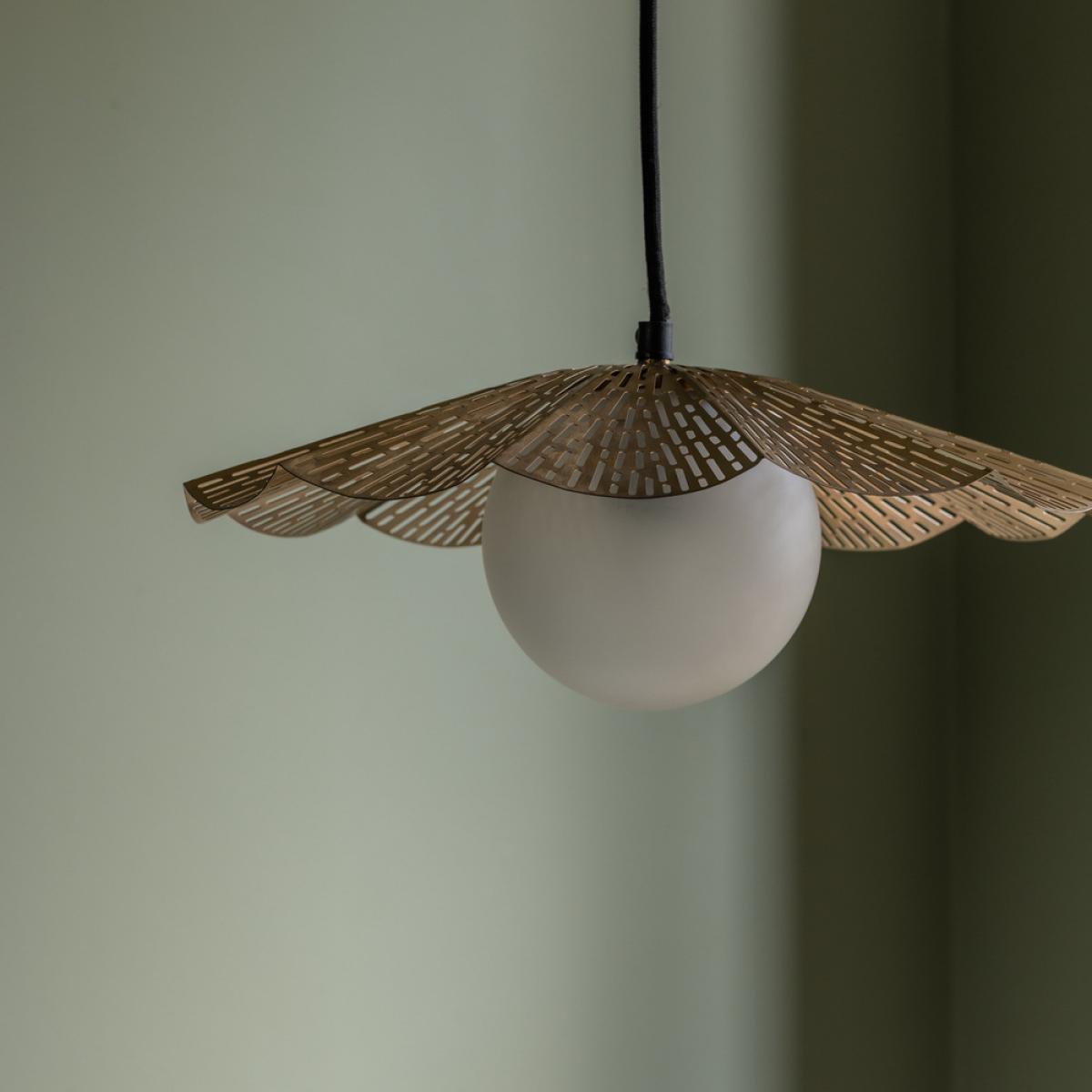 Creating a stunning centrepiece, our Gaia Pendant Light is a unique design crafted from frosted glass and brass. The scalloped punched brass petal shade casts interesting shapes on ceilings and walls, and the light bulb is covered with a frosted glass globe to soften the light source. This light is the perfect glamorous addition to a bedroom, hallway or living room.