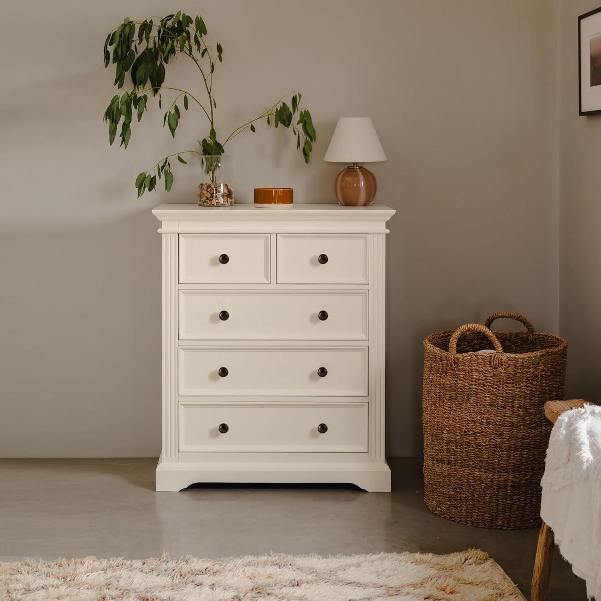 This elegant Gainsborough chest of drawers in fresh white or vintage cream colour is the epitome of classic Hampton style. Fully assembled with a 2 over 3 drawer configuration, it boasts a high top plinth, hand-carved details, and bevelled edges for a touch of sophistication. Measuring W90cm, H105cm, D42.5cm (35.4in x 41.3in x 16.7in), this spacious chest provides ample storage while adding a timeless charm to your bedroom. Choose between round metal handles or diamond-shaped crystal handles to complement your decor. Crafted with meticulous attention to detail, this chest of drawers is a beautiful investment piece that will elevate your space with its elegant design and quality construction.