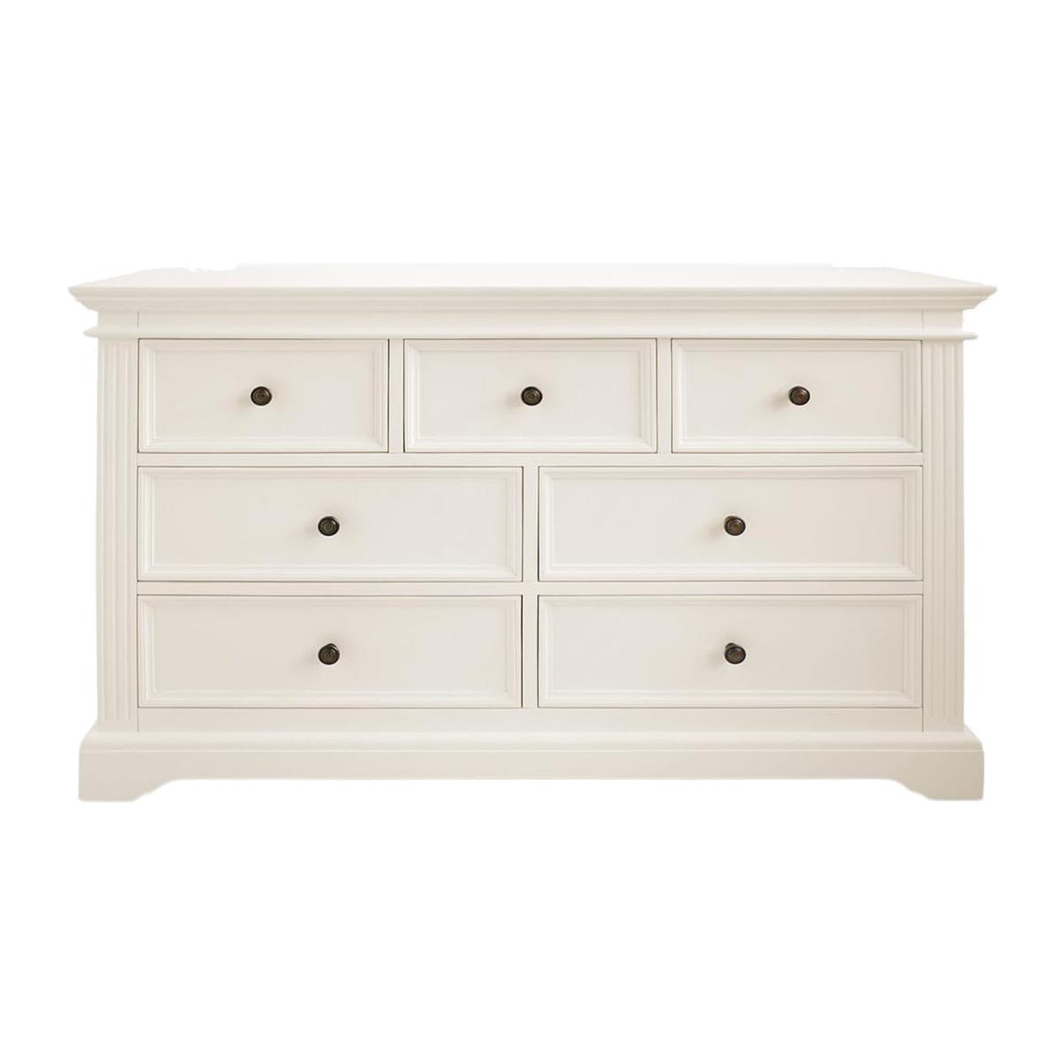 The Gainsborough Large Chest of Drawers in fresh white or vintage cream finish is a spacious and elegant storage solution for your bedroom or living area. With its classic Hampton style, this fully assembled chest features a 3 over 4 drawer configuration, providing ample space for organising your belongings. The wide 7-drawer design ensures that you have plenty of room to store everything from clothing and linens to accessories and more. Crafted with attention to detail, this chest boasts a high top plinth, carved detailing, and bevelled edges, adding a touch of sophistication to its appearance. You can choose between round metal or diamond-shaped crystal handles to complement your personal style. Measuring 135cm wide 84cm heigh and 42.5cm deep (53.1in x 33.1in D16.7in), this chest is a substantial piece of furniture that will make a statement in any room. Whether you're looking for a functional and stylish storage solution or a beautiful accent piece, the Gainsborough Large Chest of Drawers is a versatile choice that combines practicality with timeless elegance.