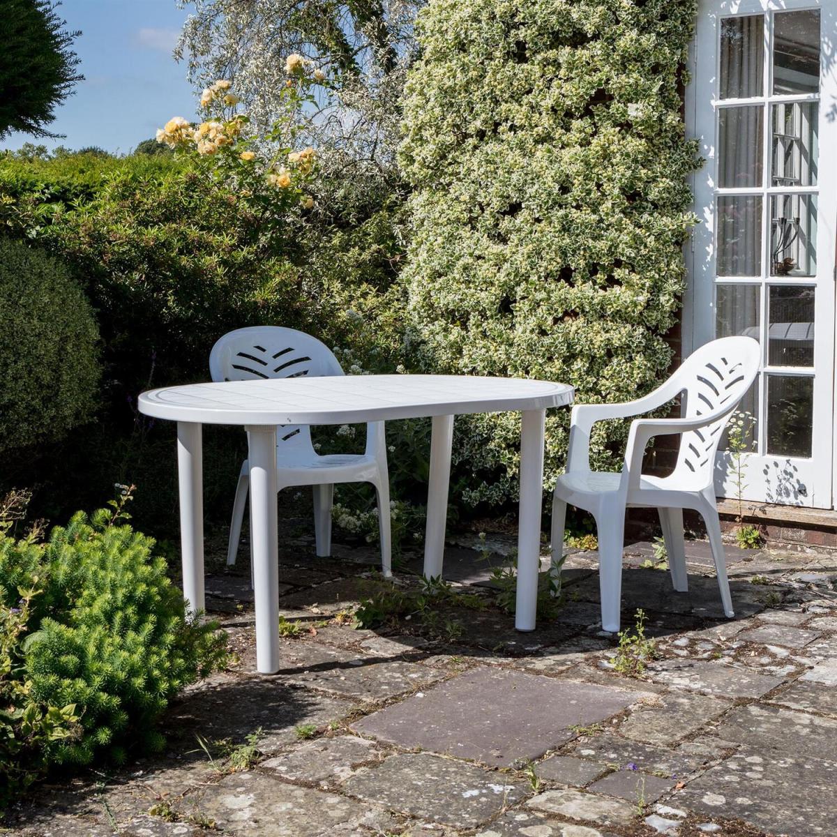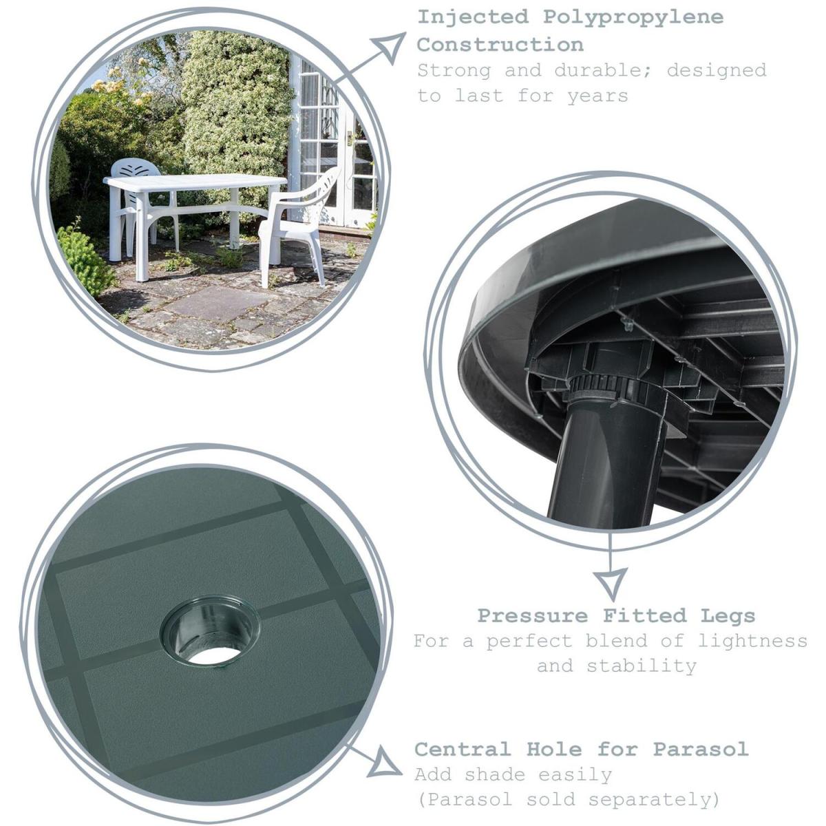 Bring a taste of the Costa Brava to your back garden this summer with the Resol Gala Oval Plastic Home Garden Family Dining Table. Manufactured in Spain a stones throw from the coast of the Mediterranean - this table is built from rugged, injected polypropylene, making it perfectly suited to the rigours of the British Summertime. Featuring pressure-fitted legs for stability, and a central hole that provides the perfect housing for a parasol. Team with any of our wide range of Resol home garden chairs for the ultimate summer barbecue garden party set up.