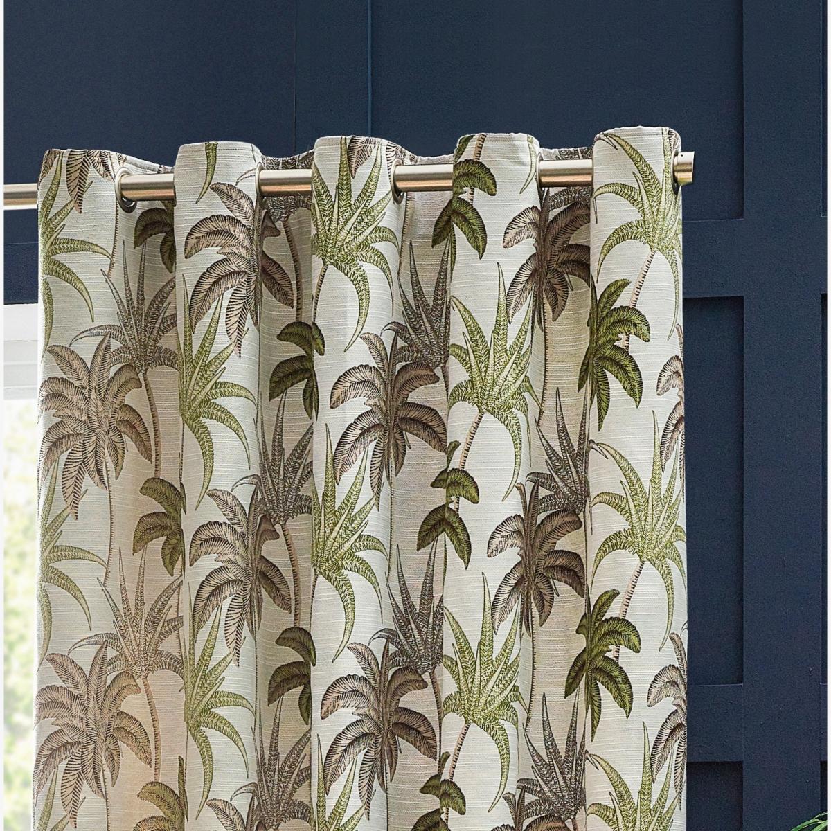 * 1 pair - includes 2 x curtain panels* Jacquard composition* Tropical Design* Eyelet Header* Multiple sizes available The Galapagos Green curtains bring a touch of the tropics indoors with a lively palm tree pattern woven on jacquard fabric. These curtain panels, lined for room-darkening, are available in vibrant colours and feature an eyelet header for easy installation. Made of 100% polyester, they are soft, durable, and easy to maintain, perfect for a contemporary setting.
