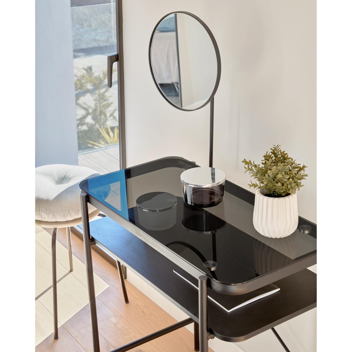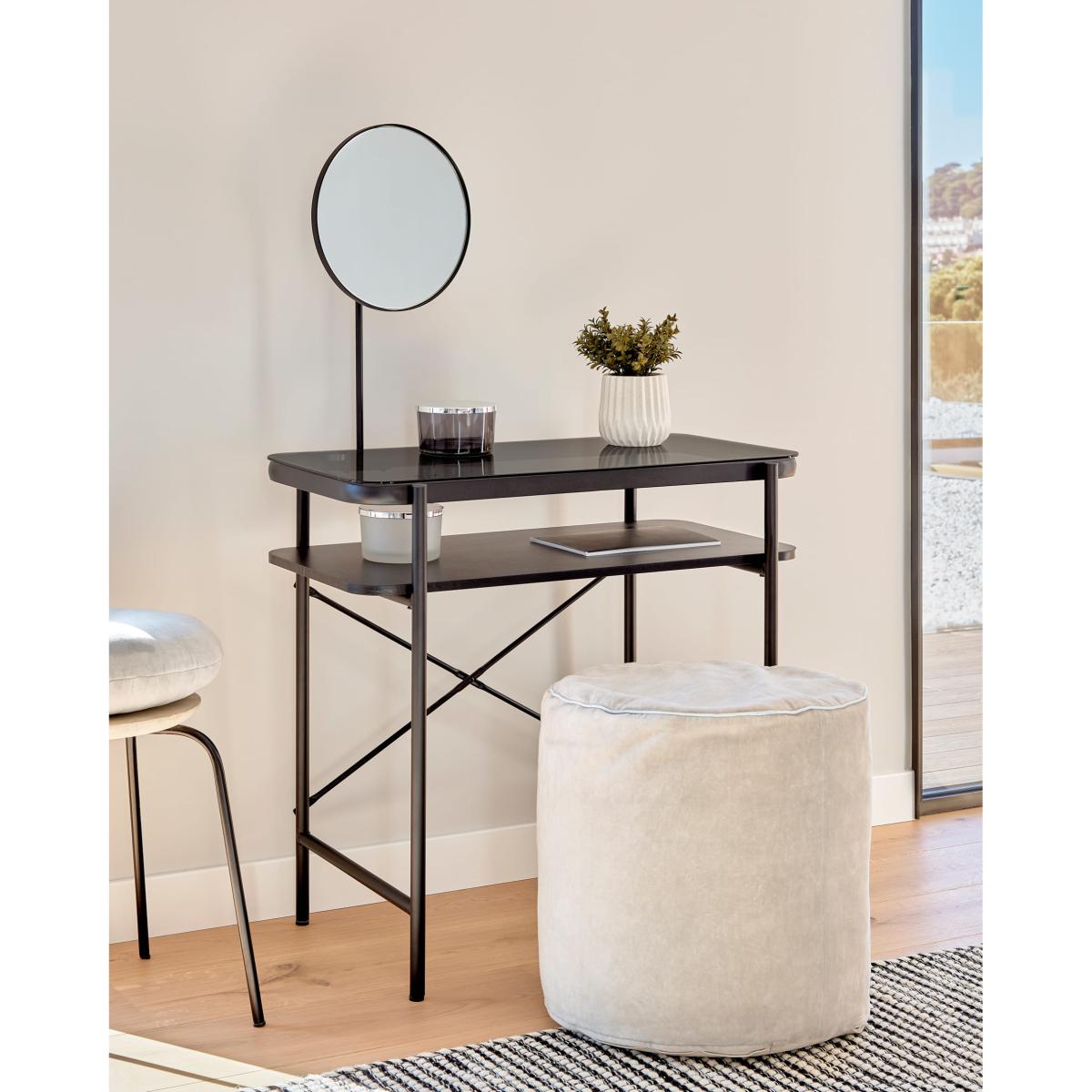 The Galatia dressing table with its sleek black finish and metal legs offers a modern yet versatile statement piece that works well in contemporary, industrial, or minimalist interiors. Its compact size makes it ideal for smaller bedrooms or dressing areas where space efficiency is key. I love how the clean lines and understated design lend a sophisticated feel without overwhelming the room. For styling, consider pairing it with a simple mirror or decorative tray to keep things functional yet stylish. Adding a few minimal accessories and some soft lighting can really enhance its appeal, making it both a practical and stylish addition to any dressing space.