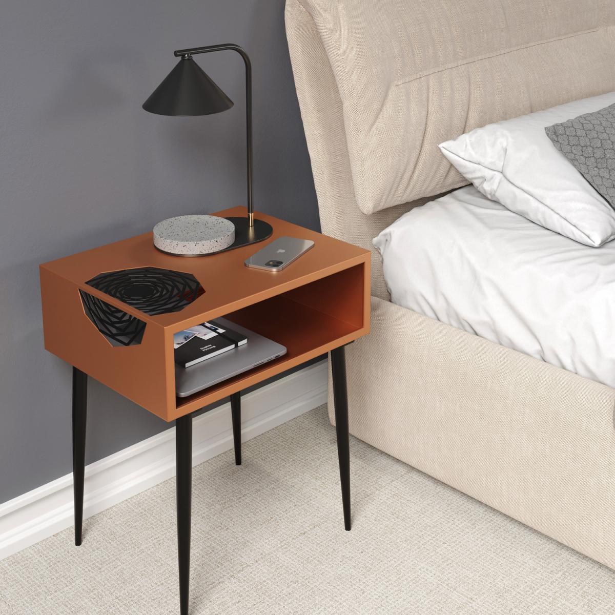 Add a touch of distinct elegance to your home with this stylish piece of metal furniture. Ideal for use anywhere in the home as a bedside or a side table. Made entirely from metal with a choice of gold or copper paint finish with a distinctive laser cut geometric pattern which transverses the top and side, highlighted with black paint. Tapered steel legs for extra impact. The rectangular cube design provides lots of storage space on top for a lamp, books or pictures whilst the undershelf is ideal for storing bedroom essentials or magazines. This striking piece is sure to make an impact in your home.