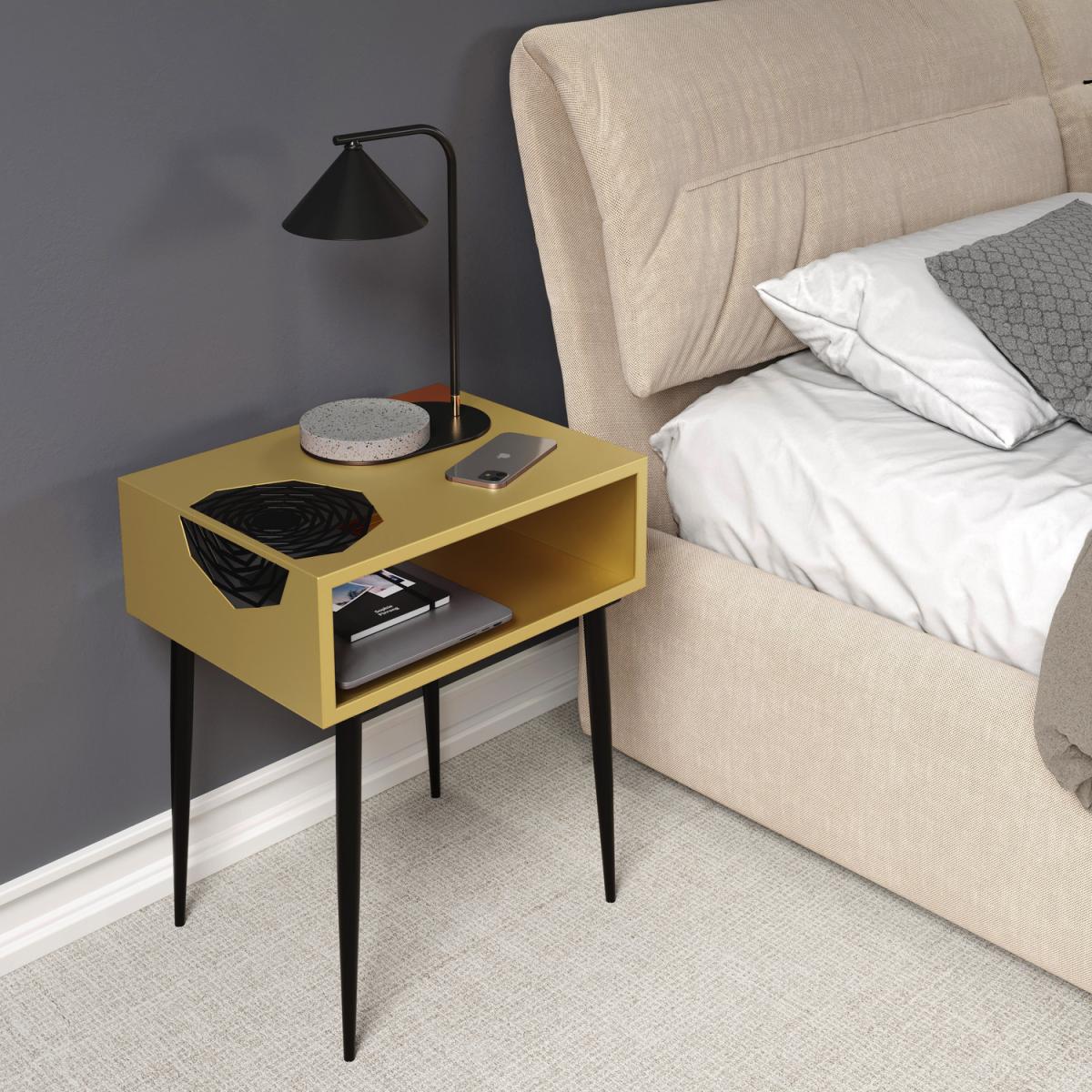 Add a touch of distinct elegance to your home with this stylish piece of metal furniture. Ideal for use anywhere in the home as a bedside or a side table. Made entirely from metal with a choice of gold or copper paint finish with a distinctive laser cut geometric pattern which transverses the top and side, highlighted with black paint. Tapered steel legs for extra impact. The rectangular cube design provides lots of storage space on top for a lamp, books or pictures whilst the undershelf is ideal for storing bedroom essentials or magazines. This striking piece is sure to make an impact in your home.