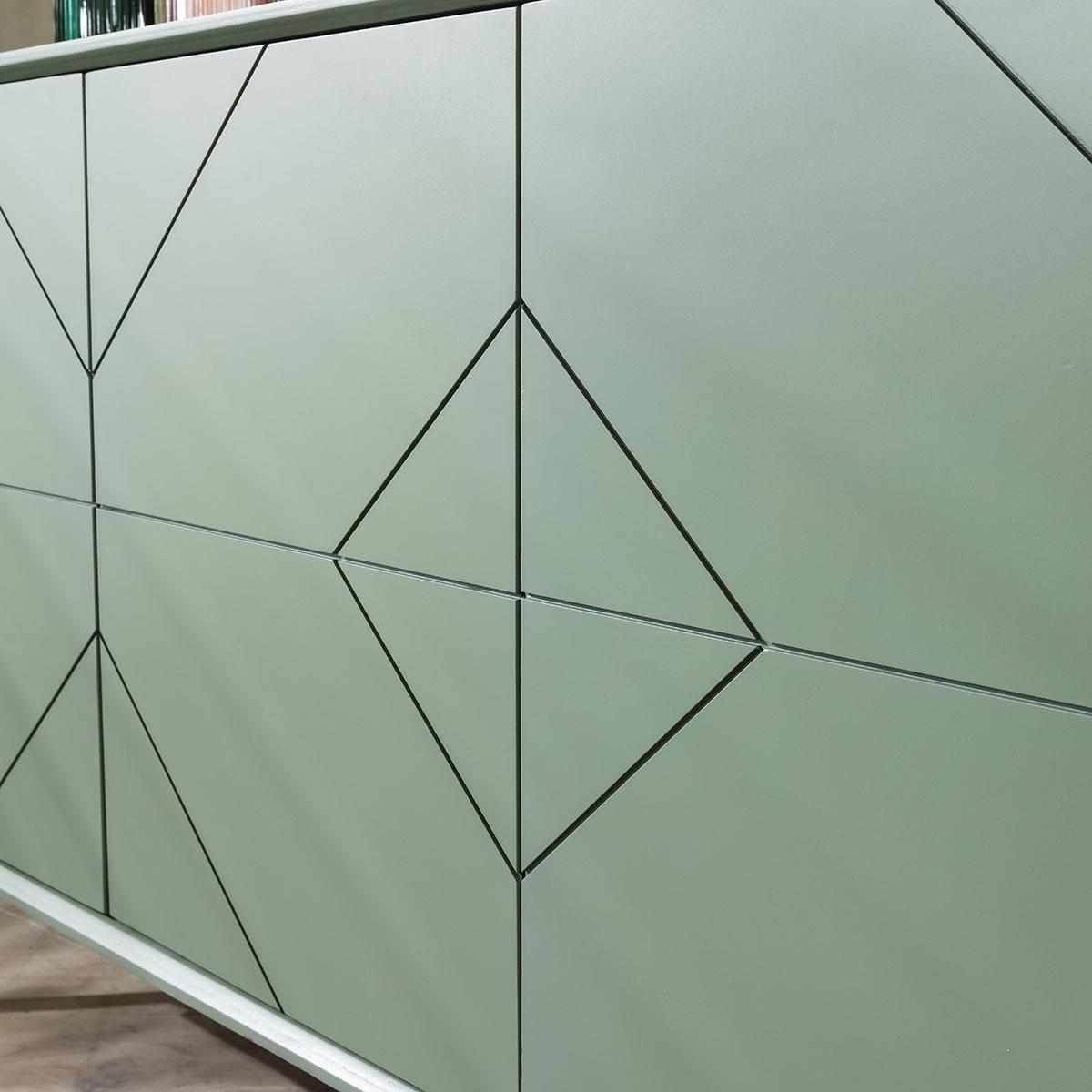 Instantly elevate your living space with our preassembled designer 4-door sideboard, a perfect blend of functionality and style. This 165cm wide buffet is not just a cabinet; it's a modern masterpiece. The sleek design, adorned with a geometric pattern on the door fronts, finished in a premium shade of Spanish green. Crafted for convenience, this sideboard features a fixed shelf on the inside, providing ample storage space. The handless design, utilising a push-open mechanism, ensures a seamless and contemporary appearance. The smooth painted finish in Spanish green not only captivates the eyes but also complements a variety of decor styles. Designed for durability, the sideboard boasts an iron base frame and legs with a brushed gold finish, creating a harmonious contrast with the vibrant green. Whether you're hosting dinner parties or seeking a stylish storage solution, our 4-door sideboard is the epitome of elegance and practicality. Elevate your home with this functional and visually striking furniture piece that transcends the ordinary. This 4-door sideboard arrives fully assembled, eliminating the hassle of putting it together. Simply unbox and place it in your desired spot to instantly elevate your space. Enjoy the convenience of a ready-to-use piece that effortlessly combines functionality and chic design without any assembly stress. W165cm D45cm H80cm Push-open catches on the doors Fully assembled