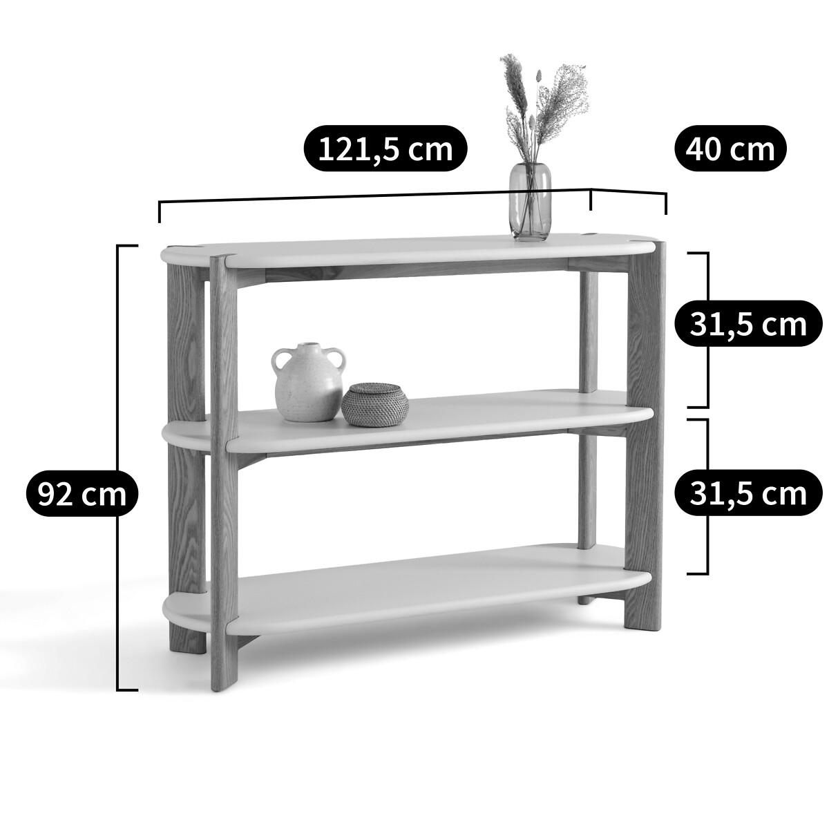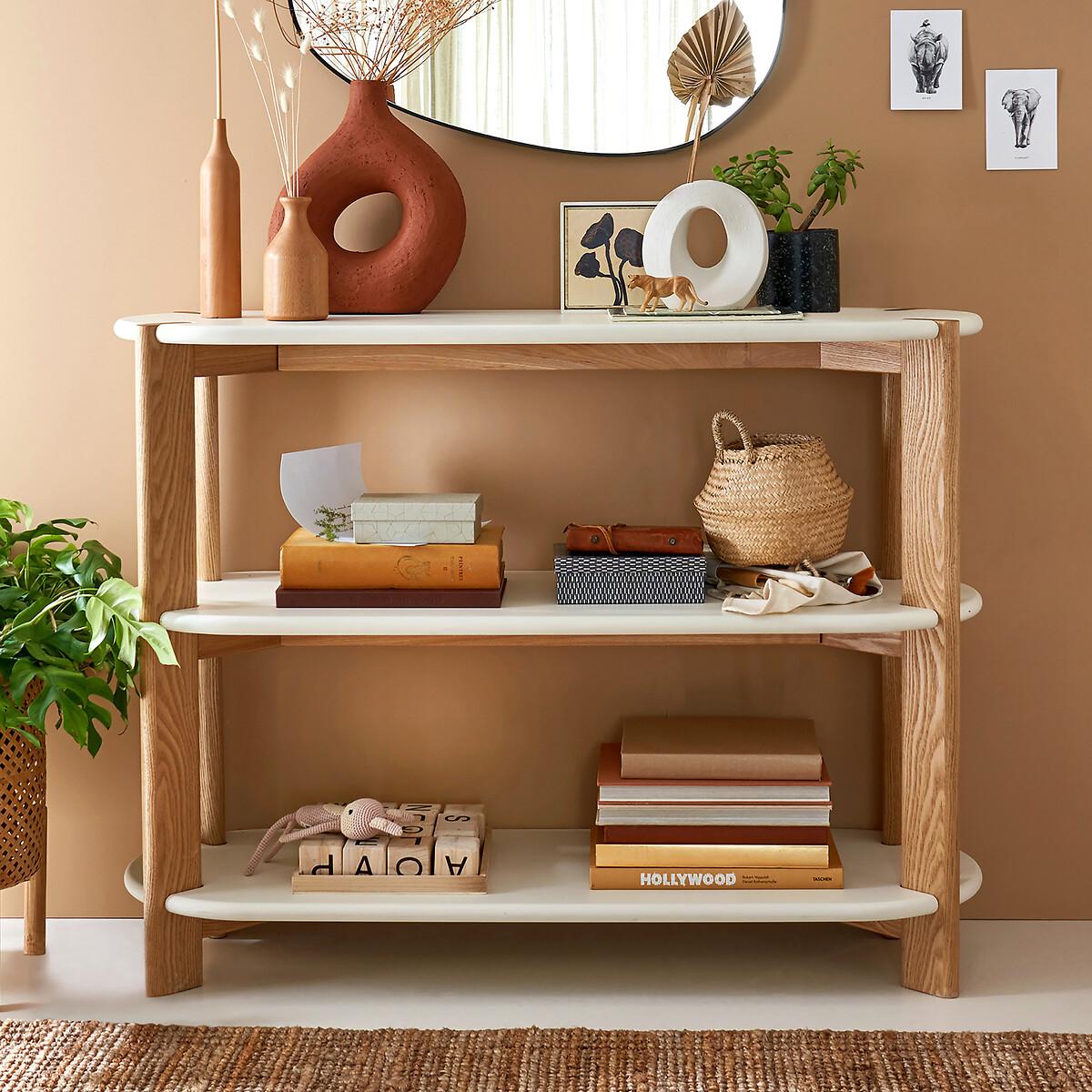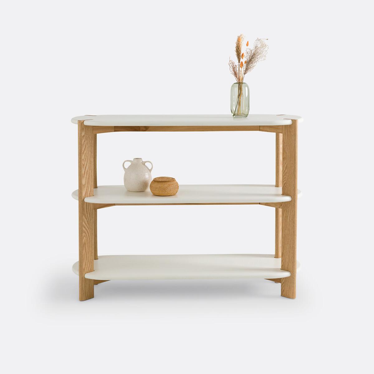 A console with soft and elegant shapes whose aesthetics is characterised by the combination of ash and lacquer. Designed by La Redoute Interiors. Product Details • Organic shaped top, rounded edge in cream white painted MDF, very slightly grainy finish, polyurethane paint • Legs flush with the top in solid ash with clear nitrocellulose varnish finish • Felt padsDimensions. Overall • Width: 121.5cm • Height: 92cm • Depth: 40cm. Usable space • Between shelves:H31.5 x D35cmDelivery:. Assembly required. Available for home delivery. Note! Please check that all access points are large enough to accommodate your delivery (doors, stairs, lifts). • WOOD FROM SUSTAINABLY MANAGED FORESTS. FSC® certified wood comes from forests that are environmentally, socially and economically well managed. Dimensions and weight of parcel1 parcel • L131.5 x H19 x D44.5cm. 43.8kg.
