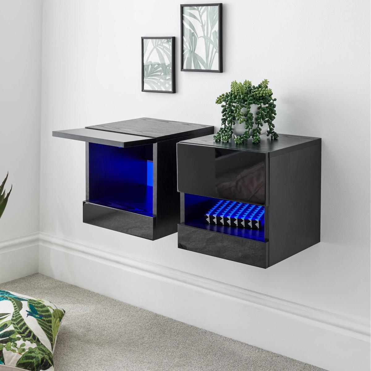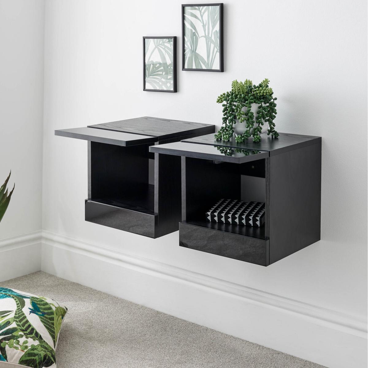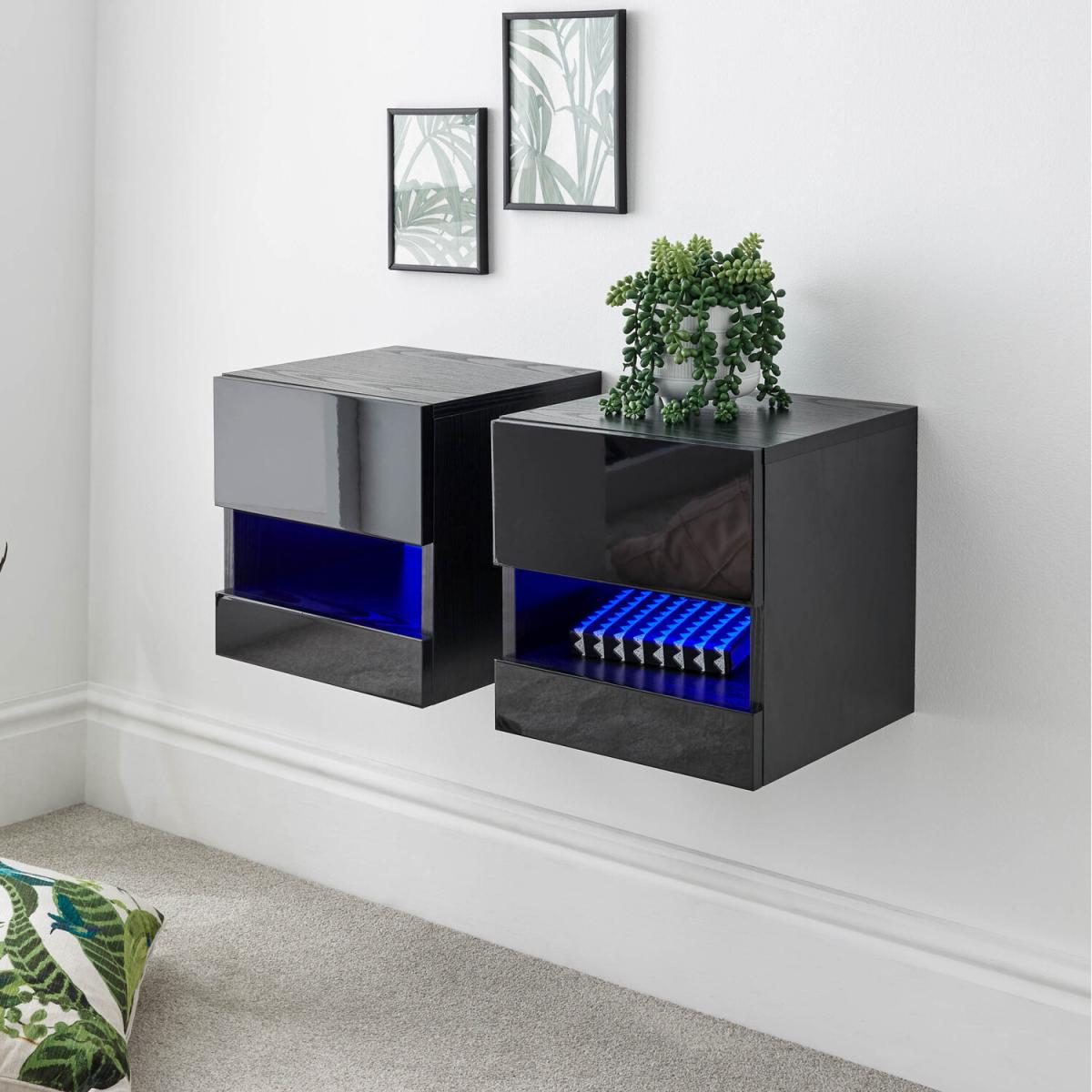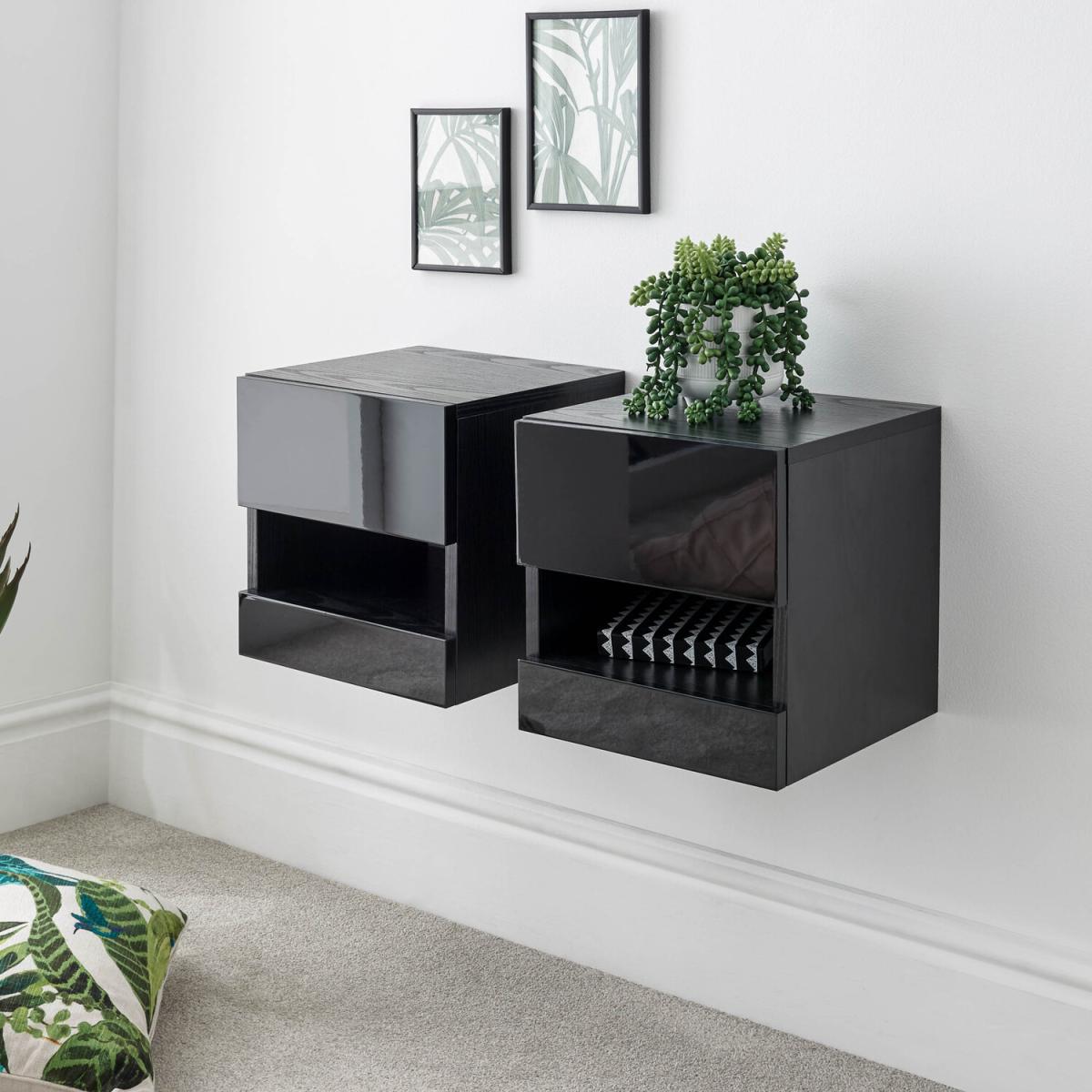 Keep things simple with this stylish pair of bedside cabinets. The cuboid construction offers a practical solution to bedside storage, while the high-gloss monochrome finish is the perfect addition to your modernist, minimalist interior decor. Comprising a single cupboard with a top-hinged flap, wall-mounted Galicia makes a handy base for a lamp, with ample space beneath for books, magazines and other night-time accessories. Available in a choice of white, black or grey with the option of a feature blue battery-powered LED downlight.
