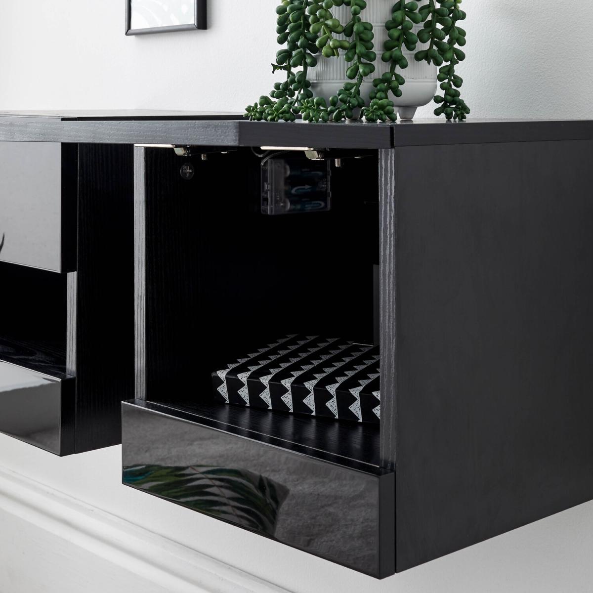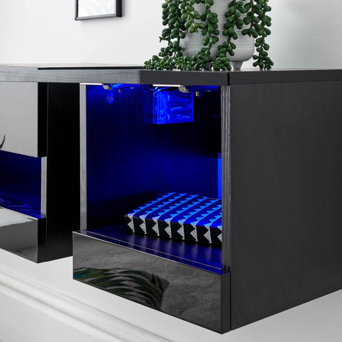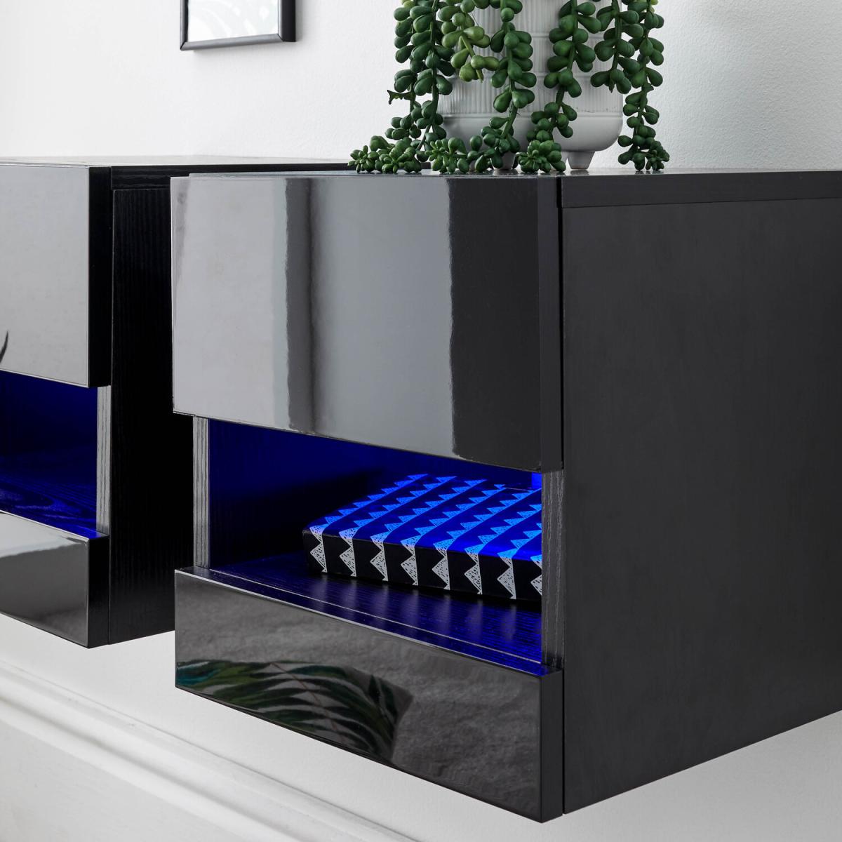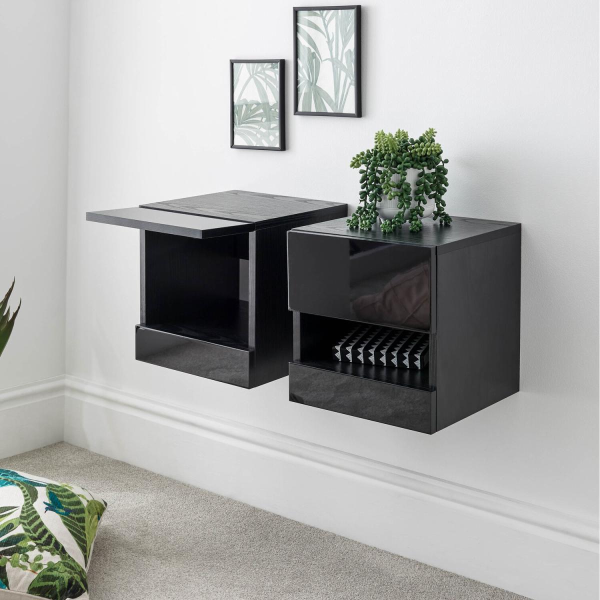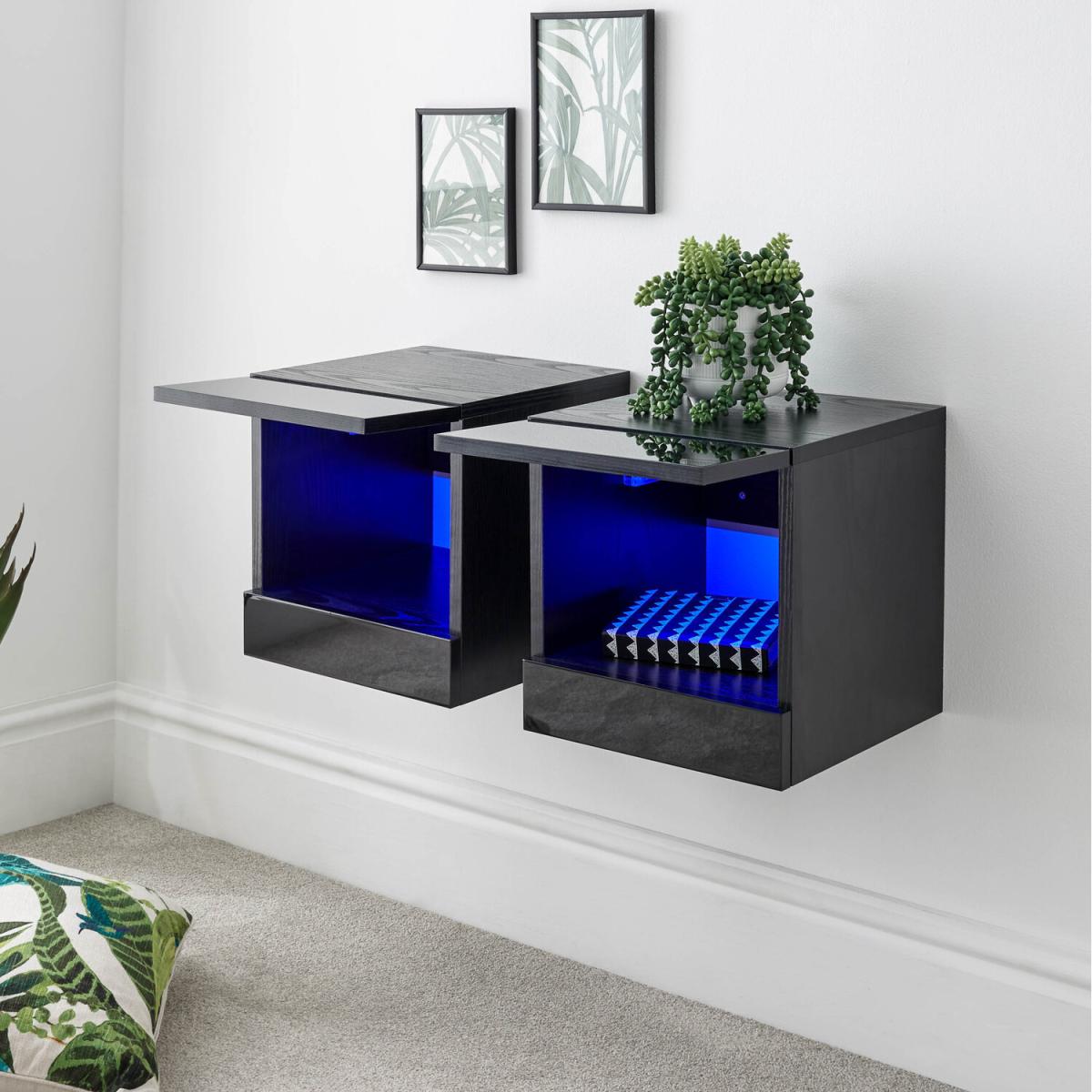 Keep things simple with this stylish pair of bedside cabinets. The cuboid construction offers a practical solution to bedside storage, while the high-gloss monochrome finish is the perfect addition to your modernist, minimalist interior decor. Comprising a single cupboard with a top-hinged flap, wall-mounted Galicia makes a handy base for a lamp, with ample space beneath for books, magazines and other night-time accessories. Available in a choice of white, black or grey with the option of a feature blue battery-powered LED downlight.