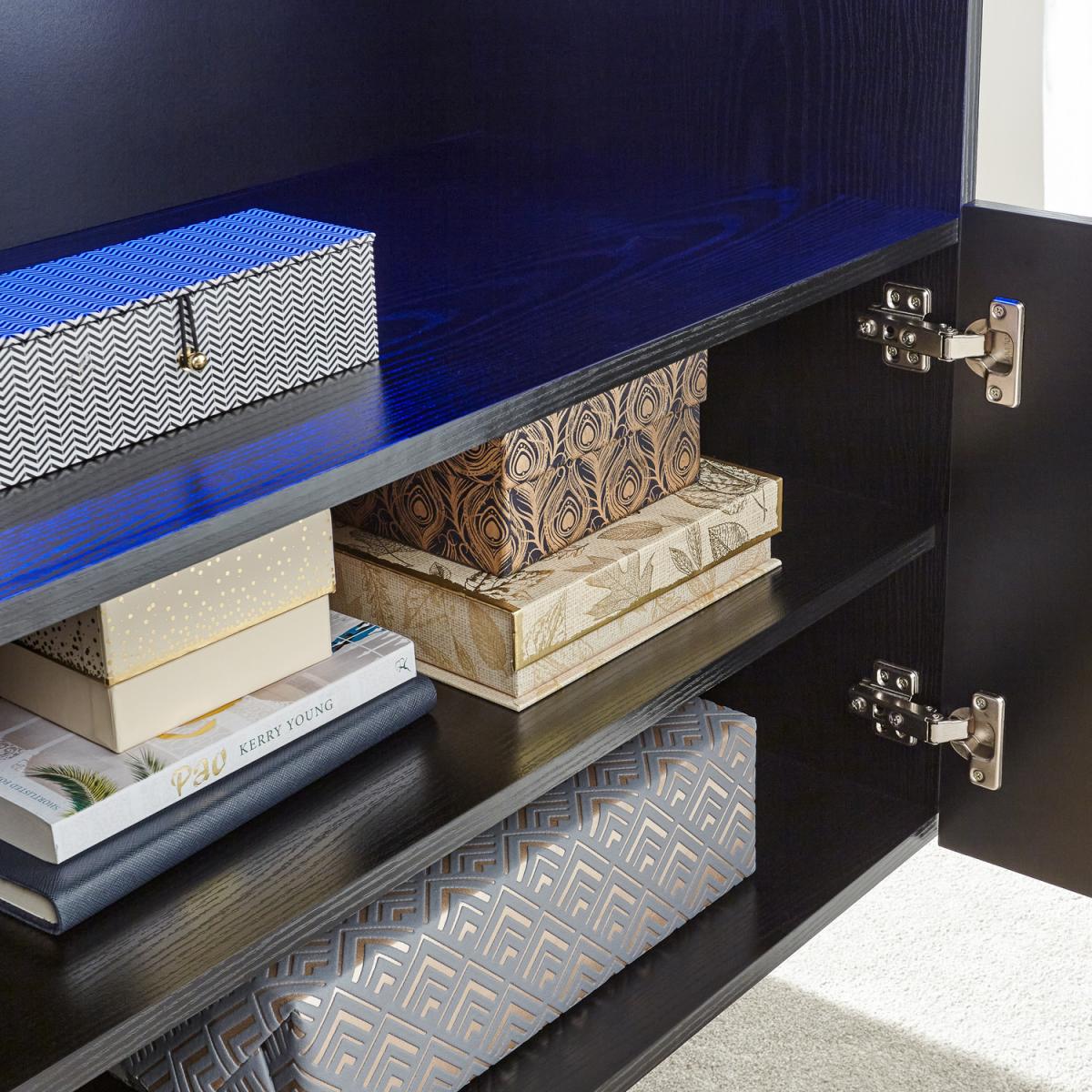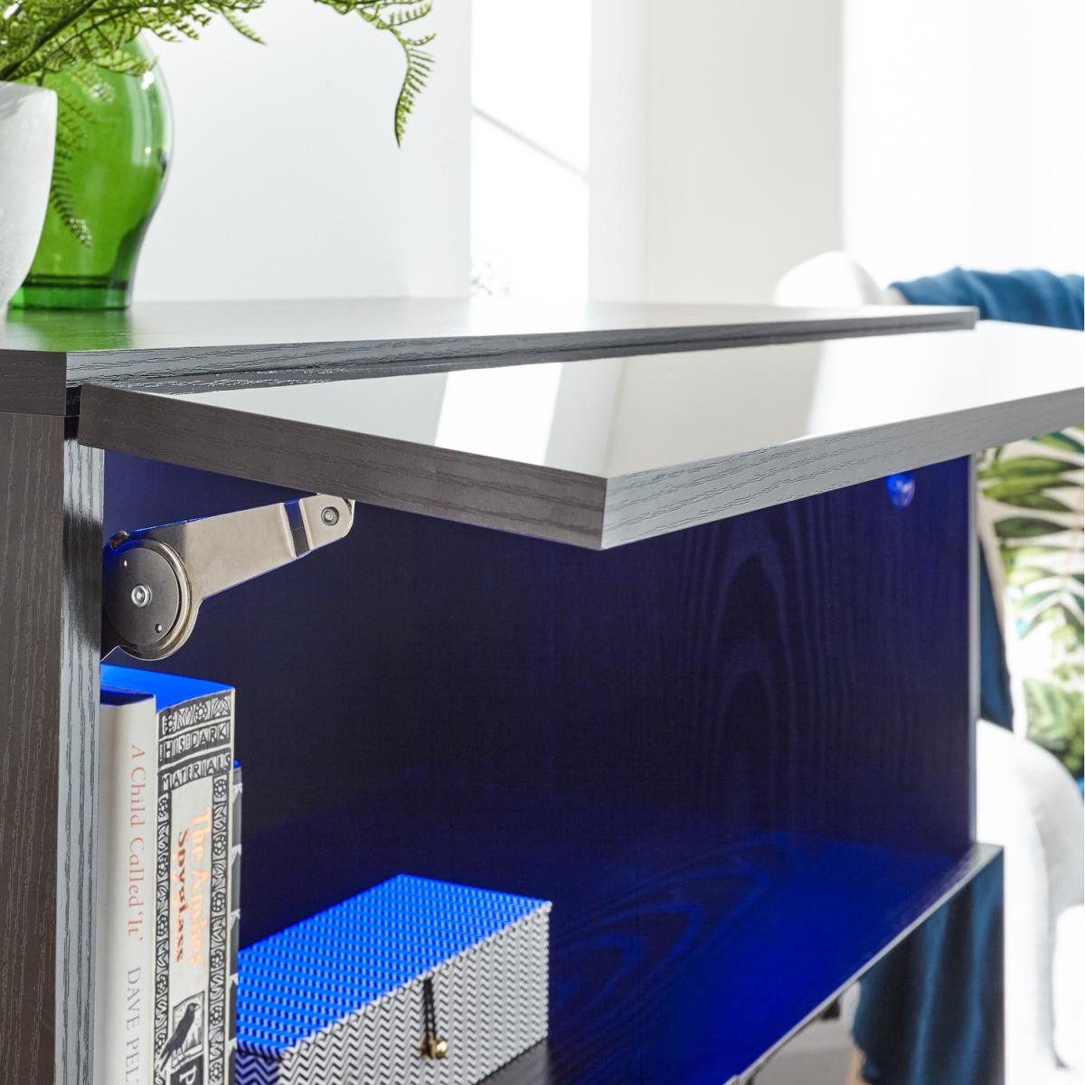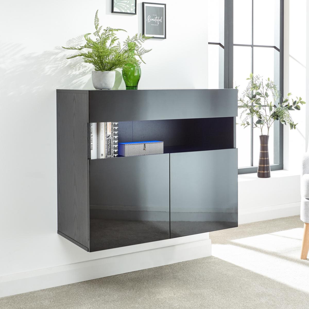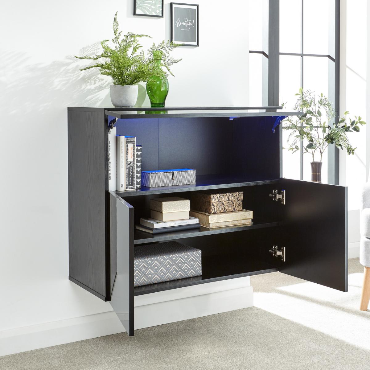 With Galicia, there's simply no need to choose between form and function. The sleek and stylish design couples clean lines with wall-mounted construction to provide an off-the-floor storage option that helps keep your home clutter-free. It offers plenty of space for equipment and accessories and a durable monochrome finish with high gloss feature panels in black, white or grey that will complement any modern interior. The twin-door cabinet is topped by a media shelf with a lift-up panel and a feature blue battery-powered LED downlight that accentuates the front slot.