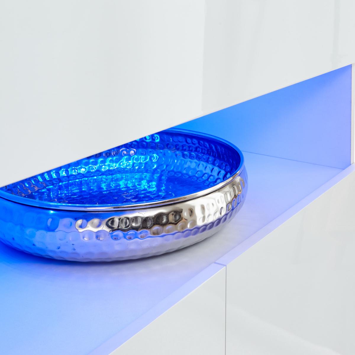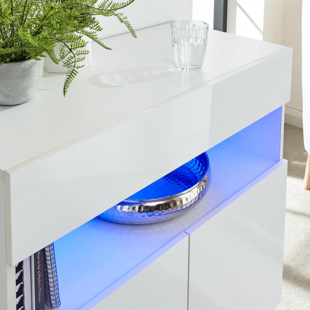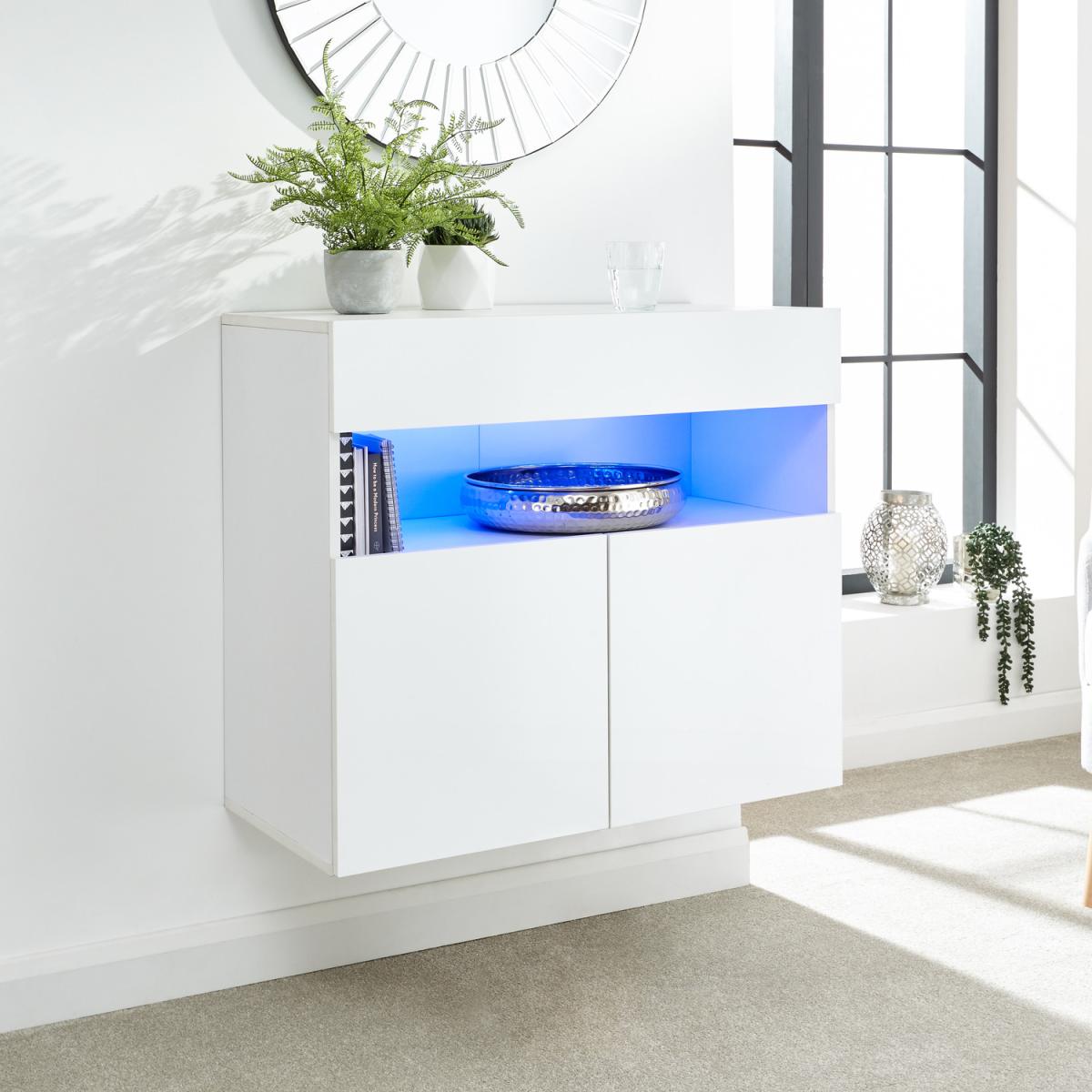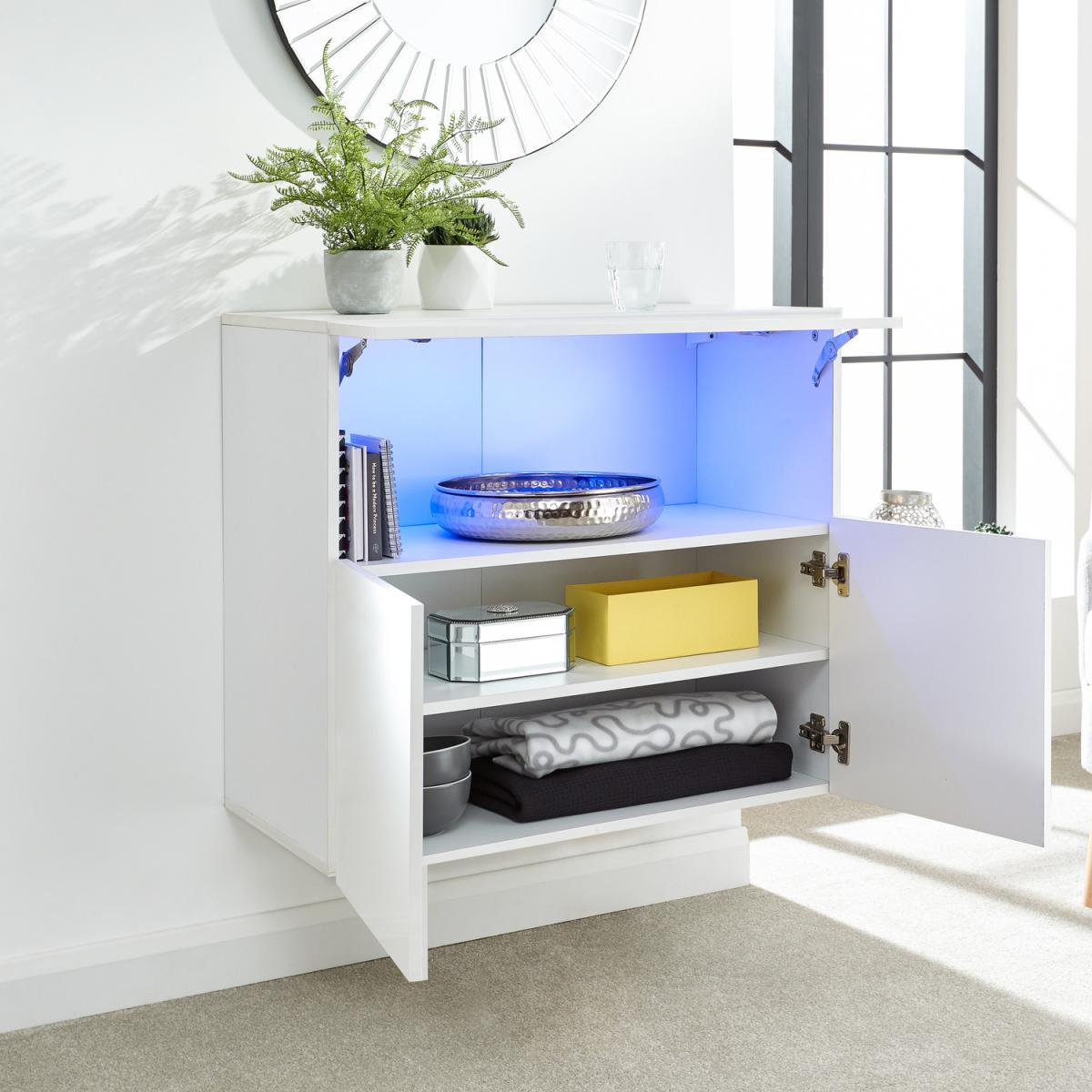 With Galicia, there's simply no need to choose between form and function. The sleek and stylish design couples clean lines with wall-mounted construction to provide an off-the-floor storage option that helps keep your home clutter-free. It offers plenty of space for equipment and accessories and a durable monochrome finish with high gloss feature panels in black, white or grey that will complement any modern interior. The twin-door cabinet is topped by a media shelf with a lift-up panel and a feature blue battery-powered LED downlight that accentuates the front slot.