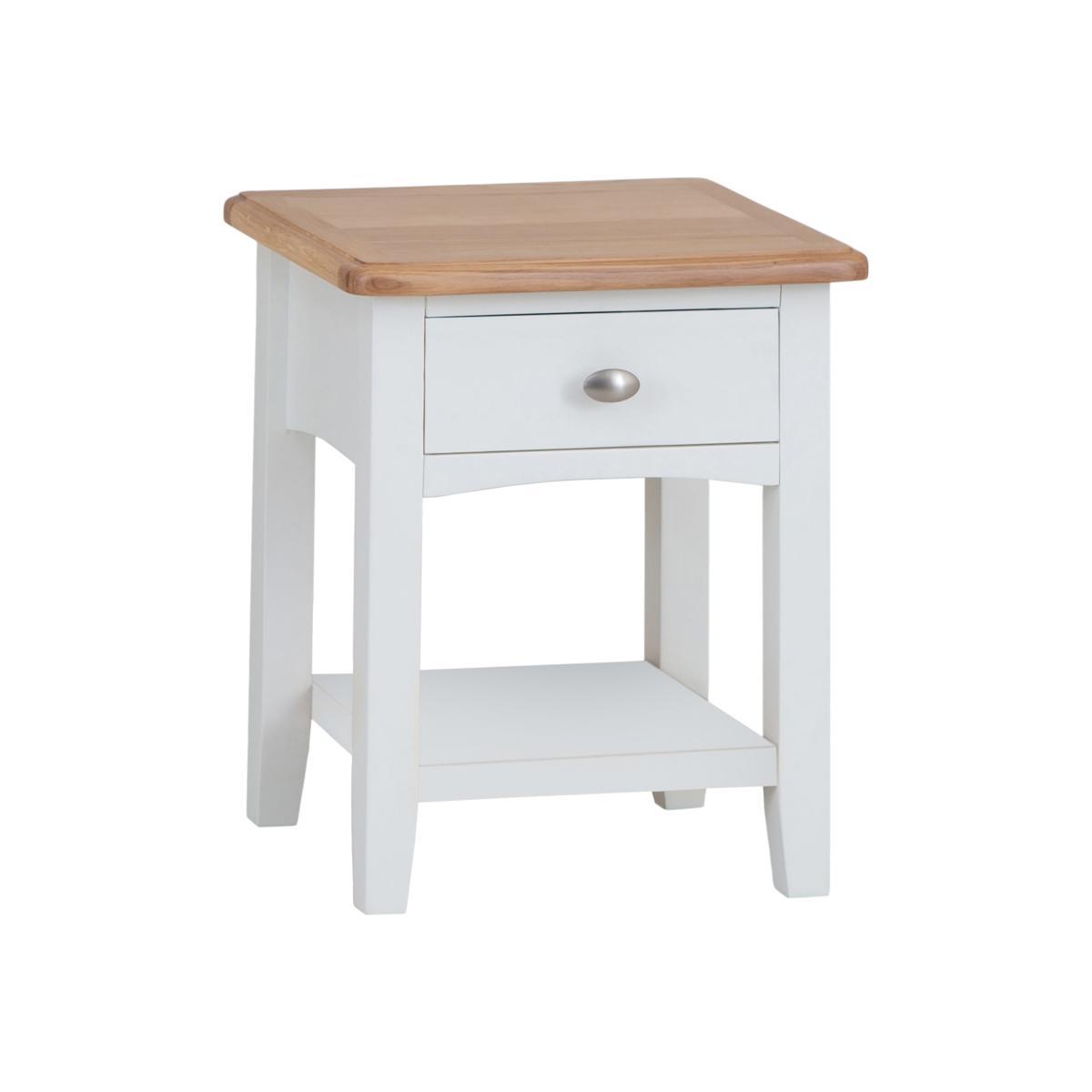 I love this side table for its versatile blend of clean white and natural wood, which makes it a great addition to both classic and contemporary interiors. It works particularly well in coastal, Scandi, or farmhouse schemes, where its fresh look can brighten a space. Practical styling tips include using it to hold a reading lamp and a small tray for personal items, or styling the shelf below with decorative baskets or plants for added texture. Its compact size makes it ideal beside a sofa or bed, providing both function and visual appeal without overwhelming smaller spaces.
