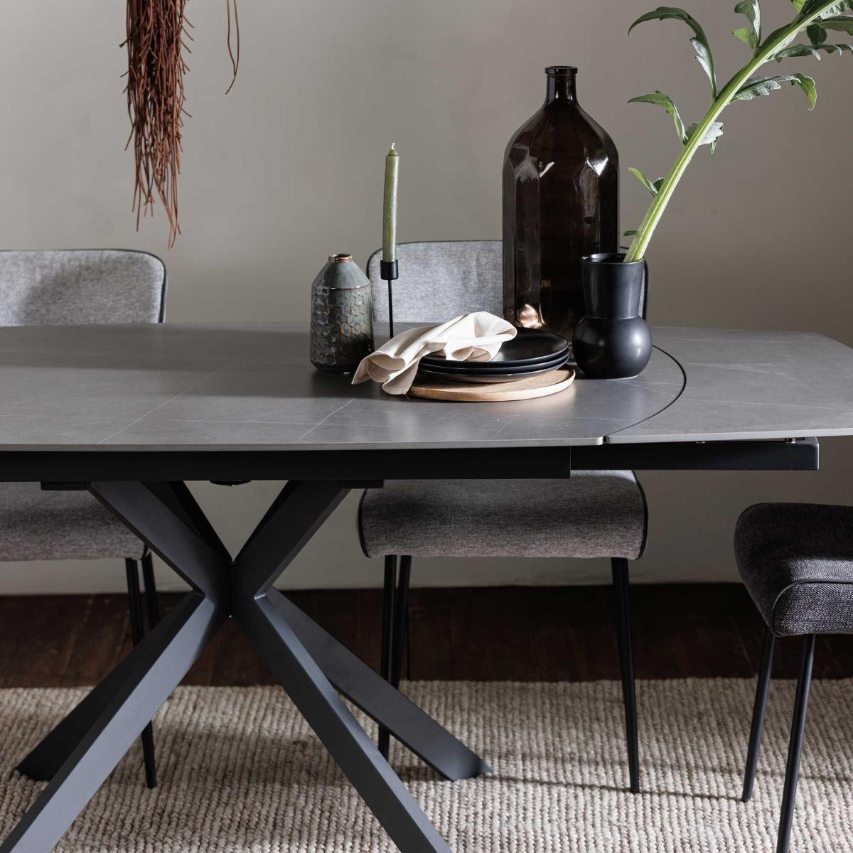 I’m a fan of the Galini stone table for its clean lines and the subtle contrast between the matt grey top and the angular metal base - it feels right at home in modern, industrial or minimalist schemes. The extending mechanism is straightforward, so you can go from an everyday four-seater to hosting six or eight without losing any of its sculptural appeal. Styling-wise, keep the look uncluttered: mix in mid-century or leather-upholstered chairs for texture, then add a simple runner and a low ceramic bowl or vase as a centrepiece to protect the surface. In an open-plan room, anchor the table with a low-pile rug in a geometric tone-on-tone pattern, and introduce a few potted succulents or herbs to bring a hint of warmth without overwhelming the grey palette.