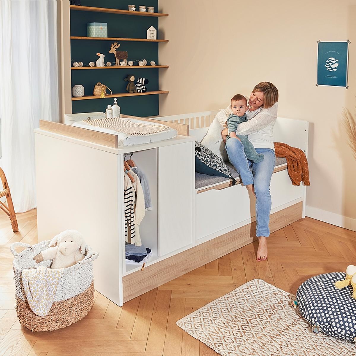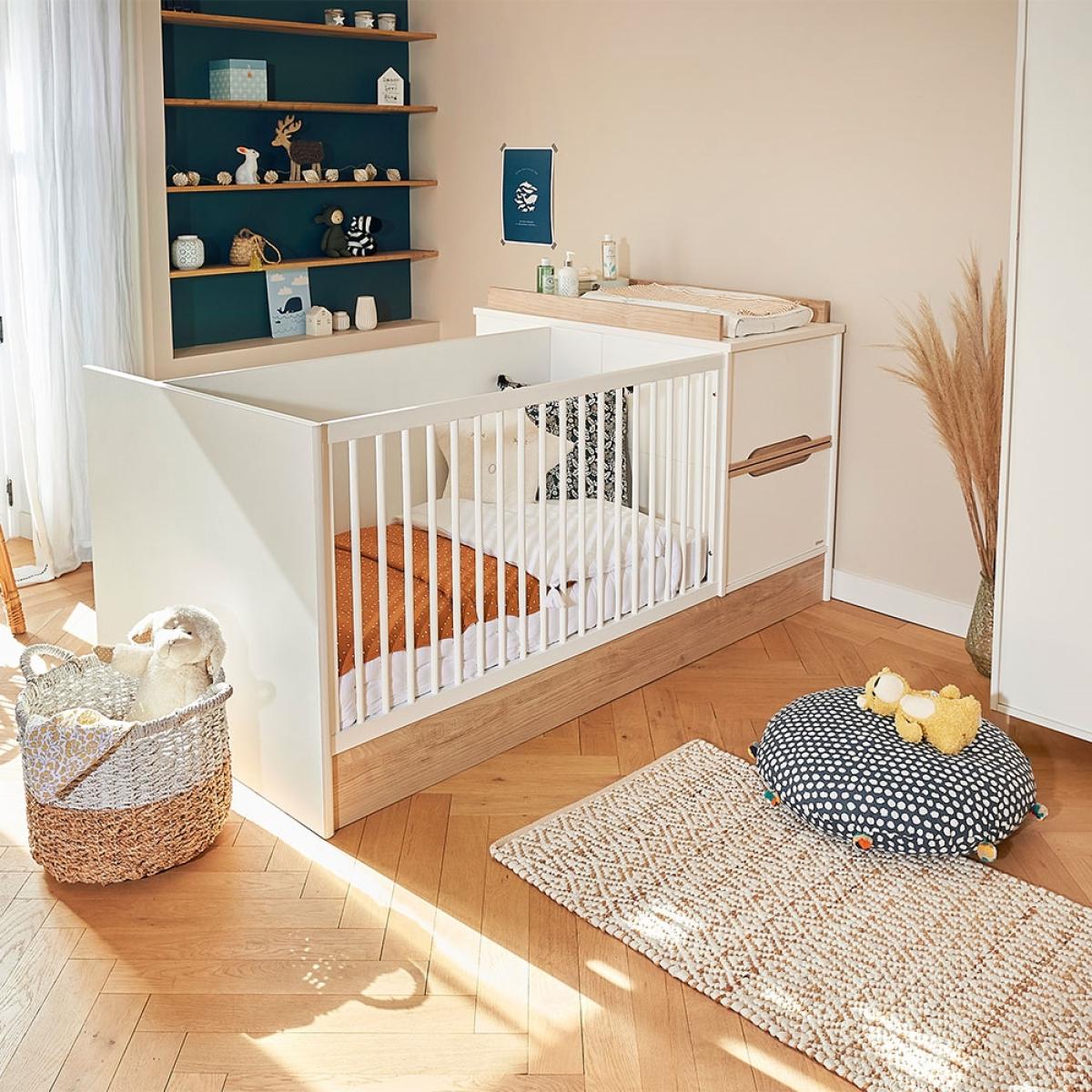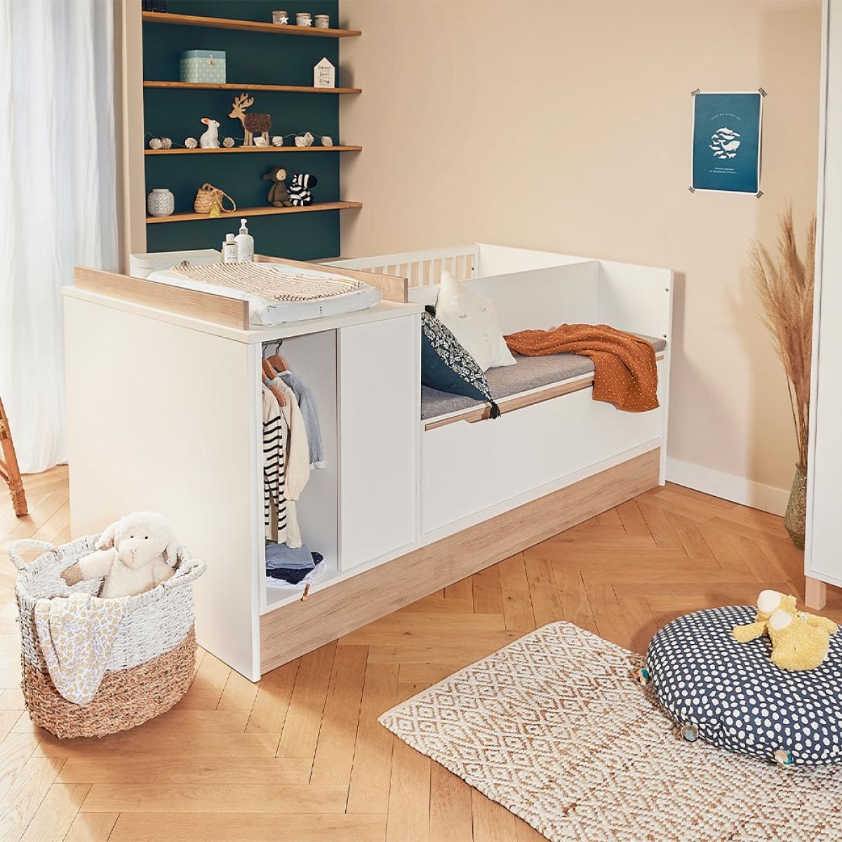 The sustainably made 5-in-1 Galipette Celeste Convertible Compact Cot Bed saves on floor space! Combining a cot bed, chest of drawers, changing table, hanging rail and bench seat - you and your baby will have everything needed, in one compact space. Suitable from birth, adjust the mattress height at two levels - depending on your needs. To avoid bending and straining, the first level is perfect during the first few months! To the side of the cot - the chest of drawers, with changing table above, will get a lot of use! Hang clean outfits on the hanging rail, to the other side, and you'll only have to nip round to grab everything you need. Hooray for compact cot beds! And when your little bundle is changed, clean and comfortably tucked up in their cot - you can have a rest on the bench - you're going to need it! Once the Celeste compact cot bed has been outgrown, continue using the frame. Transforming into either a toddler bed with built-in storage or a kids desk - you'll get many years from this multi-functional marvel!.