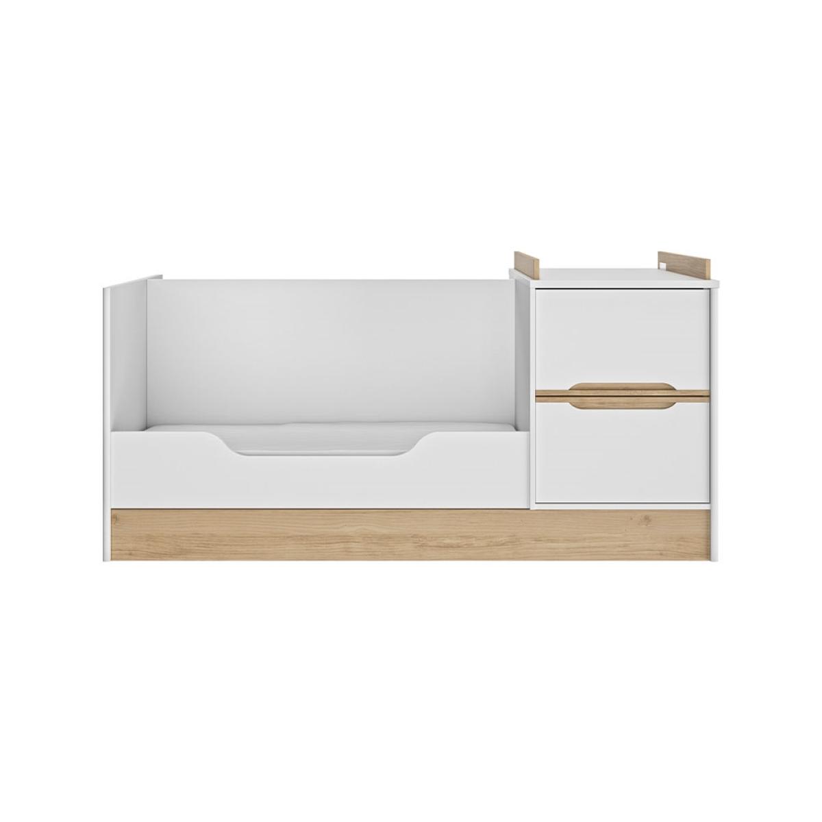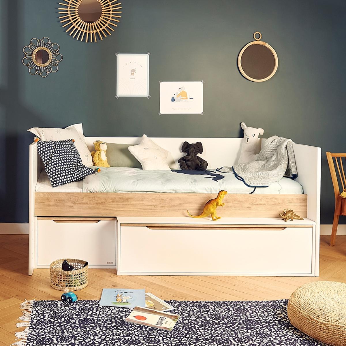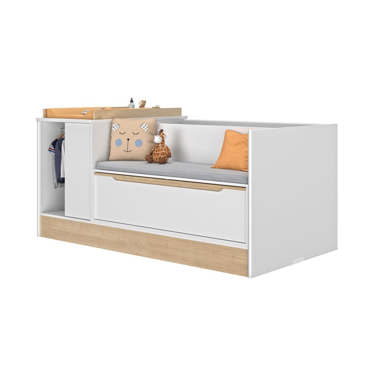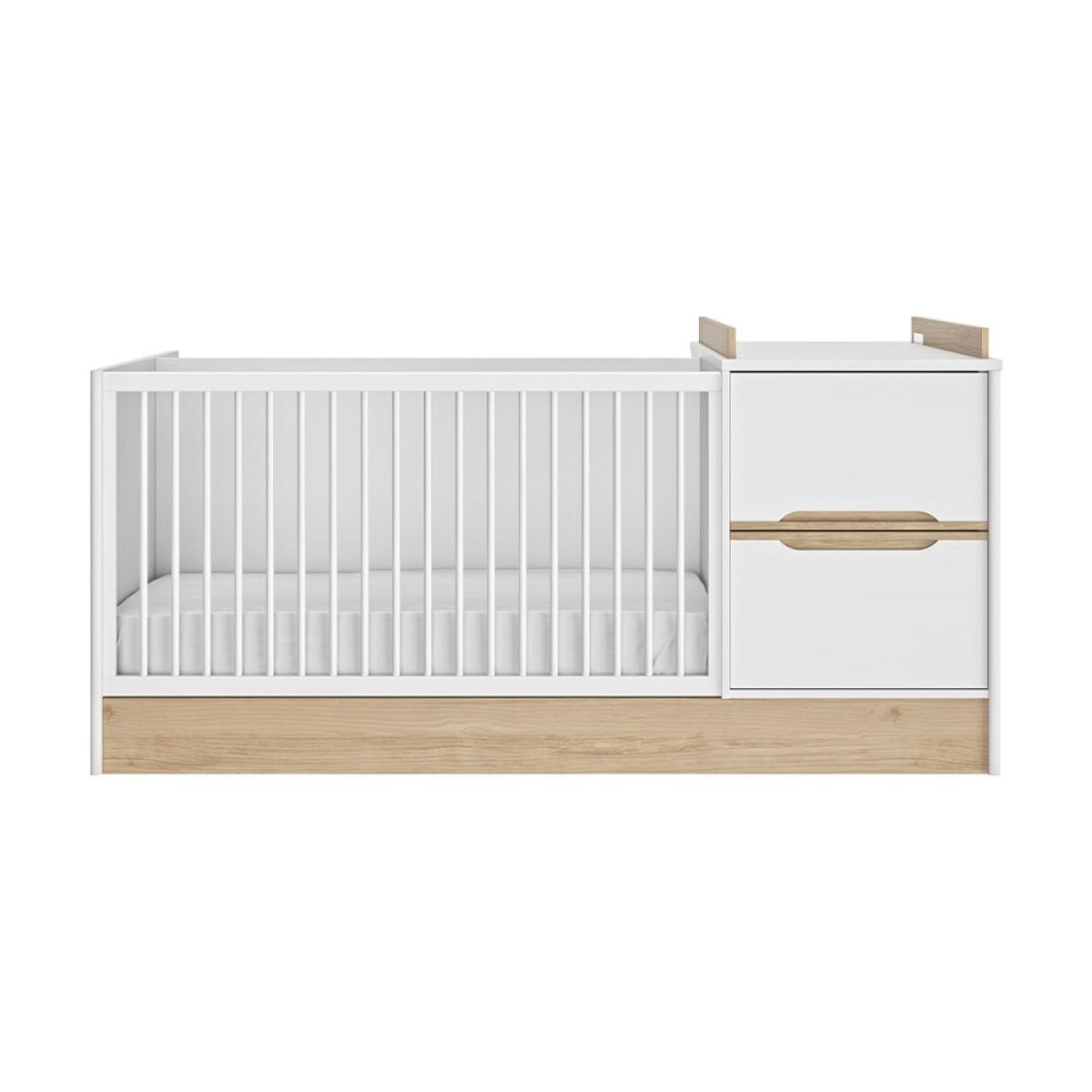 The sustainably made 5-in-1 Galipette Celeste Convertible Compact Cot Bed saves on floor space! Combining a cot bed, chest of drawers, changing table, hanging rail and bench seat - you and your baby will have everything needed, in one compact space. Suitable from birth, adjust the mattress height at two levels - depending on your needs. To avoid bending and straining, the first level is perfect during the first few months! To the side of the cot - the chest of drawers, with changing table above, will get a lot of use! Hang clean outfits on the hanging rail, to the other side, and you'll only have to nip round to grab everything you need. Hooray for compact cot beds! And when your little bundle is changed, clean and comfortably tucked up in their cot - you can have a rest on the bench - you're going to need it! Once the Celeste compact cot bed has been outgrown, continue using the frame. Transforming into either a toddler bed with built-in storage or a kids desk - you'll get many years from this multi-functional marvel!.