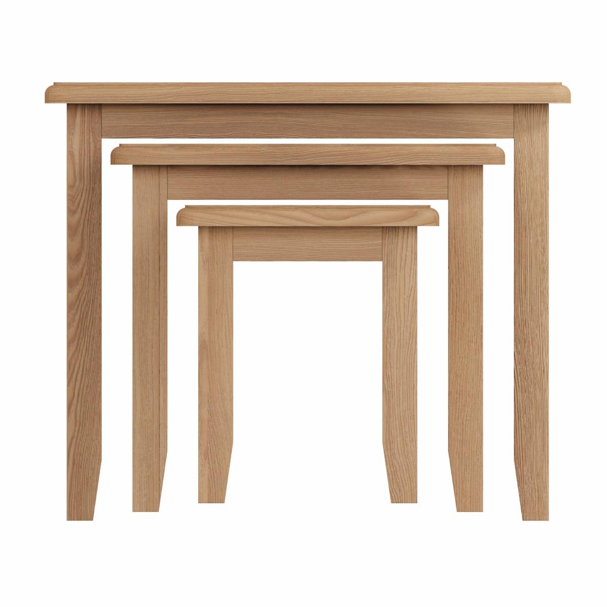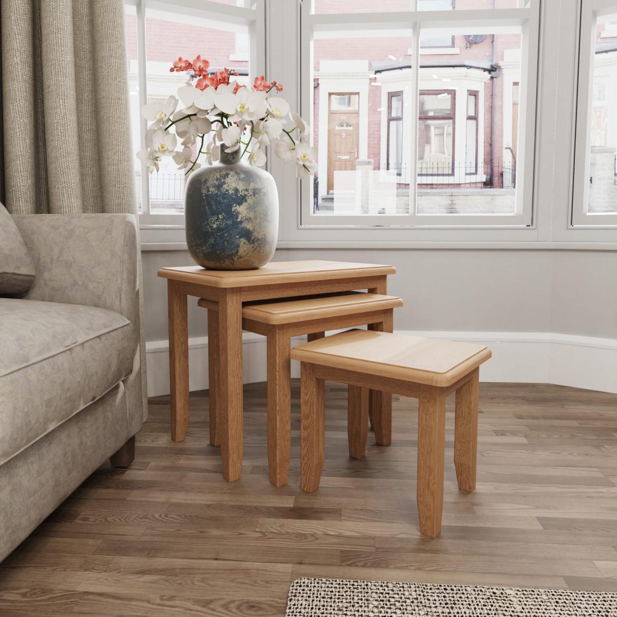 I love this set because the light oak finish offers a versatile and timeless look that can complement both modern and traditional interiors. It’s a practical choice for adding extra surface space without cluttering, ideal for small living rooms or bedrooms. These nest of tables work particularly well in Scandinavian-inspired schemes or neutral-toned schemes, bringing warmth and texture. For styling tips, try stacking books or placing a small lamp on the top, and use the smallest as a side for drinks or snacks. Keep the arrangement simple and minimal to highlight the natural grain of the oak, and you’ll find it’s a great way to add functionality with style.