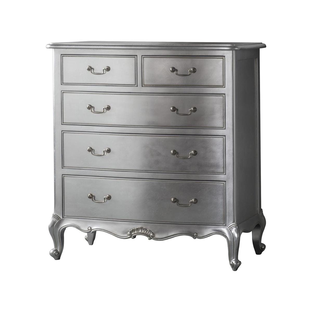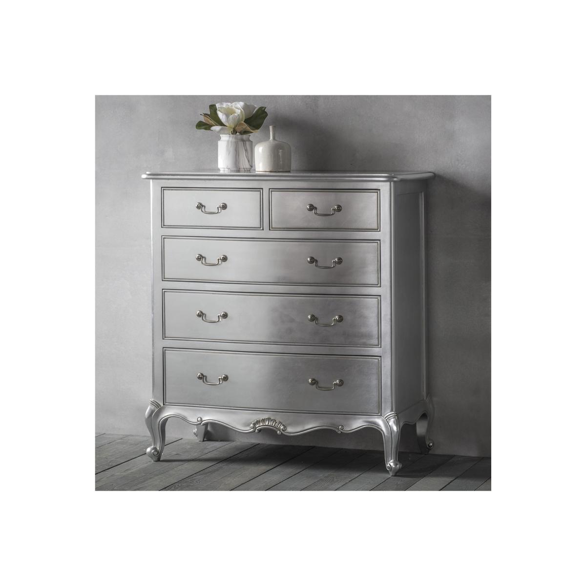 Elegant and sophisticated design Stunning antique silver handle Silver leaf finish Features 2 small drawers and three large drawers No assembly required