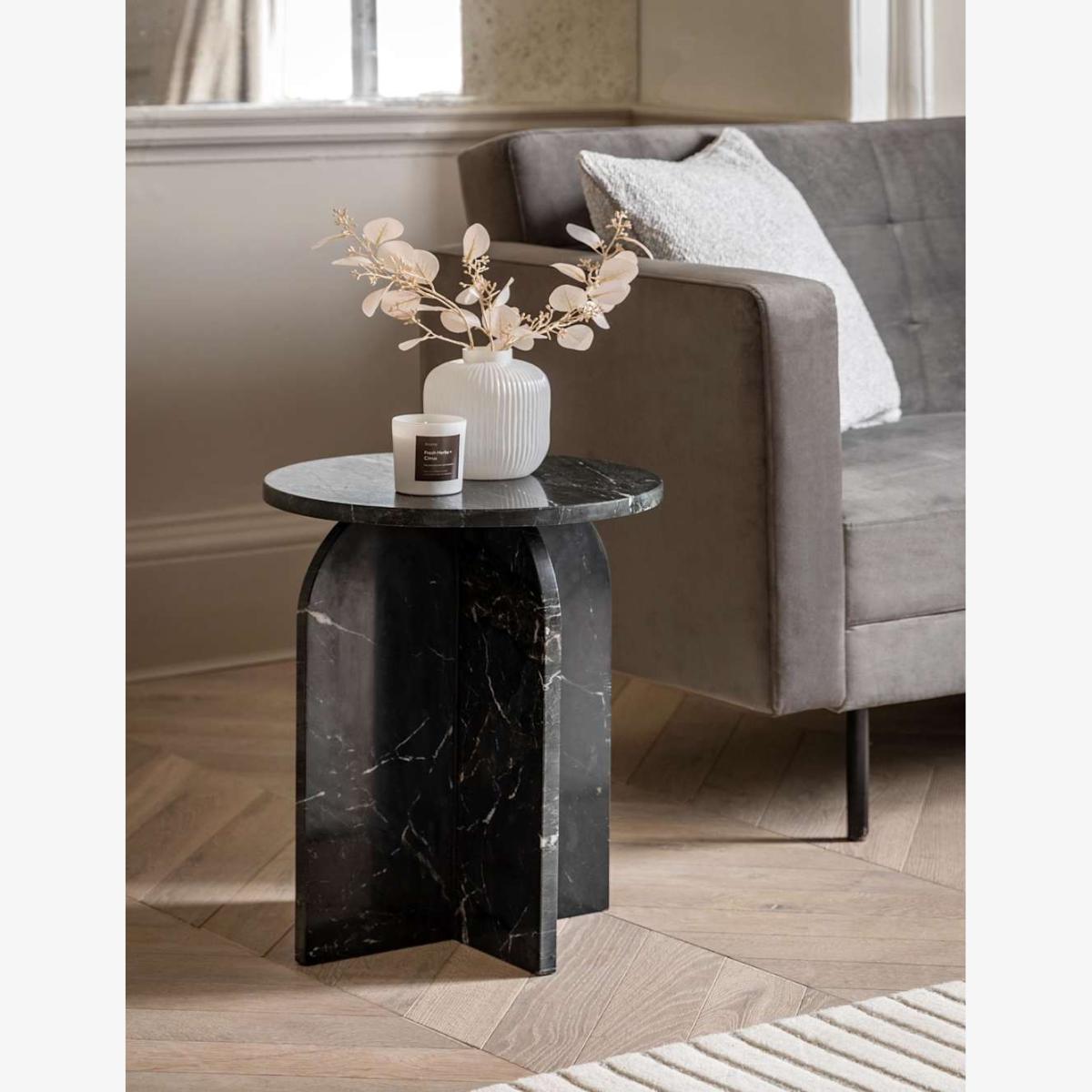 I’m a big fan of the Amalfi side table for its clean lines and dark marble-effect finish, which feels at once modern and architectural. It sits equally well in a pared-back Scandi living room or a more maximalist space where it can offer a tonal anchor. Styling-wise, keep it simple - try a small sculptural vase and a candle or a couple of design books to emphasise its form. As a bedside or sofa-side table, it works nicely alongside a soft linen cushion or a slim-legged sofa, adding contrast without overwhelming the overall look.