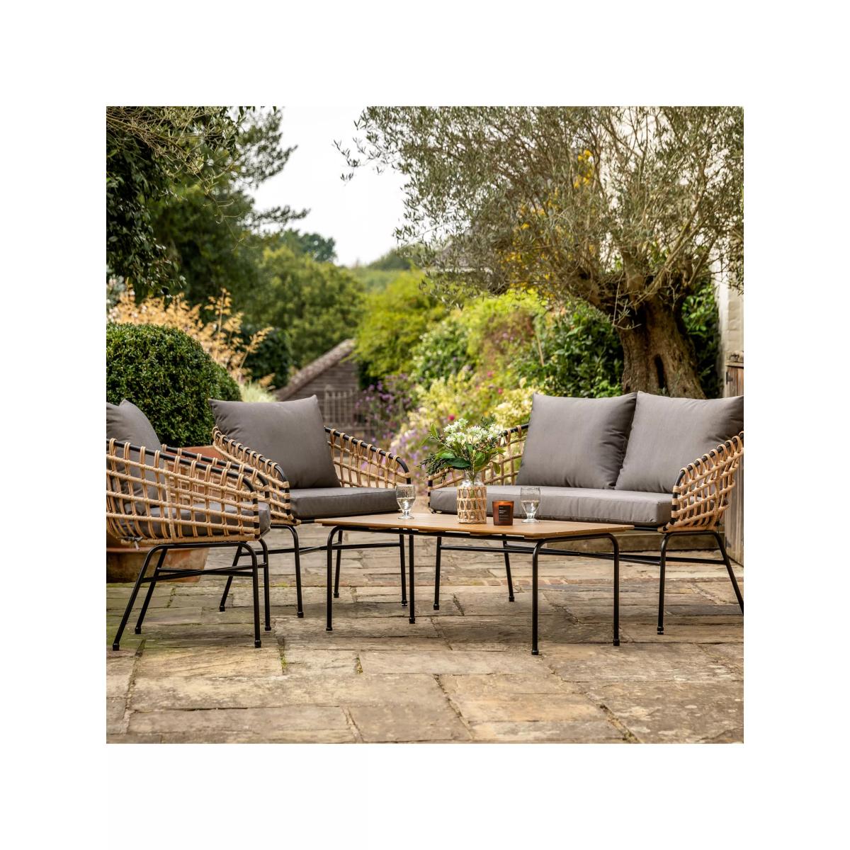 An updated take on rattan furniture, this Antigua garden lounge set from Gallery Direct seats up to four people. The set includes a stylish two-seater sofa and two armchairs with eye-catching woven detail around the sides and back in 5mm round wicker weaving. These are complemented by the simple acacia wood-topped rectangular coffee table. All are made with slim-profile yet robust powered-coated steel frames. Shower-resistant seat and backrest cushions add comfort.