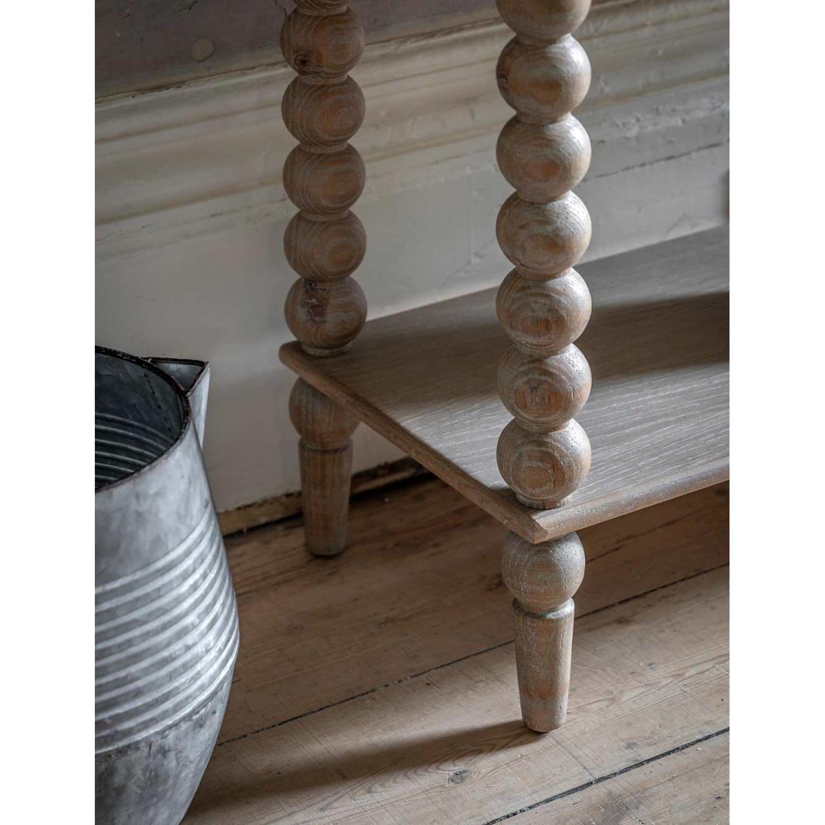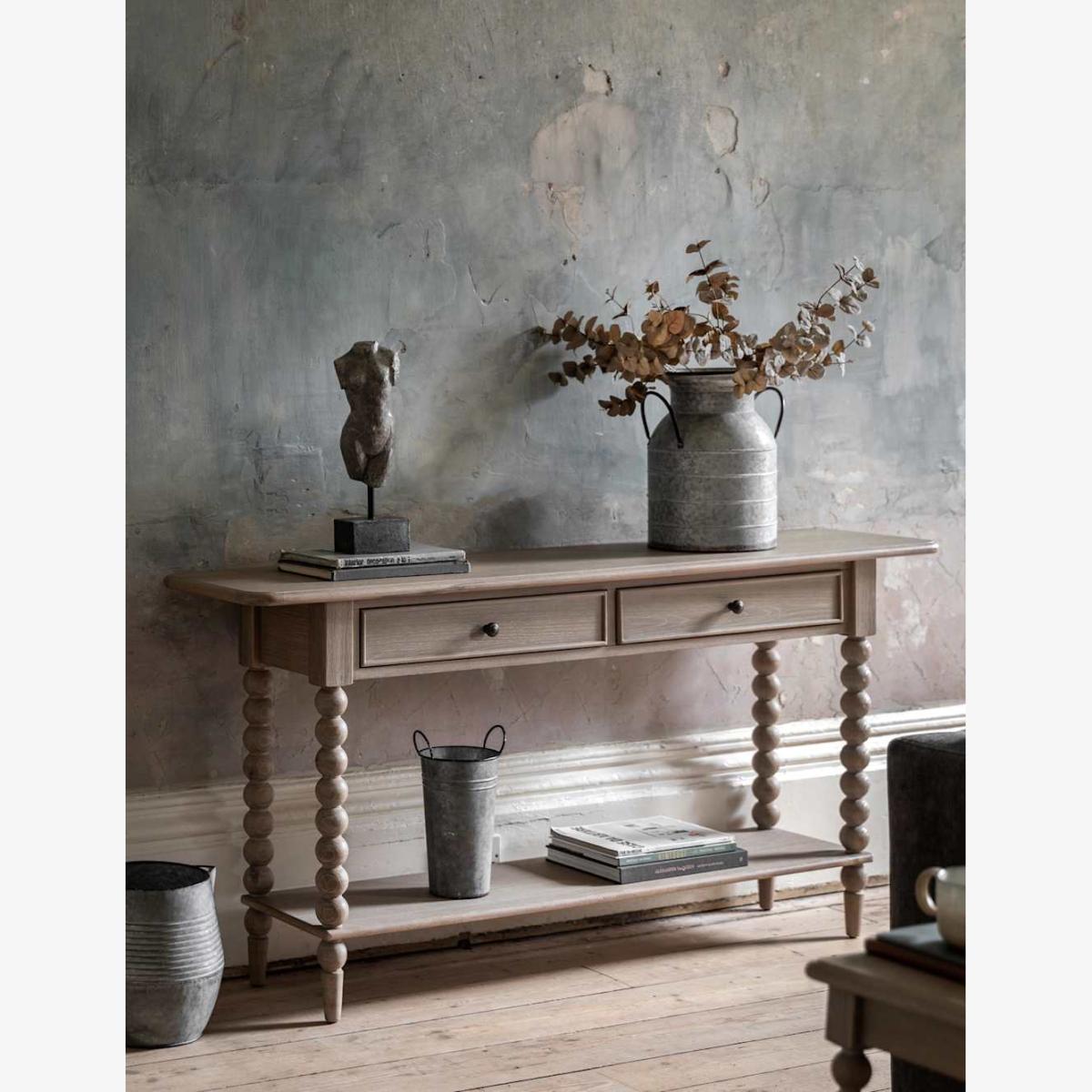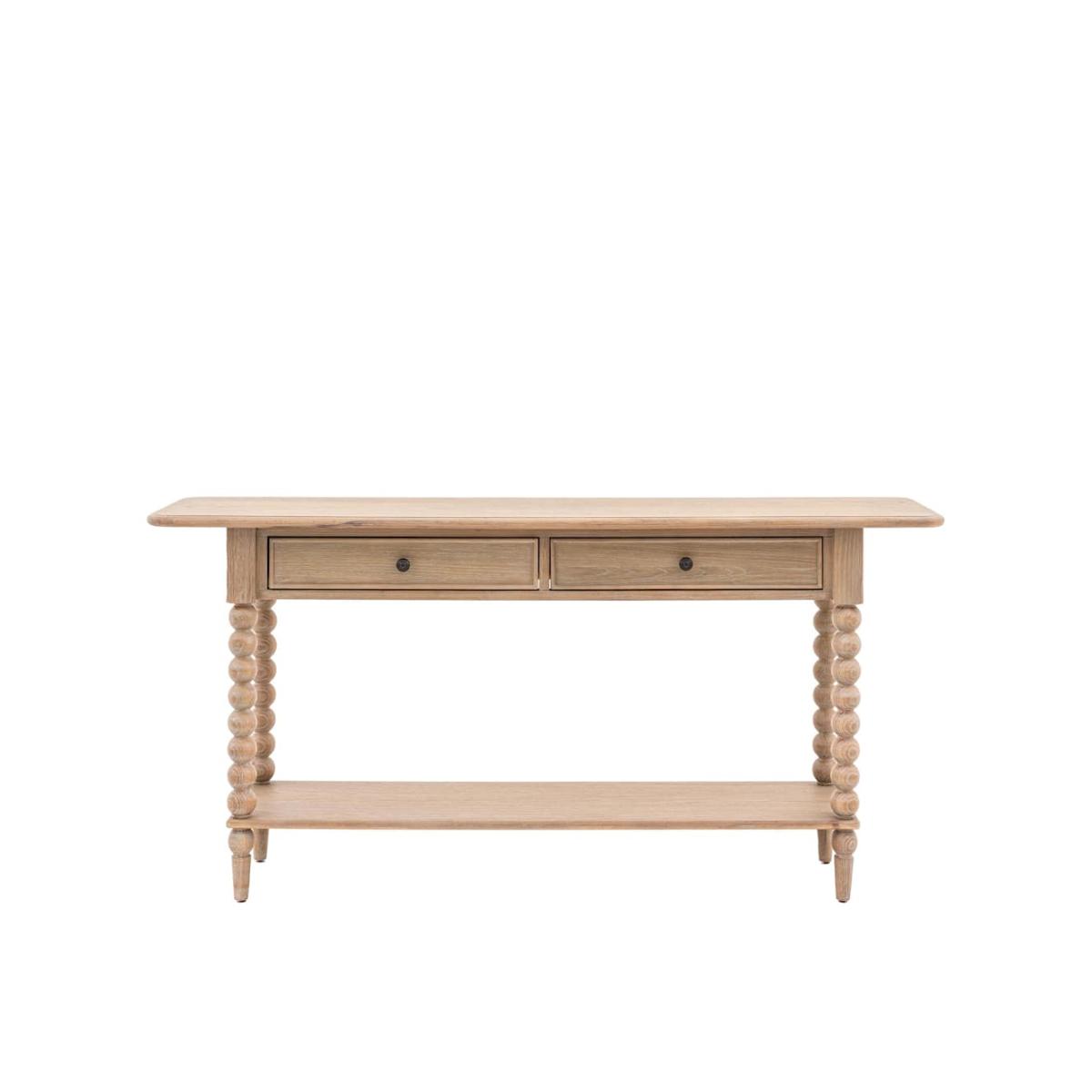 This elegant console table from Gallery Direct will become the focal point of any room. It's made with a beautiful lime-washed oak finish for a light, natural look. This table offers plenty of storage space, with two drawers plus an open shelf at the bottom. Charming, hand-turned bobbin legs complete the striking design.