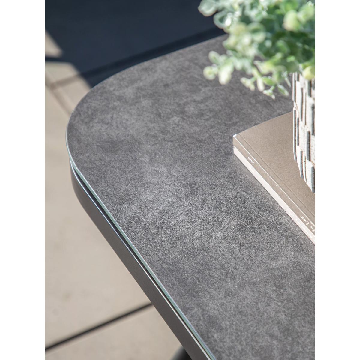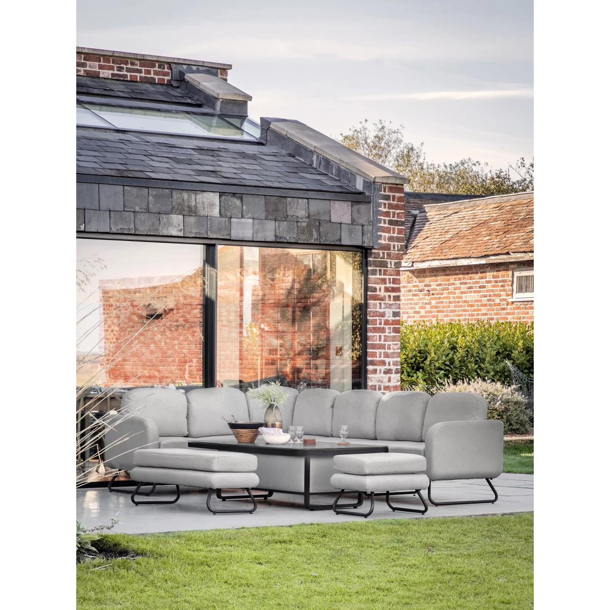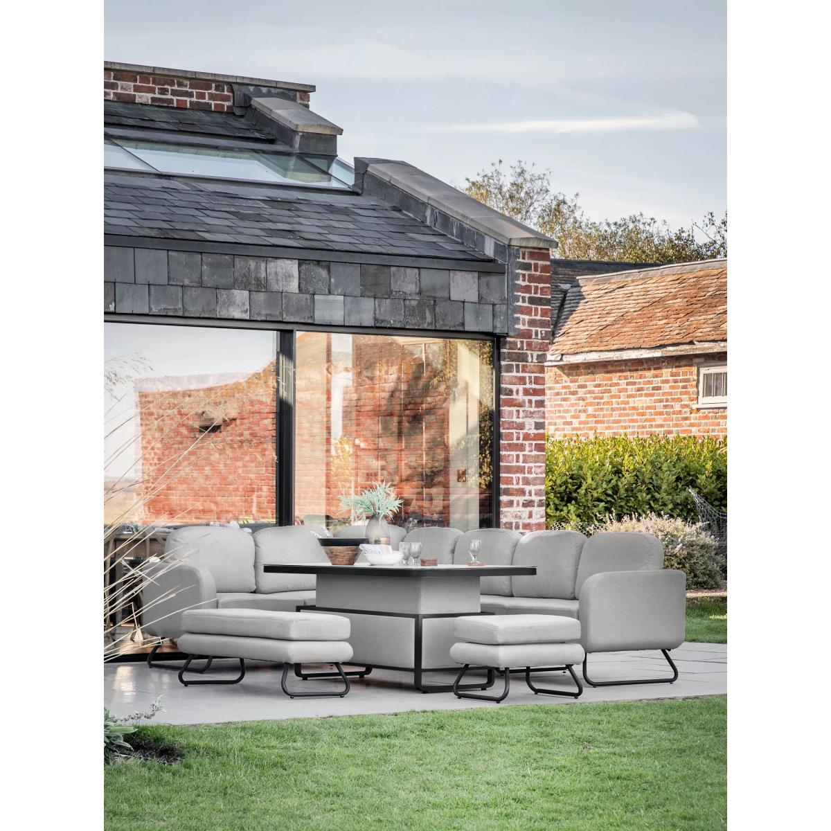 Designed to add a touch of luxury to your outdoor space, for dining or relaxing with a drink, this stunning and contemporary Askern dining set from Gallery Direct features a rectangular rising table, corner sofa, bench and stool. The rising table has a glass top with a ceramic-effect finish and offers great flexibility as it easily converts from a dining table to a coffee table. The table and seats have robust aluminium frames, and the seats are fully upholstered in all-weather fabric, which is stain, mould and fade-resistant. The seats are padded with quick-drying foam for comfort and the set comes with seating covers to help keep them clean. Key features: Corner sofa, bench and stool seating up to 10 Rectangular coffee table with ceramic-effect top converts into a dining table Robust aluminium frames Stain, mould and fade-resistant upholstered seating with covers included Matches furniture in the Askern range