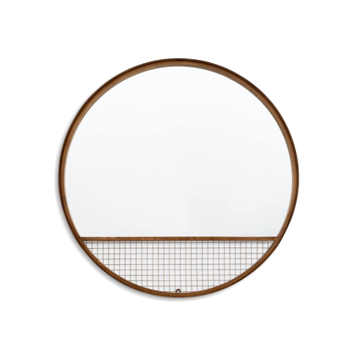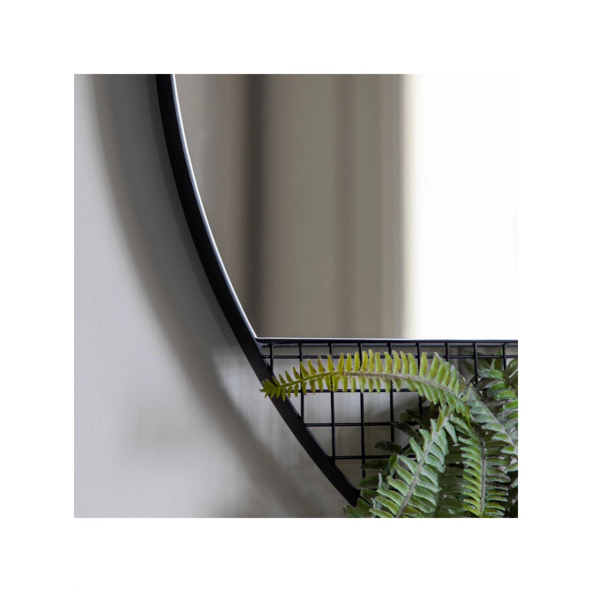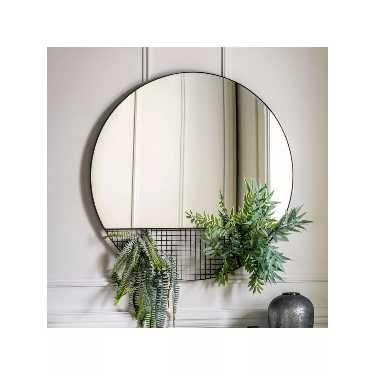Round metal frame wall mirror with a caged wire section. Add some floral or foliage displays to your wall on the wire or use it in your bedroom to hang accessories. Easy to wall mount by the fittings on the back of the mirror. Have you thought about wall hooks and fittings?