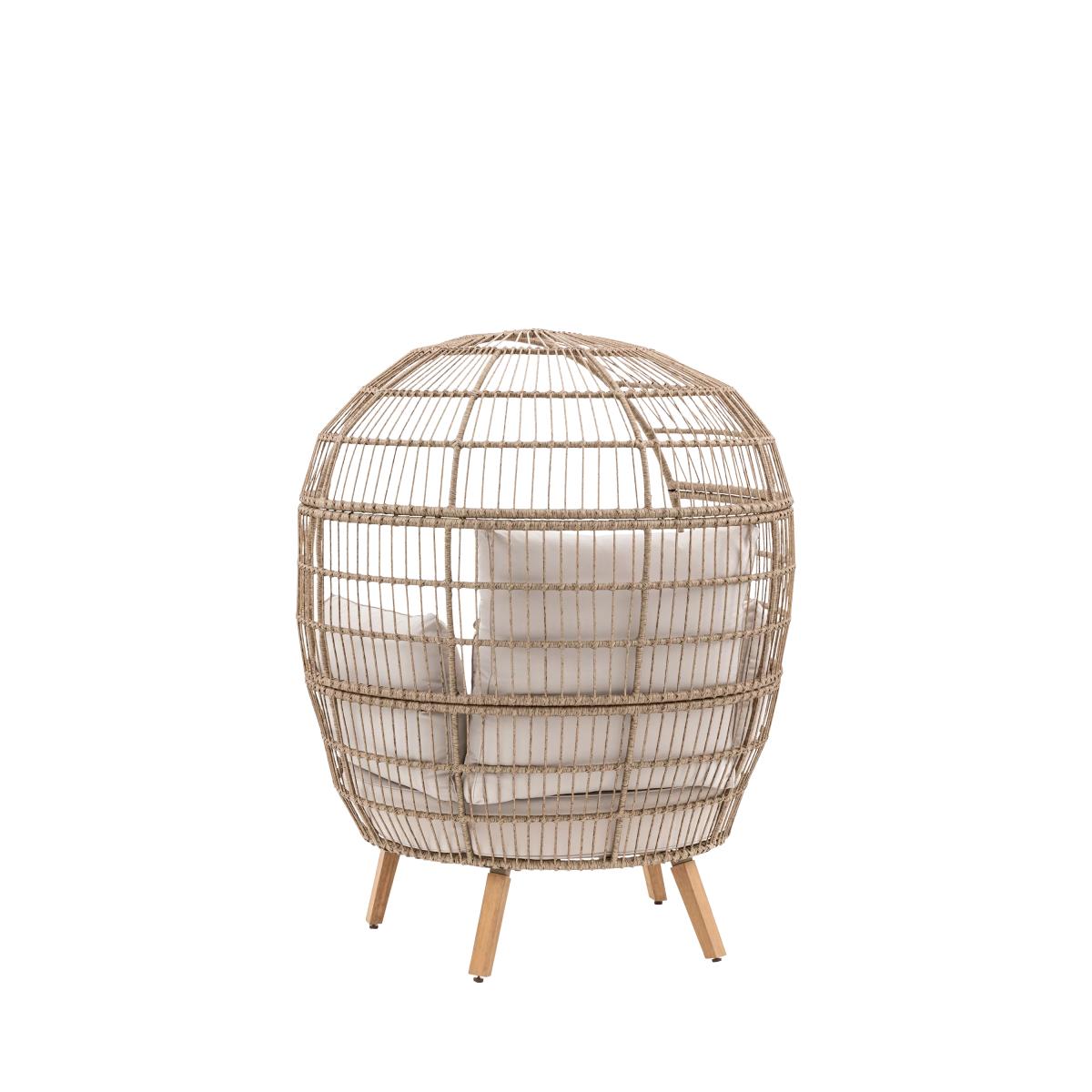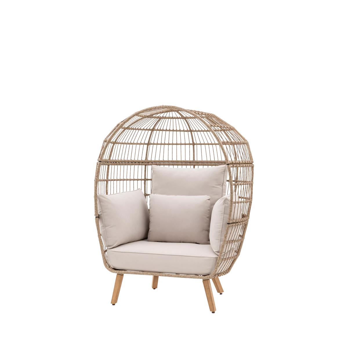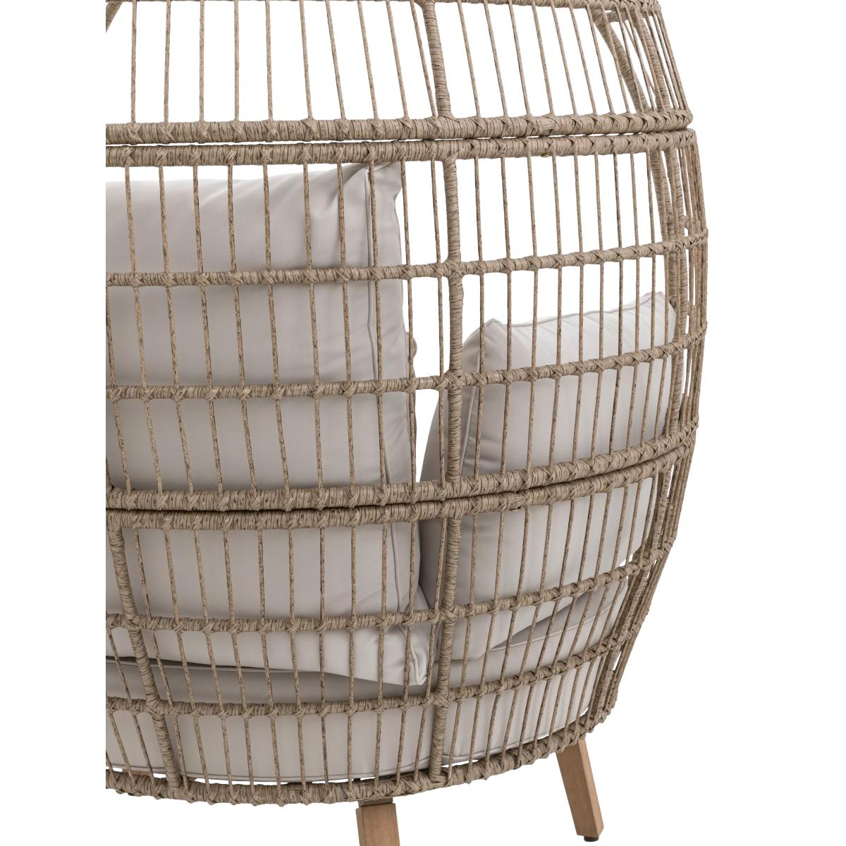 Indulge in ultimate relaxation with this luxurious and stylish egg chair. The woven rattan frame creates a cosy and private cocoon, while the plush seat and backrest cushions offer unparalleled comfort. The chair's elegant design and neutral colour palette make it a welcome addition to any outdoor space. Finished with beautiful angled acacia wood legs. Key features: Egg garden chair Robust woven polyrattan design on a steel frame Acacia wood legs Weather-resistant and easy to maintain Plush seat and backrest cushions are shower-resistant