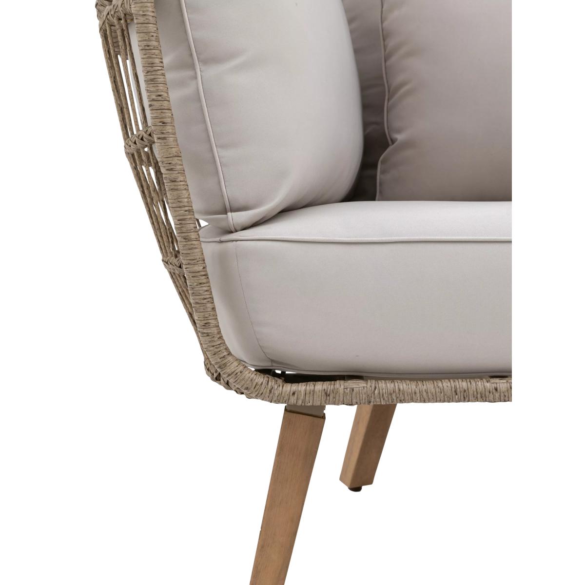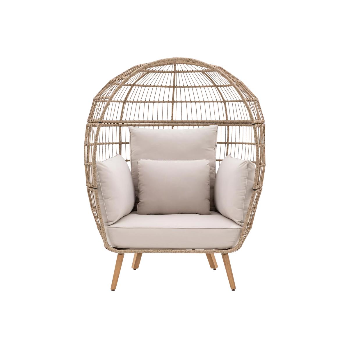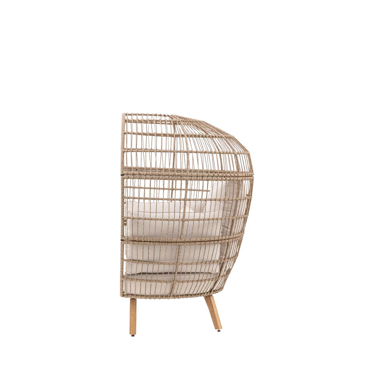 Indulge in ultimate relaxation with this luxurious and stylish egg chair. The woven rattan frame creates a cosy and private cocoon, while the plush seat and backrest cushions offer unparalleled comfort. The chair's elegant design and neutral colour palette make it a welcome addition to any outdoor space. Finished with beautiful angled acacia wood legs. Key features: Egg garden chair Robust woven polyrattan design on a steel frame Acacia wood legs Weather-resistant and easy to maintain Plush seat and backrest cushions are shower-resistant